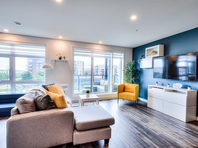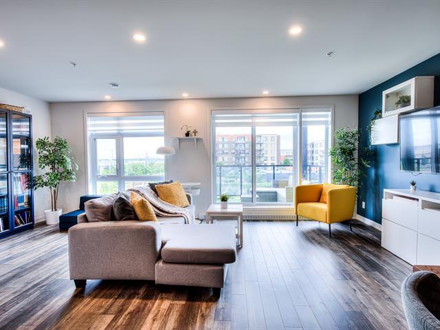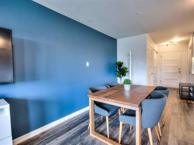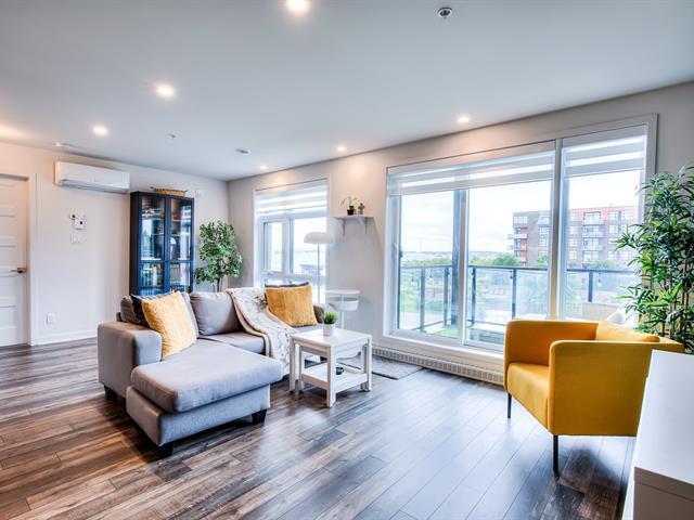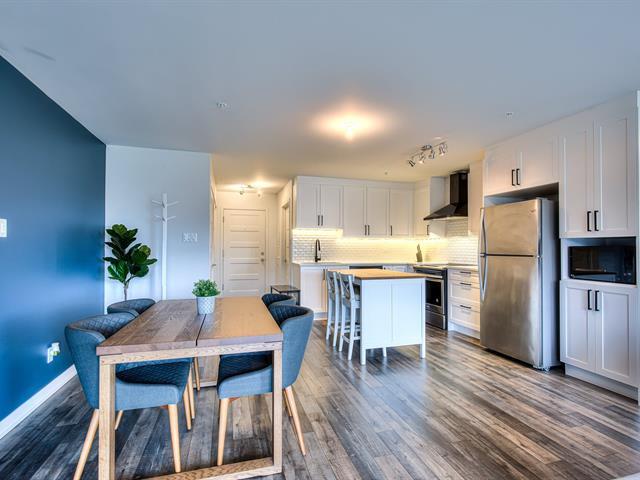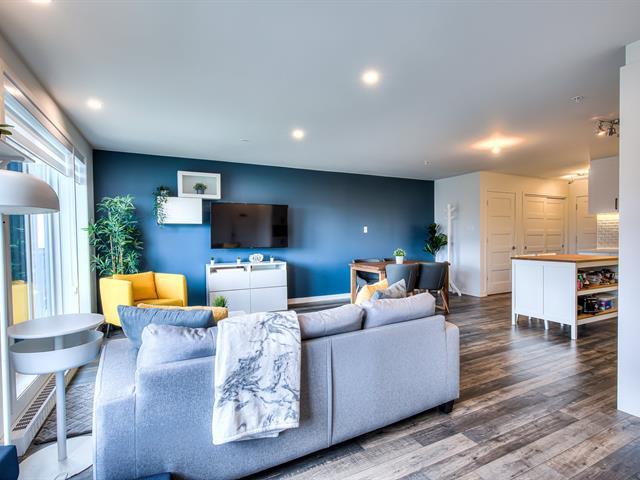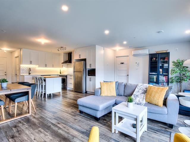 Welcome to this large, bright open-concept condo in Onze de la Gare. With concrete construction, this building offers superior soundproofing. The unit of 1 bedroom 1 bath, features a kitchen with quartz countertop and backsplash and polyester cabinets; the bathroom has a ceramic shower. Enjoy access to premium amenities including an elevator, an outdoor pool, a fully equipped gym, and an urban chalet - all accessible directly from the garage. Includes one outdoor parking space and an interior storage locker located near the garage. Close to many amenities including shopping and the Vaudreuil hospital currently under construction. (43504852)