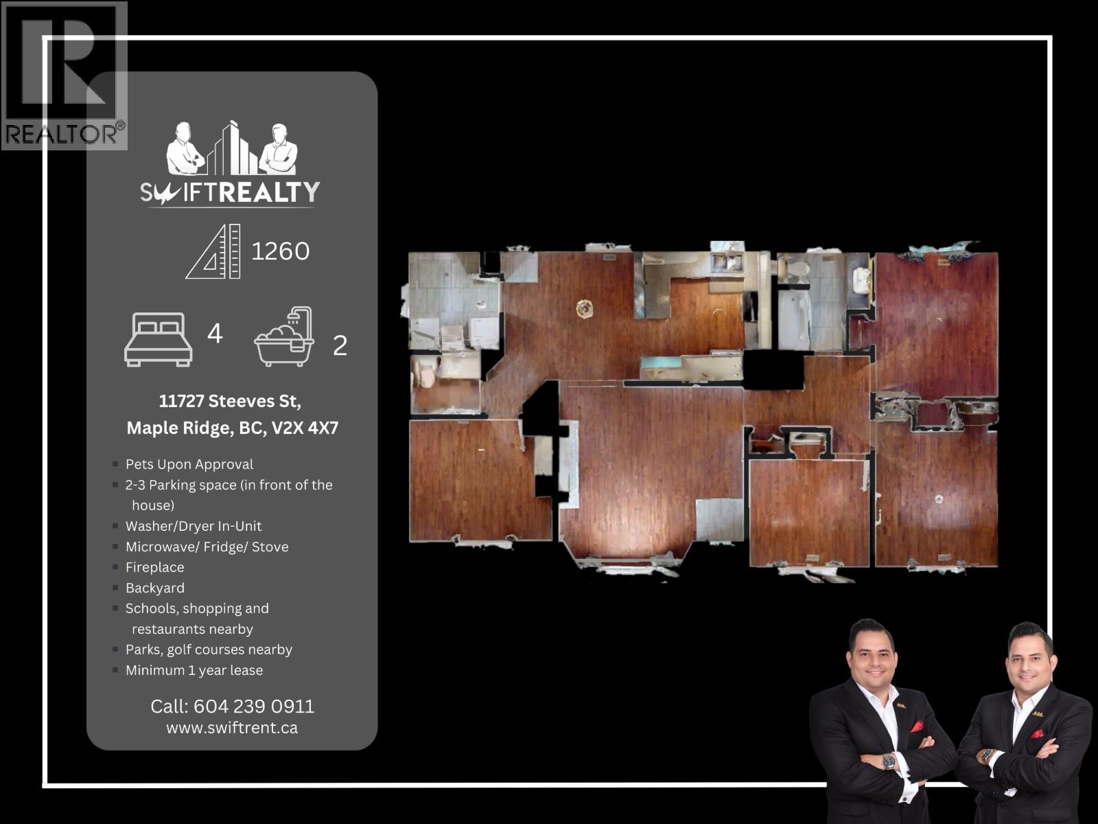 Welcome to Maple Ridge! This spacious 4 Bed, 2 Bath home offers the perfect balance of privacy and comfort in a family-friendly neighborhood. Featuring hardwood flooring, a cozy fireplace, and in-unit laundry, this home provides warmth and functionality for everyday living. The property includes washer/dryer, fridge, stove, microwave, and 2-3 parking spaces right in front of the house. A large backyard makes it ideal for outdoor living and entertaining, with pets welcome upon approval. LOCATION: Located just 2 minutes from public transit, this home offers easy access to schools, shopping, restaurants, family childcare, parks, golf courses, the West Coast Express, Golden Ears Bridge, and the local hospital. Min. 1 year lease. Text Mohammad 604-715-1270. (32465668)