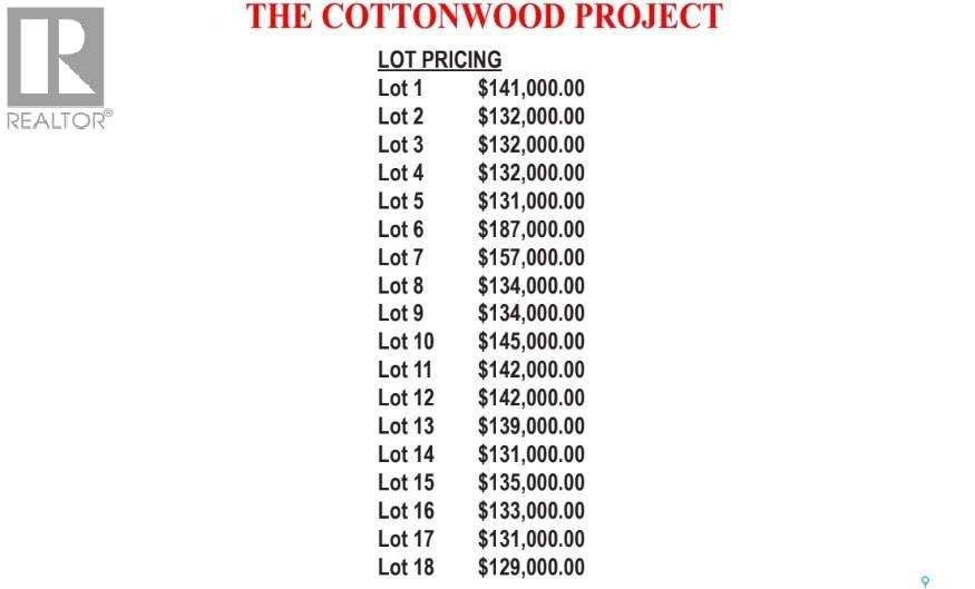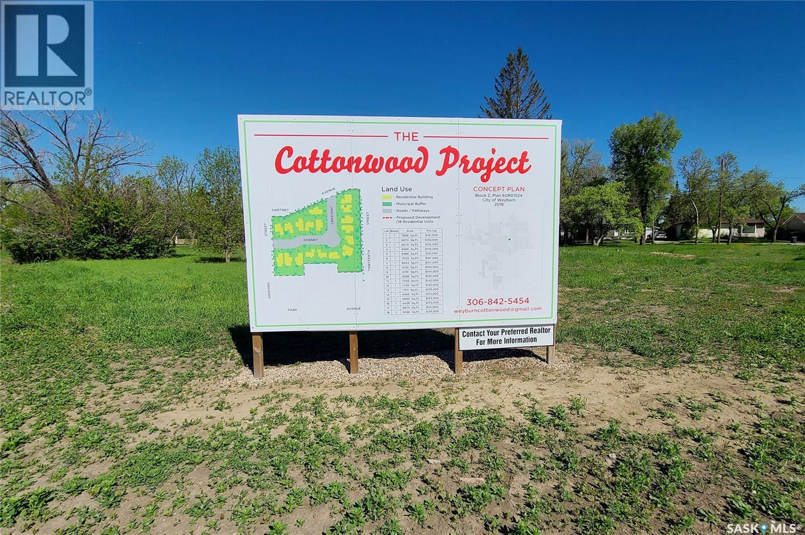 Welcome to Cottonwood Project — Weyburn's exciting, new residential neighborhood development! Nestled in a beautifully treed area in a developed residential location, the Cottonwood Project offers an opportunity previously unavailable in Weyburn - the chance to build your dream home among large, mature trees and be located within the heart of the city rather than restricted to a fringe area as with other residential lot developments. The Cottonwood Project is bordered by 13th St. on one side, Hartney Ave on another, and Ashford St. on the back. It is a cross from St. Michael School - Weyburn's only Catholic School (pre-K to Grade 9). Additionally, it is within easy walking distance to public schools, Jubilee Park( the central location for baseball, soccer,, tennis), the City leisure Centre and outdoor pool, and more. With a variety of sizes, there are lots for everyone. From pie-shaped lots, to elongated lots and standard rectangular options - you won't be disappointed. Kenney Crescent is a central L-Shaped road which services the neighborhood, creating that community feel. If you've been looking for that perfect place to build your family home but haven't been satisfied with the current options, check out the Cottonwood Project. (29403233)