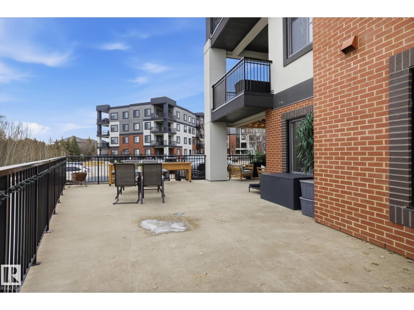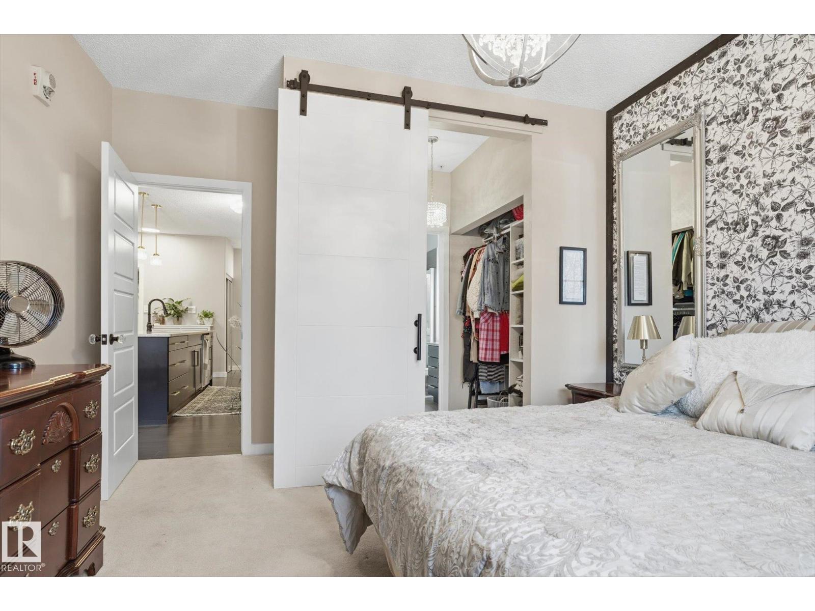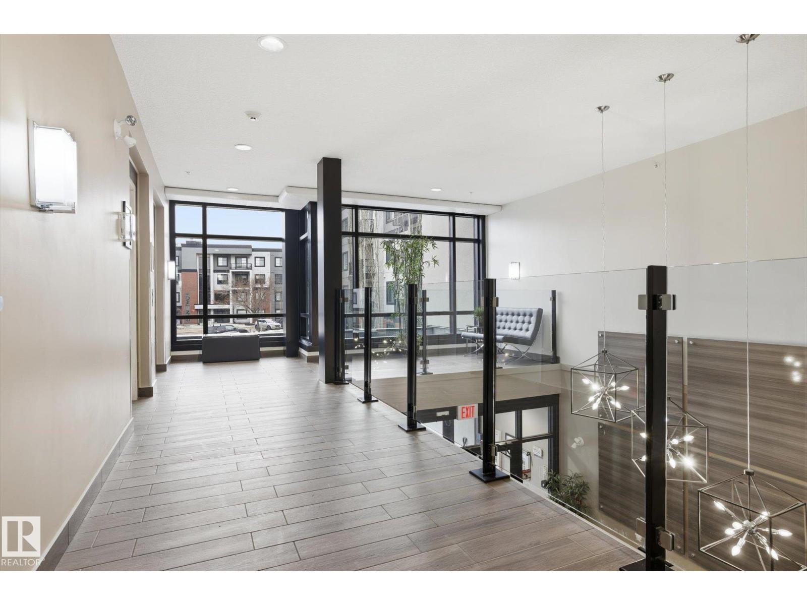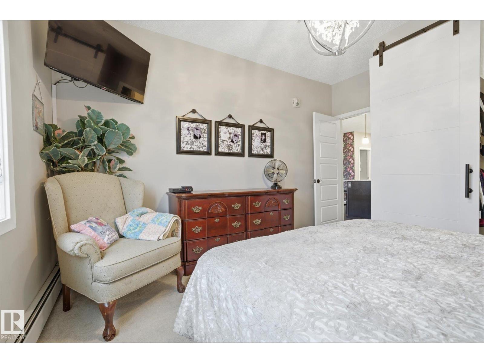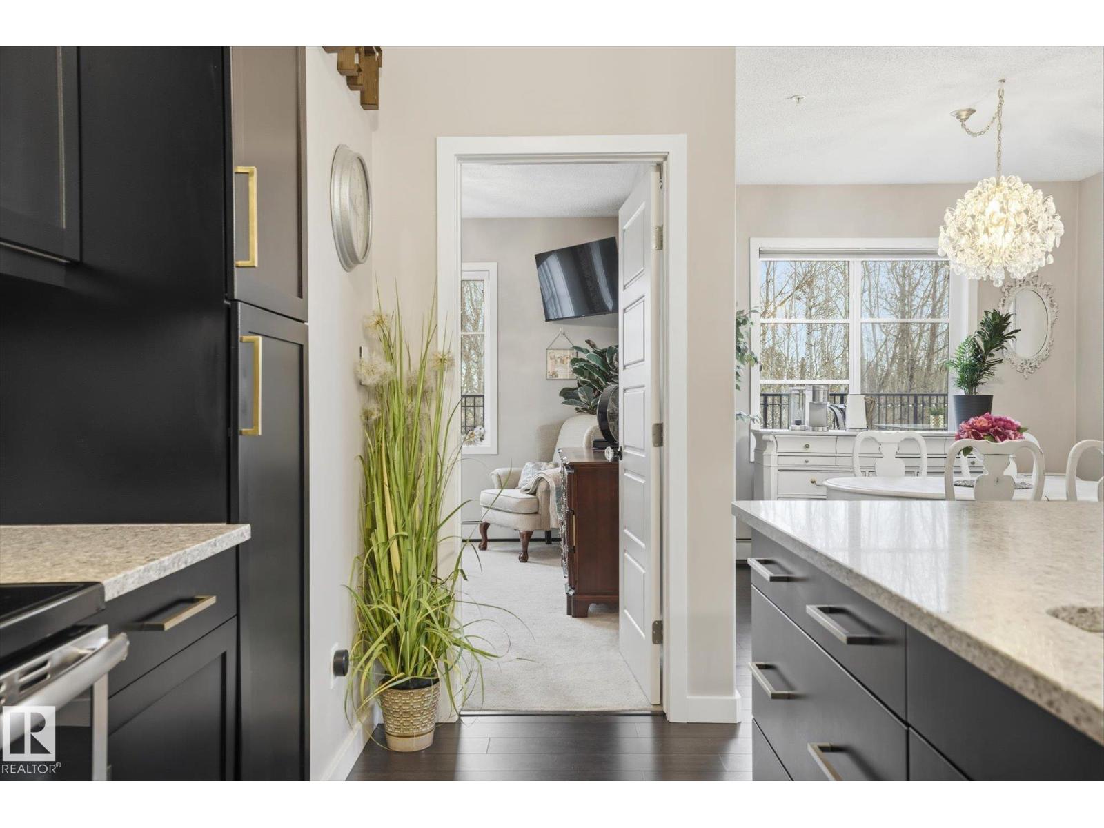 SHOWSTOPPER 1st FLOOR CORNER UNIT with RAVINE views and an underground parking stall! Welcome to Elan by Carrington Communities—an upscale condo backing onto peaceful green space. This 1,070 sq/ft unit features 2 spacious bedrooms, 2 full baths, in-suite laundry, and plenty of in-unit storage plus an additional storage locker. Natural light floods in through extra windows in this bright, open layout with 9' ceilings, stylish laminate and tile flooring, to-the-ceiling cabinets, upgraded stainless steel appliances, and a massive kitchen island. The primary suite impresses with a custom barn door to the walk-in closet and 3pce ensuite. Step onto your massive corner patio with a ravine views, covered area, a gas line for your BBQ and plenty of room to entertain. Amenities include a fitness centre, party room, boardroom, and visitor parking. Prime location near trails, schools, South Common, Anthony Henday, Hwy 2, Edmonton International Airport, shopping, & more. Don’t miss out! Exceptional value - a 10/10! (33850718)