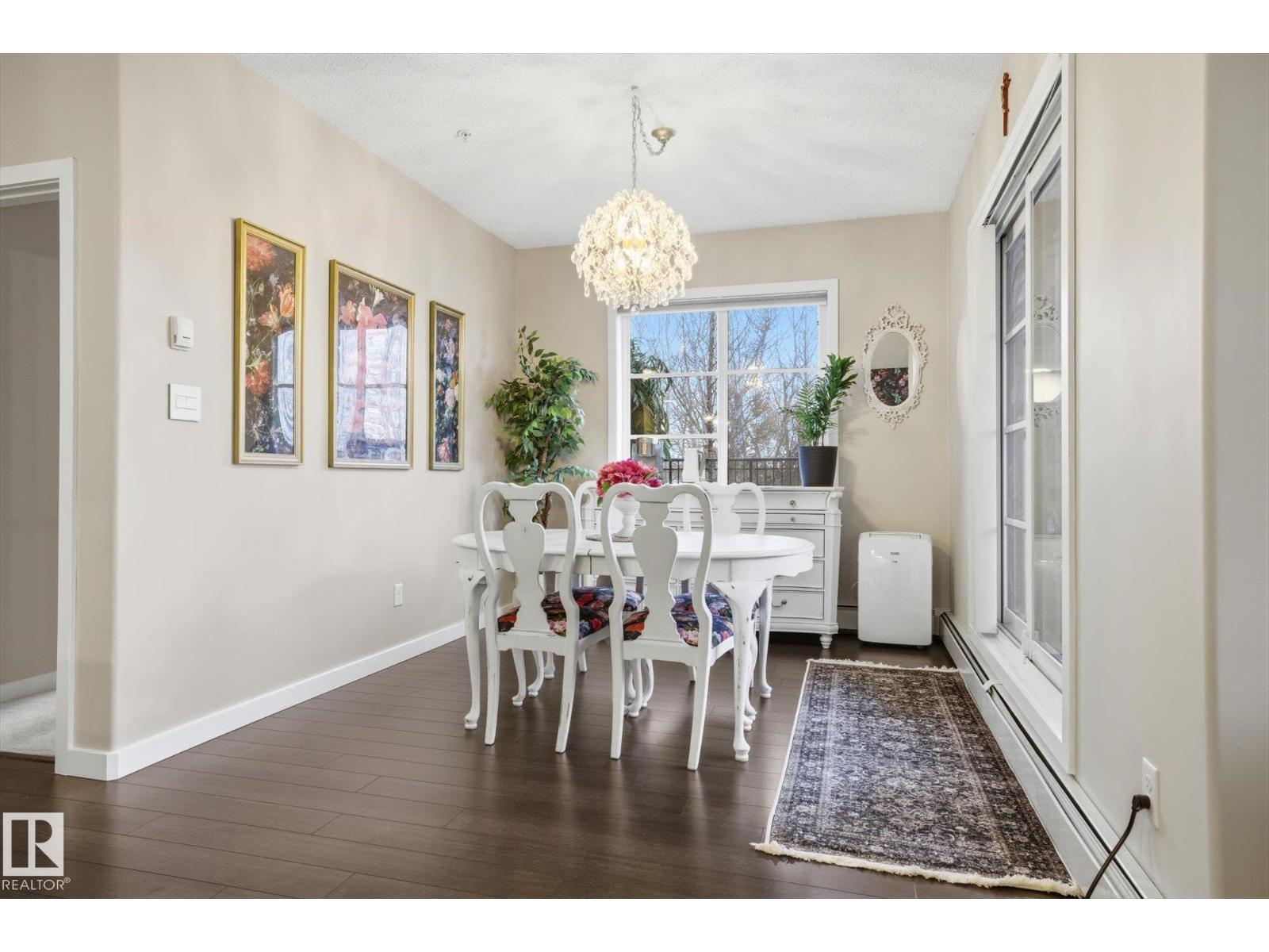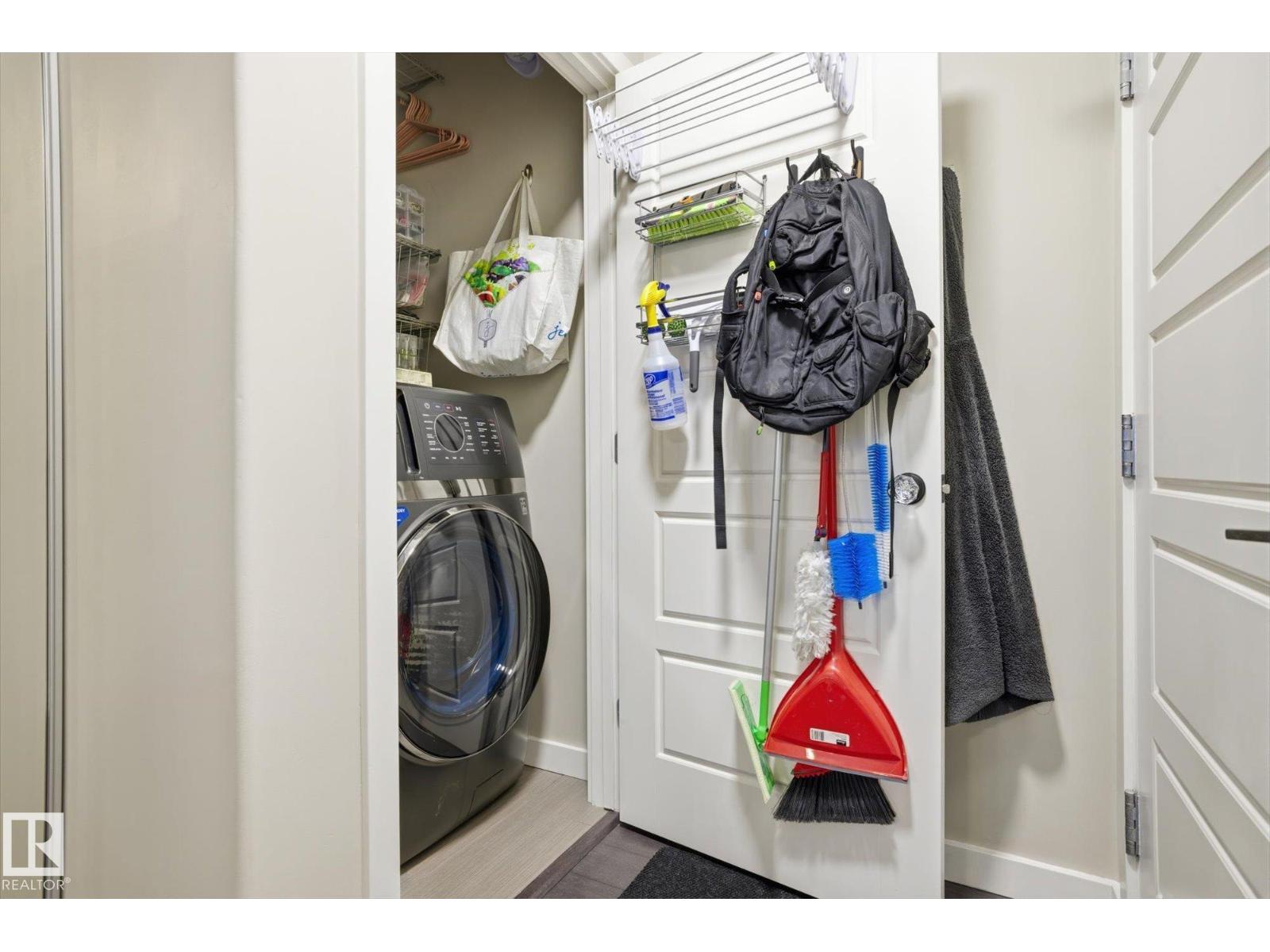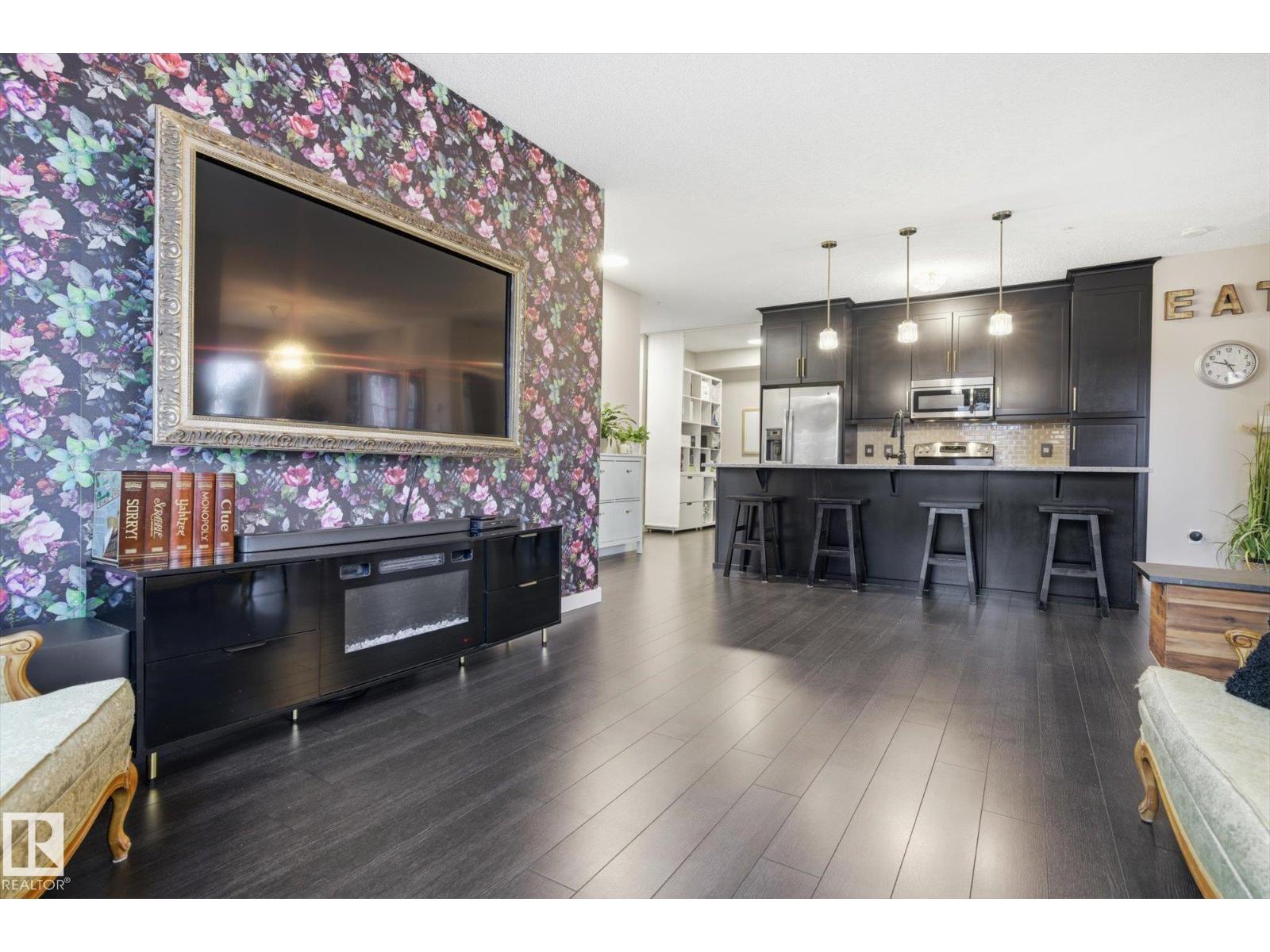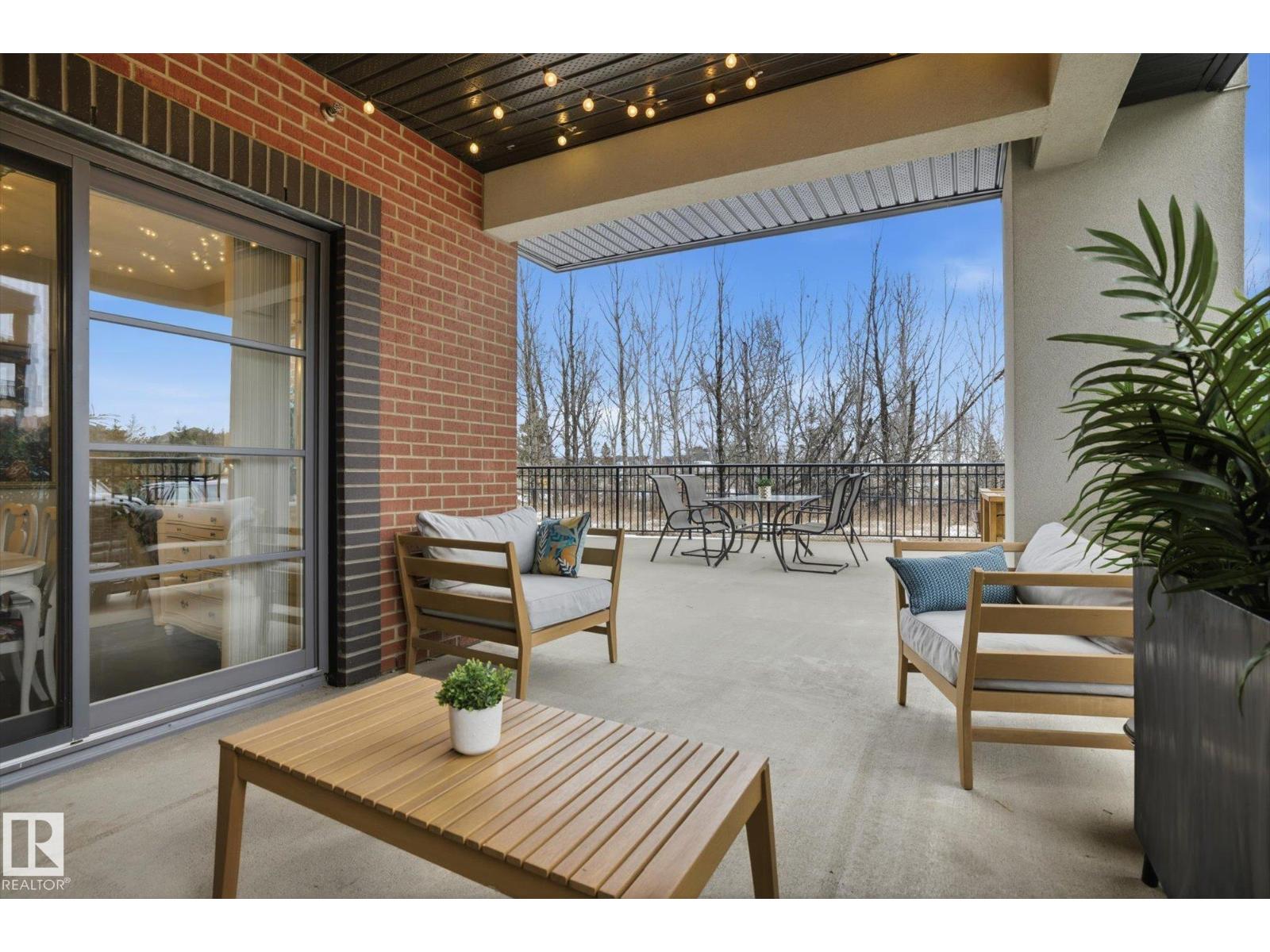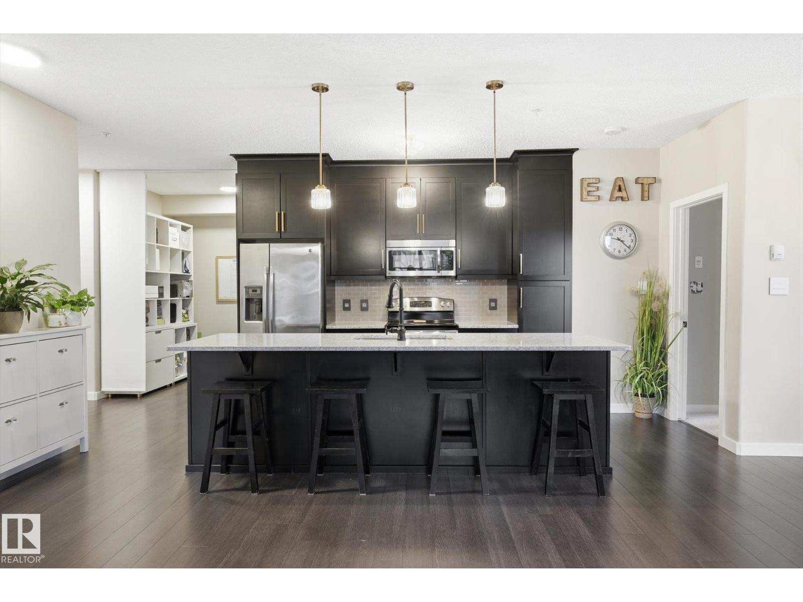 SHOWSTOPPER 1st FLOOR CORNER UNIT with RAVINE views and an underground parking stall! Welcome to Elan by Carrington Communities—an upscale condo backing onto peaceful green space. This 1,070 sq/ft unit features 2 spacious bedrooms, 2 full baths, in-suite laundry, and plenty of in-unit storage plus an additional storage locker. Natural light floods in through extra windows in this bright, open layout with 9' ceilings, stylish laminate and tile flooring, to-the-ceiling cabinets, upgraded stainless steel appliances, and a massive kitchen island. The primary suite impresses with a custom barn door to the walk-in closet and 3pce ensuite. Step onto your massive corner patio with a ravine views, covered area, a gas line for your BBQ and plenty of room to entertain. Amenities include a fitness centre, party room, boardroom, and visitor parking. Prime location near trails, schools, South Common, Anthony Henday, Hwy 2, Edmonton International Airport, shopping, & more. Don’t miss out! Exceptional value - a 10/10! (33850718)