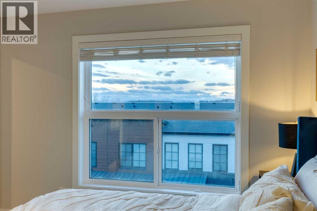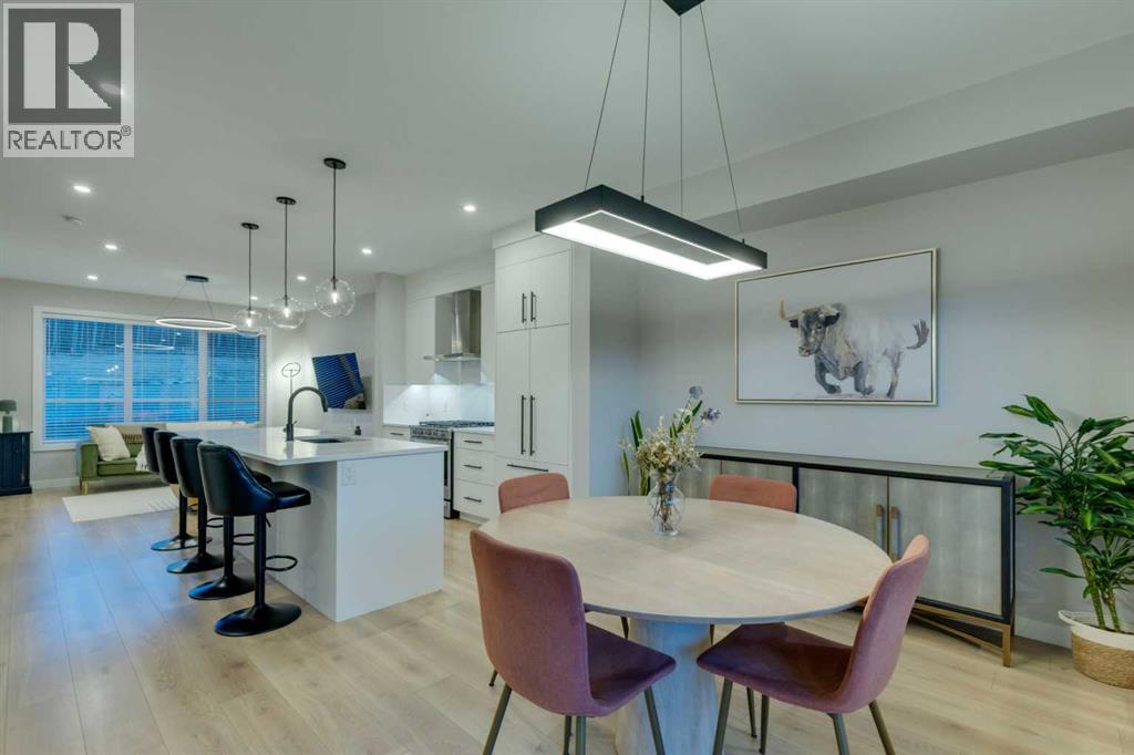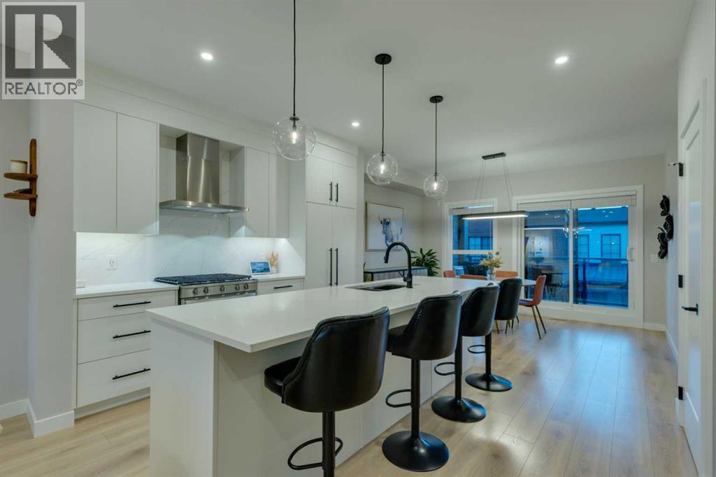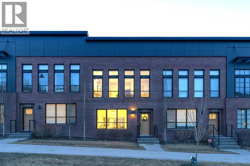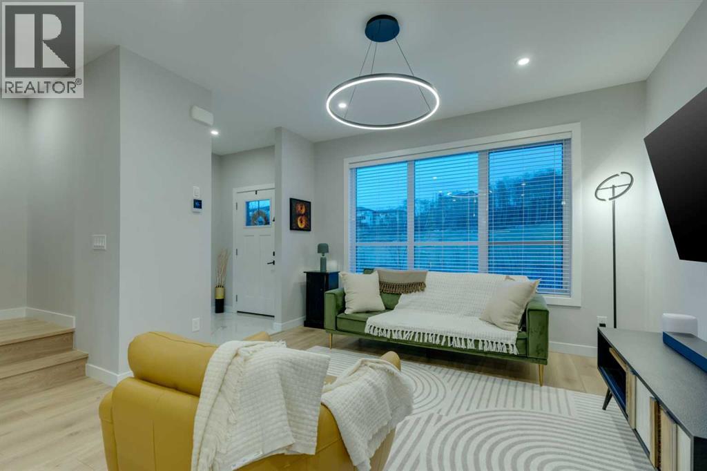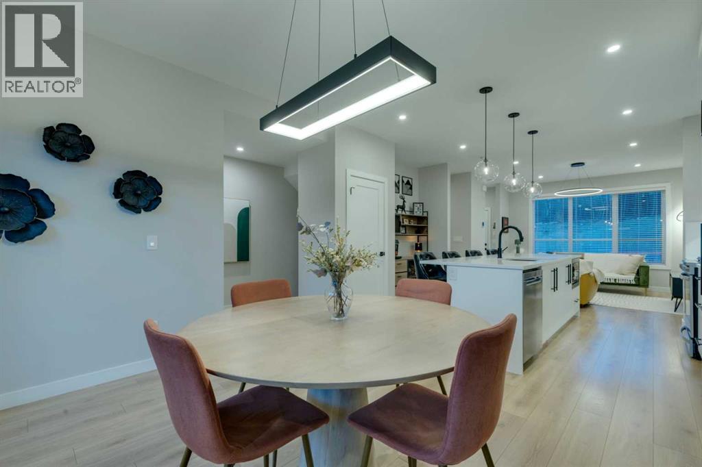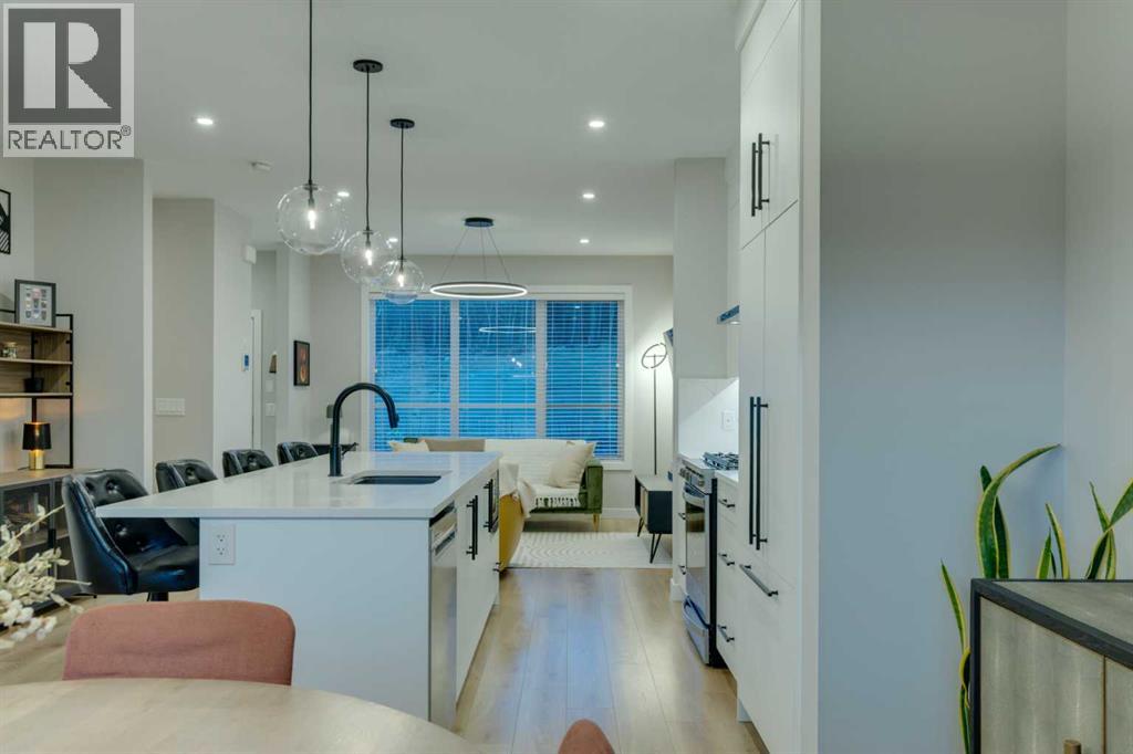 This beautifully designed 3-bedroom townhome blends modern style with warm, boho-inspired touches throughout. The focal brick facade leads to the welcoming entry with a bright foyer, mirrored closet, and clean white tile, before opening into a spacious main floor with soft, light luxury hardwood laminate flooring and sleek black accents. 9ft flat panel ceilings with recessed led lighting allow for ample front to back natural light. The living room sits to the left, while the central kitchen offers white cabinetry, under-cabinet lighting, a long flush top granite island with seating for four, a black modern sink, pendant lighting, gas range, and a built-in panelled fridge for a seamless designer look. To the right, the dining area features contemporary LED lighting and patio doors leading to a balcony with stunning sunset skies and a peaceful treed view to the side. A discrete, stylish half bath finishes the main level and provides lower access to the double width, TRIPLE attached garage(tandem depth on one side). Upstairs, the primary bedroom captures beautiful light and mountain views above the rooftops, with a gorgeous tray ceiling, a walk-in closet and a modern ensuite featuring white finishes, black fixtures, and a fully tiled walk-in shower. Two additional bedrooms with peaked ceilings & full windows offer versatility, including a charming nursery with a soft woodland mural, and the other with a flexible Murphy bed, all centered with a lovely 4-piece bathroom, upper laundry, and space in the hallway for an accent table or open tech area. Offering central A/C, an incredible accessible location near the C-Train station(s), and many desirable schools nearby, along with the excellent premier shops in Aspen Landing, this home offers enduring value and ideal location. With its thoughtful design, absolutely immaculate condition, and twilight views that make every evening feel special, this home delivers a perfect blend of comfort, style, and convenience. Even convenie nt shopping is nearby. This like-new townhome offers a fresh, modern lifestyle with a welcoming sense of personality from the moment you step through the front door. Offered in pristine move-in ready condition with flexible possession. Make sure to watch the video! Welcome home! (31662941)