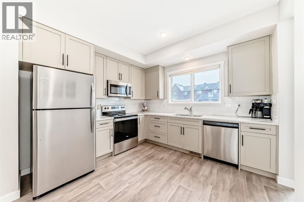 **OPEN HOUSE SUNDAY, MARCH 1ST, 12PM - 3PM** CHARMING TOWNHOME | PROFESSIONALLY FINISHED BASEMENT | GREAT LOCATION | NO CONDO FEES | Welcome to this charming 4 bedroom townhome…well maintained, featuring an open-concept floorplan, vinyl plank flooring throughout the main level and is bright with an abundance of natural light! The foyer offers a walk-in closet…ideal for keeping your personal & seasonal items organized. The living room blends perfectly into the spacious dining area, creating a wonderful space for entertaining with family & friends! The open kitchen, large enough for a moveable island, showcases designer cabinetry in a modern neutral shade, elegant white quartz countertop & stainless steel appliances…including a brand new stove! The rear foyer has additional storage, a pantry closet, & access to the private fenced yard. Completing this main level is a 2pc powder room. Upstairs you will find a Master bedroom, spacious enough for a king size bed and offers a walk-in closet and 3pc ensuite with oversized shower. There are 2 additional bedrooms, a main bathroom with linen storage…plus convenient upper laundry! Professionally finished by the builder, the lower level is fantastic…enjoy game day or your favourite movie on a big screen in the family room; there is also a generous sized 4th bedroom, full bathroom, plus additional storage! This home is nicely located on a quiet street with a private backyard…fully fenced and landscaped with patio & BBQ gas-line! There is back alley access with a parking pad for 2 vehicles, plus the roof is new (replaced in 2025). Ideally located with quick & easy access, just a short walk to nearby shops, services & walking around the pond! (31666212)