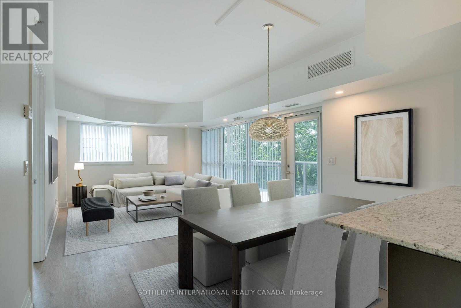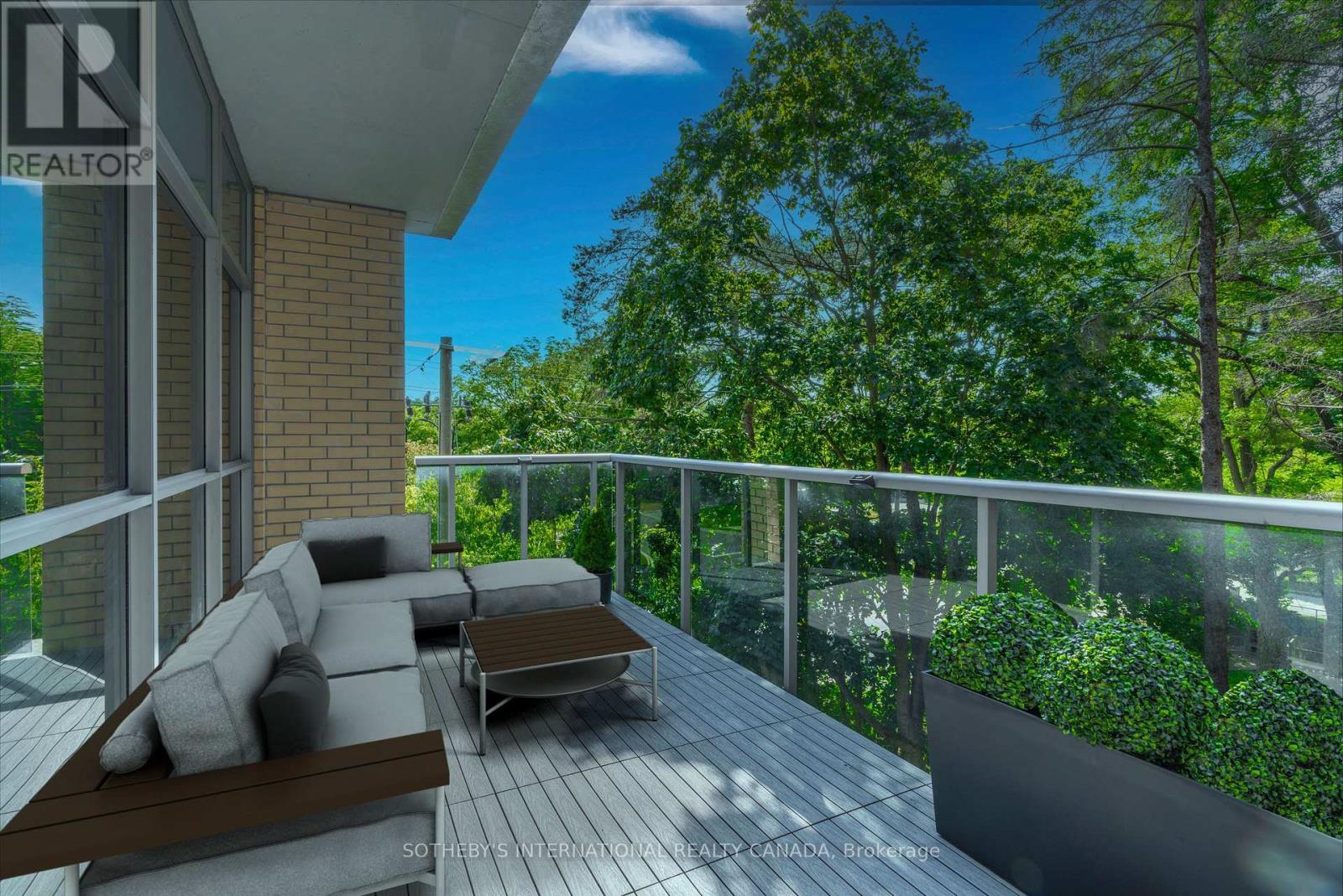 Sunny, contemporary two-bedroom corner residence offering exceptional indoor-outdoor living. This beautifully maintained condo boasts a rare, south-facing 315 sq ft oversized terrace featuring NewTechWood decking, a gas BBQ, built-in cushion storage, planters, and tranquil treed views - the perfect private retreat for relaxing or cultivating flowers or vegetables. The recently updated interior showcases wide-plank white oak LV flooring, pot lighting, professionally painted throughout; elegant Restoration Hardware lighting, closet organizers and custom drapery. The thoughtfully designed split-bedroom floor plan offers ideal privacy and functionality. The primary suite comes complete with floor-to-ceiling windows, an ensuite bathroom and walk-in closet space. The second bedroom has floor-to-ceiling windows, a deep double closet and across the hall from a 4-pc bathroom. The kitchen includes a newer stainless steel refrigerator and a breakfast bar. The unit is equipped with a full-sized washer and dryer. Tandem two-car parking is included close to the unit locker. Situated in a quiet, well-maintained building, this turnkey unit is a rare find in the area and is ready to enjoy this spring. **Furniture is virtually staged - unit contains the tenant's furniture at present.** (42182101)