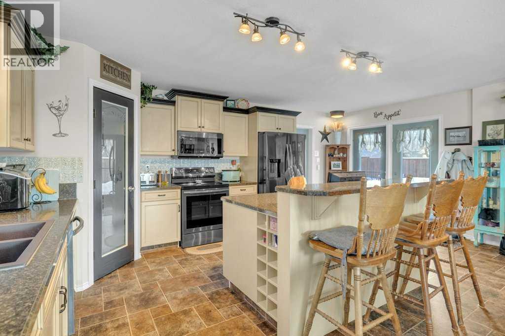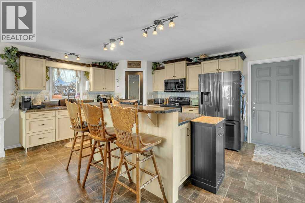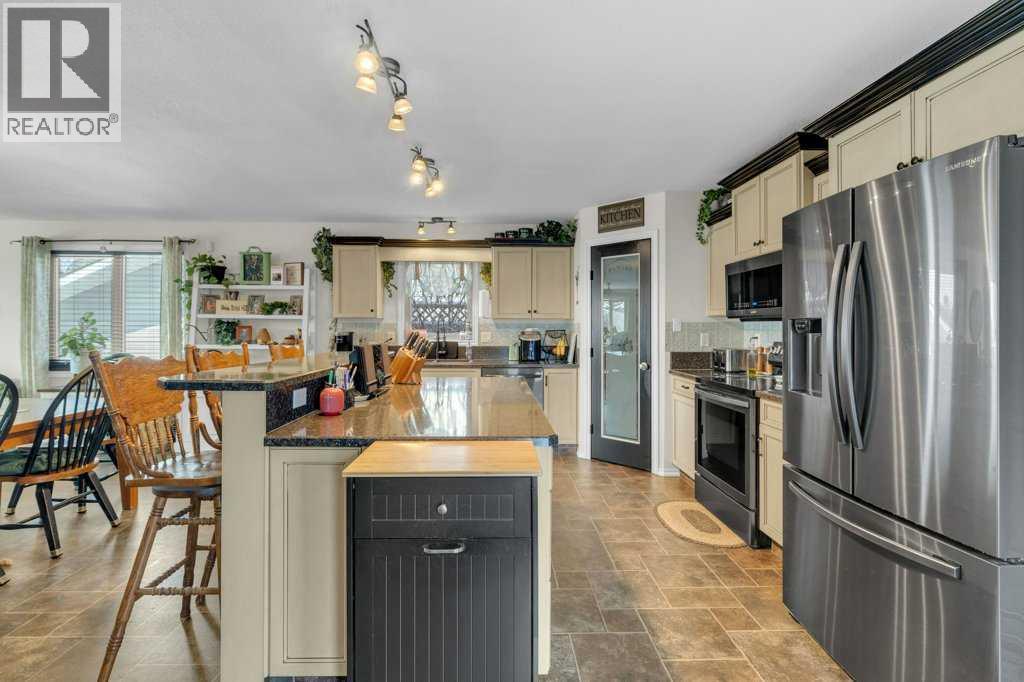 Ideally situated within walking distance to shopping, baseball diamonds, walking trails, playgrounds and a dog park, this home offers over 3000 sq' of living in both comfort and convenience. Thoughtfully updated, it features a large addition completed in 2012 and newer shingles (house – 5 years; garage – 2 years), ensuring peace of mind for years to come. The main floor boasts a spacious open-concept kitchen, dining, and living area — perfect for gathering with family and friends. You’ll also find main-floor laundry, a bedroom, a 4-piece bathroom, and a primary suite complete with its own private ensuite. The kitchen is designed to impress with abundant cabinetry, a pantry, a large island, and direct access to the attached garage — making grocery runs effortless, no matter the weather. Step out from the kitchen onto the large backyard deck, ideal for summer barbecues and relaxing evenings.The fully fenced yard features a privacy fence and convenient RV access/parking. Downstairs offers even more living space, including a cozy family room, two additional bedrooms, and a spacious 5-piece bathroom with a luxurious soaker tub. Storage is plentiful throughout the home — from extra garage space (hello, Costco runs!) to numerous cupboards, closets, and dedicated storage rooms downstairs.Living in Rimbey means enjoying a broad range of amenities including a hospital, racetrack, community centre, swimming pool, schools, indoor riding arena, and nearby lakes — all while being an easy commute to Red Deer and other larger centres.Lovingly cared for and move-in ready, this home is waiting for its next family to make it their own. (31668461)