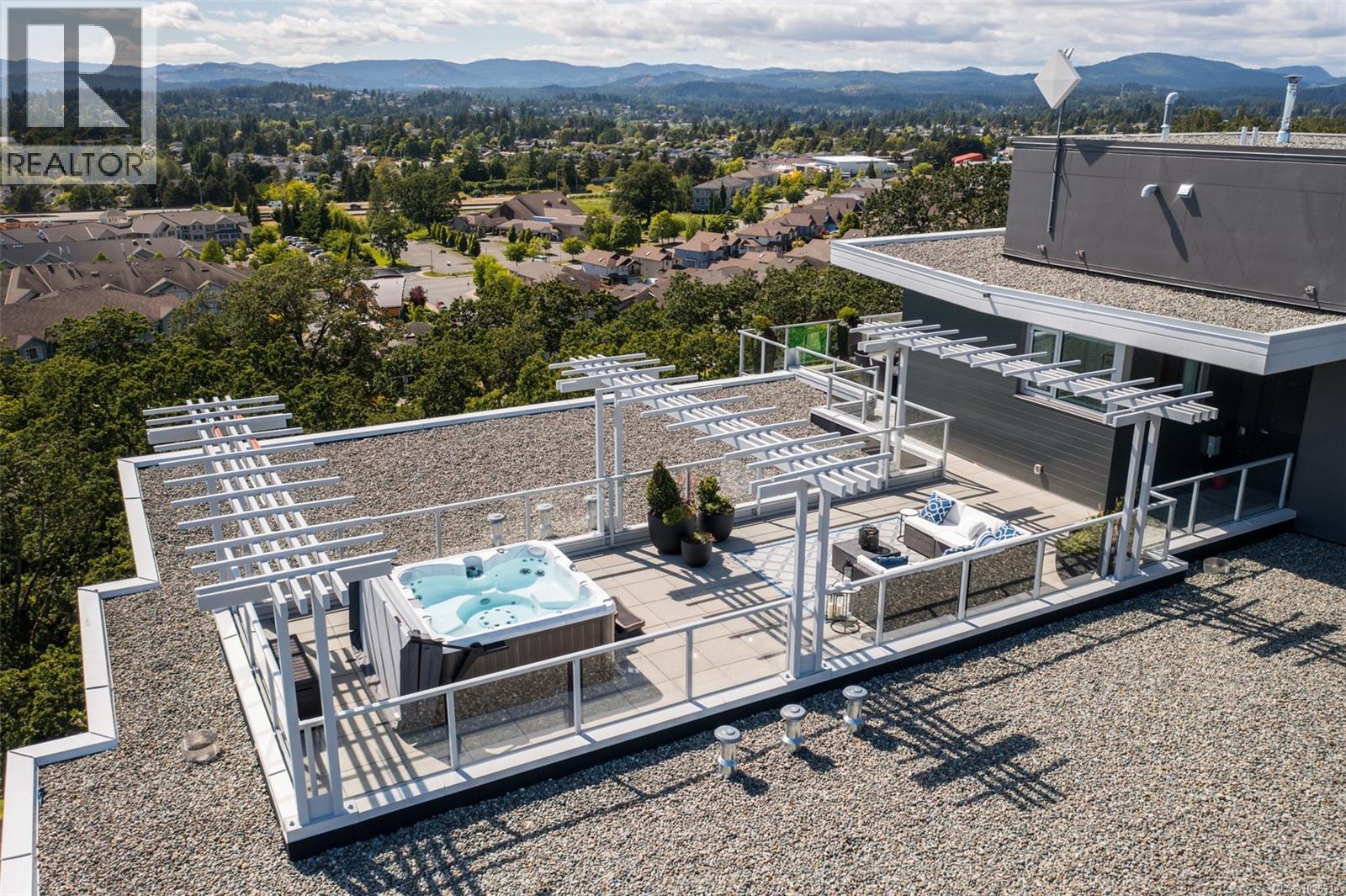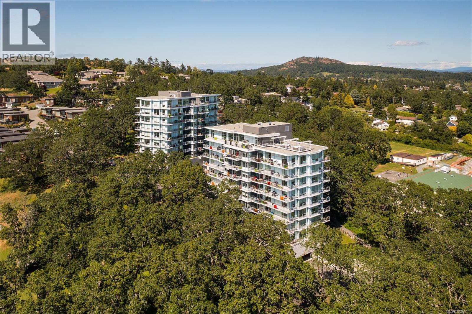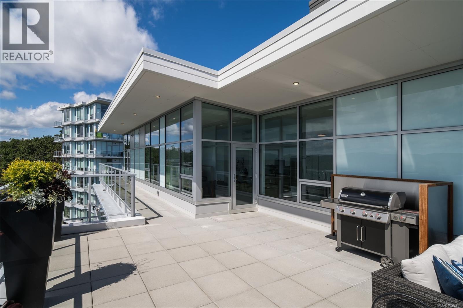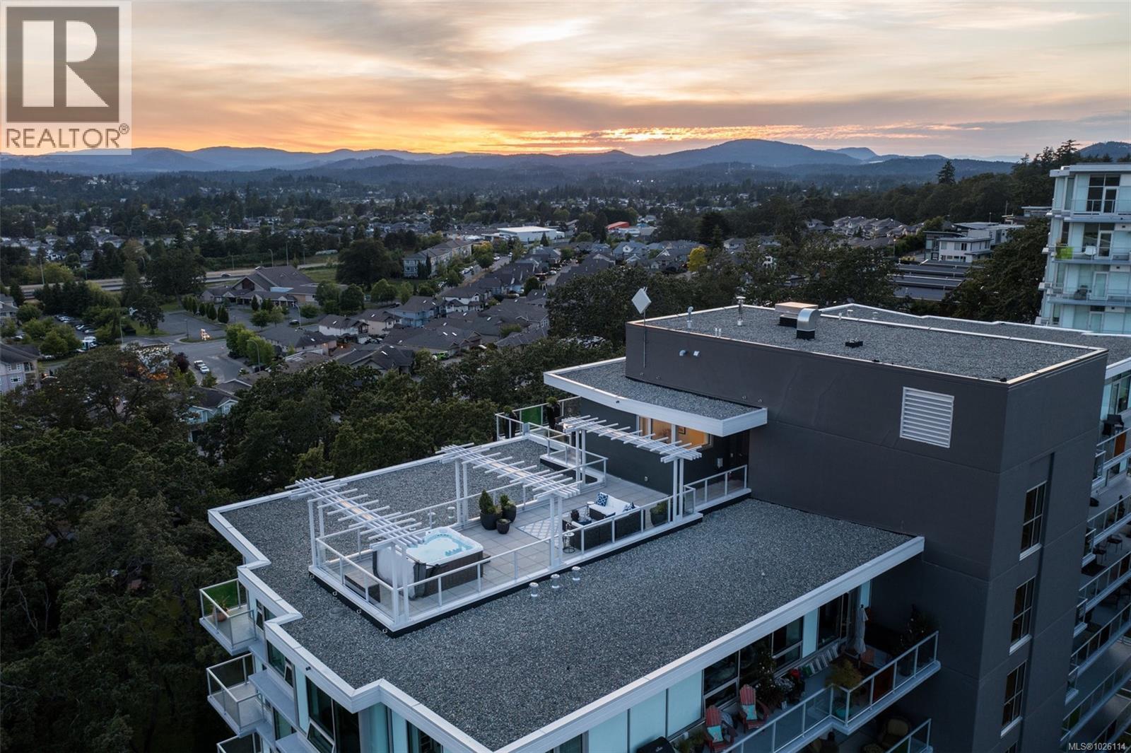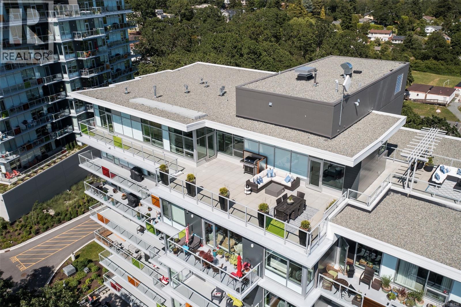 A Rare Penthouse Offering. The premier residence in this steel and concrete development and one of only two on its floor, this home is truly without equal. Nearly 1,600 sq.ft. of private terraces showcase 300° views from downtown Victoria to the Sooke Hills and Olympic Mountains. Inside, 1,568 sq.ft. of light-filled space features vaulted ceilings, expansive windows, built-in valences and heat pumps found only in penthouse homes. A split-bedroom layout ensures privacy, each with a deluxe ensuite, while most rooms enjoy private outlooks. The kitchen highlights include quartz surfaces, premium cabinetry and a huge island, flowing to an open living and dining room with a gas fireplace as a focal point. Outdoor living is unrivalled with an oversized balcony which includes a hot tub, three lighted arbours and a fire pit to create a retreat unmatched by any other unit. Two parking stalls closest to the elevator plus an oversized storage room add convenience. Pets are welcome too! Just 20 minutes from Sidney or downtown Victoria, with access to the Lochside and Galloping Goose trails. (30407726)