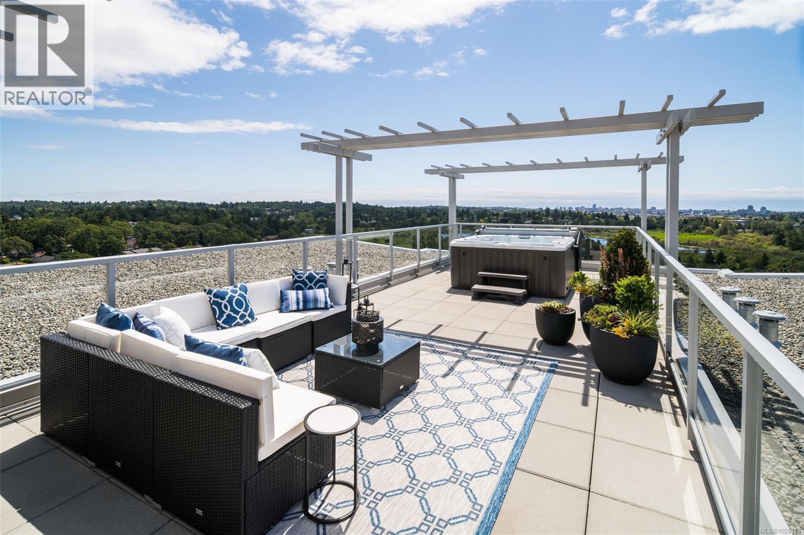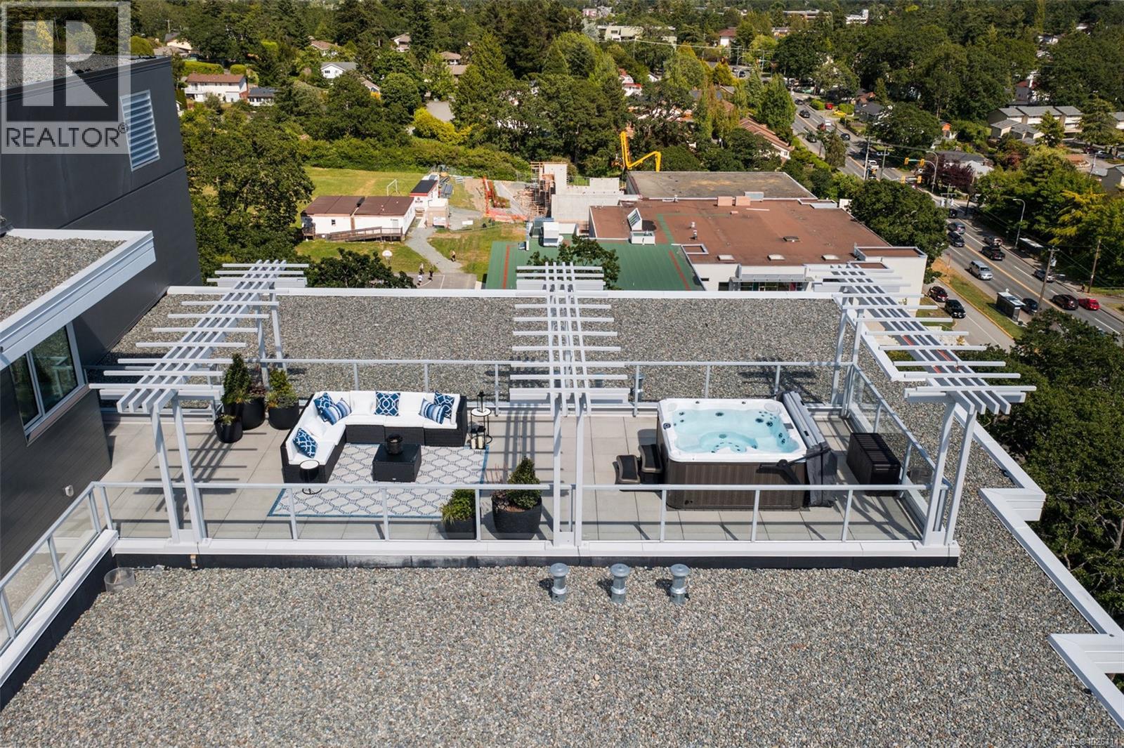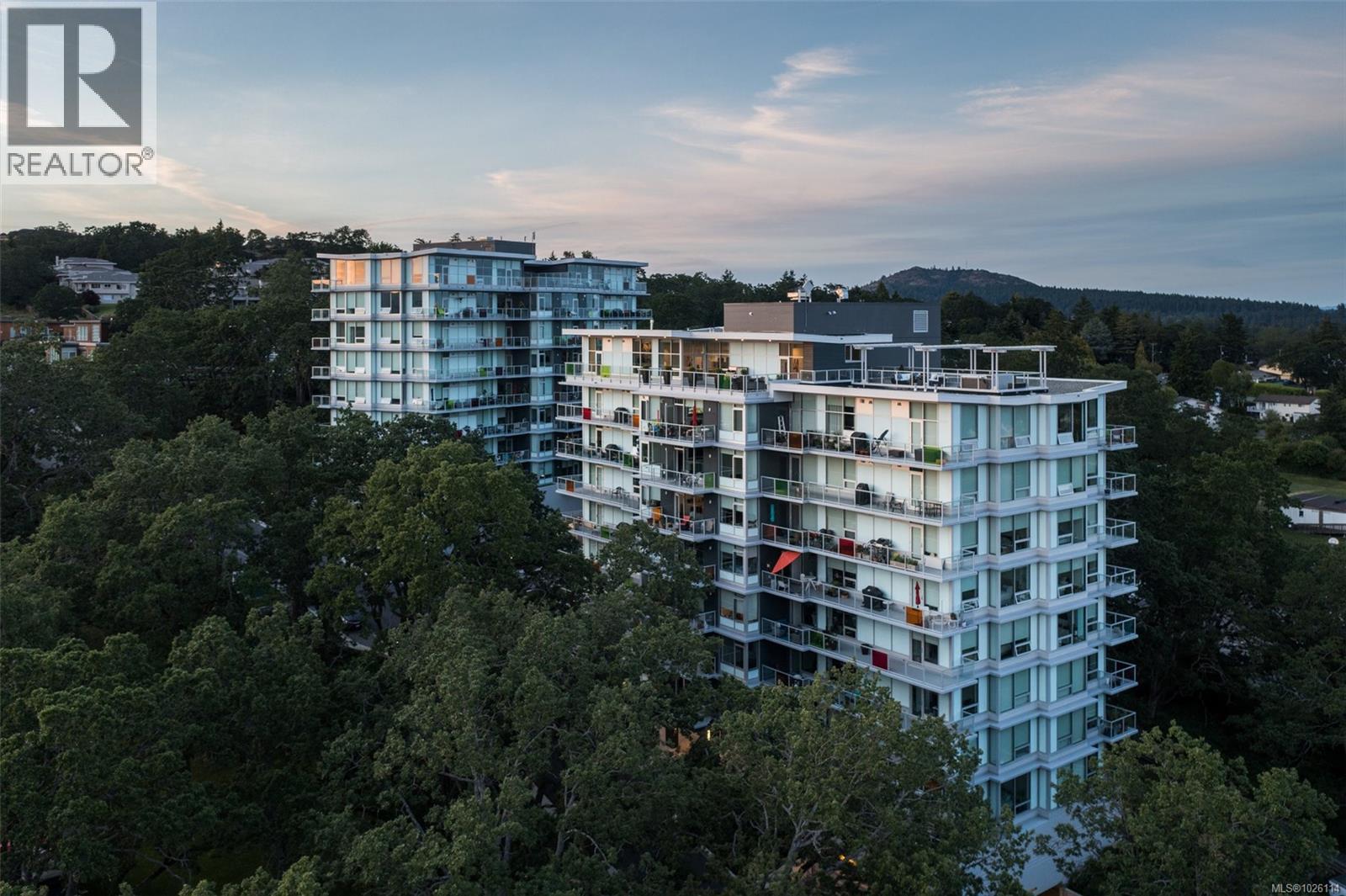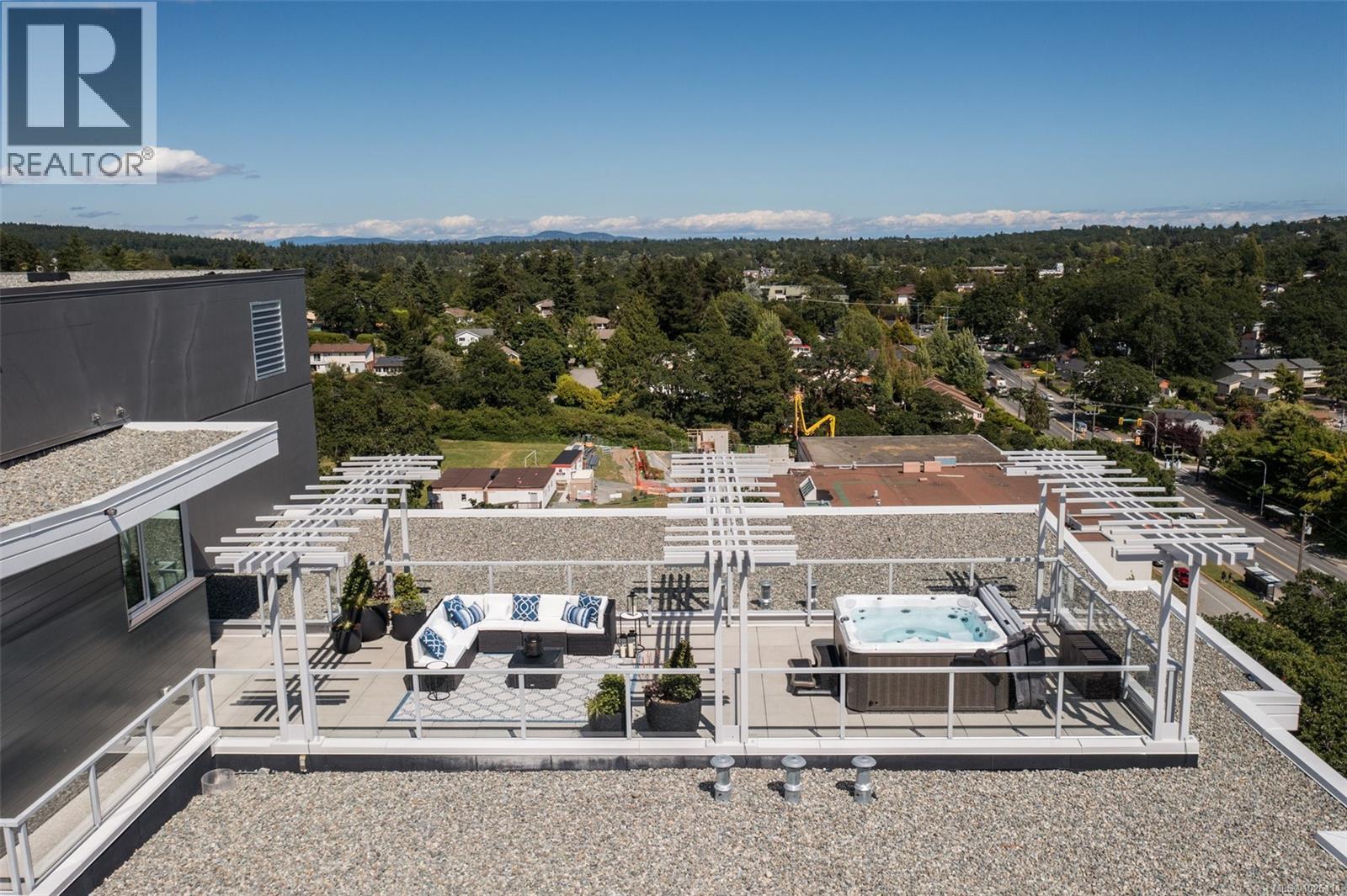 A Rare Penthouse Offering. The premier residence in this steel and concrete development and one of only two on its floor, this home is truly without equal. Nearly 1,600 sq.ft. of private terraces showcase 300° views from downtown Victoria to the Sooke Hills and Olympic Mountains. Inside, 1,568 sq.ft. of light-filled space features vaulted ceilings, expansive windows, built-in valences and heat pumps found only in penthouse homes. A split-bedroom layout ensures privacy, each with a deluxe ensuite, while most rooms enjoy private outlooks. The kitchen highlights include quartz surfaces, premium cabinetry and a huge island, flowing to an open living and dining room with a gas fireplace as a focal point. Outdoor living is unrivalled with an oversized balcony which includes a hot tub, three lighted arbours and a fire pit to create a retreat unmatched by any other unit. Two parking stalls closest to the elevator plus an oversized storage room add convenience. Pets are welcome too! Just 20 minutes from Sidney or downtown Victoria, with access to the Lochside and Galloping Goose trails. (30407726)