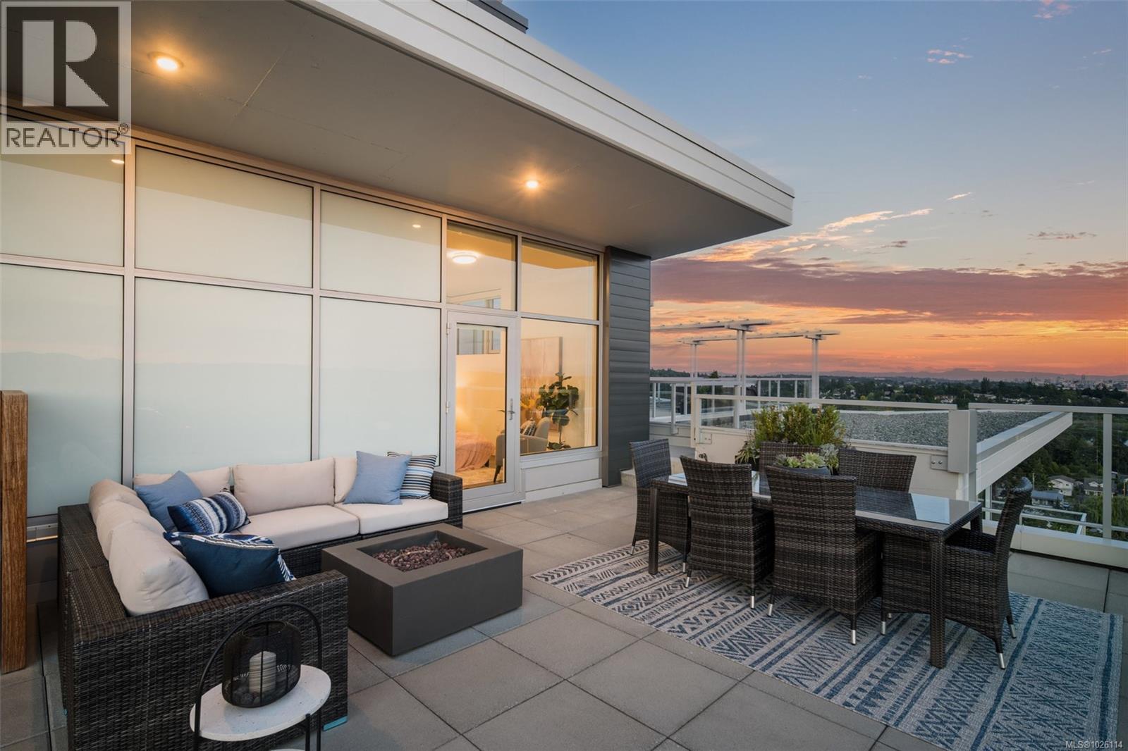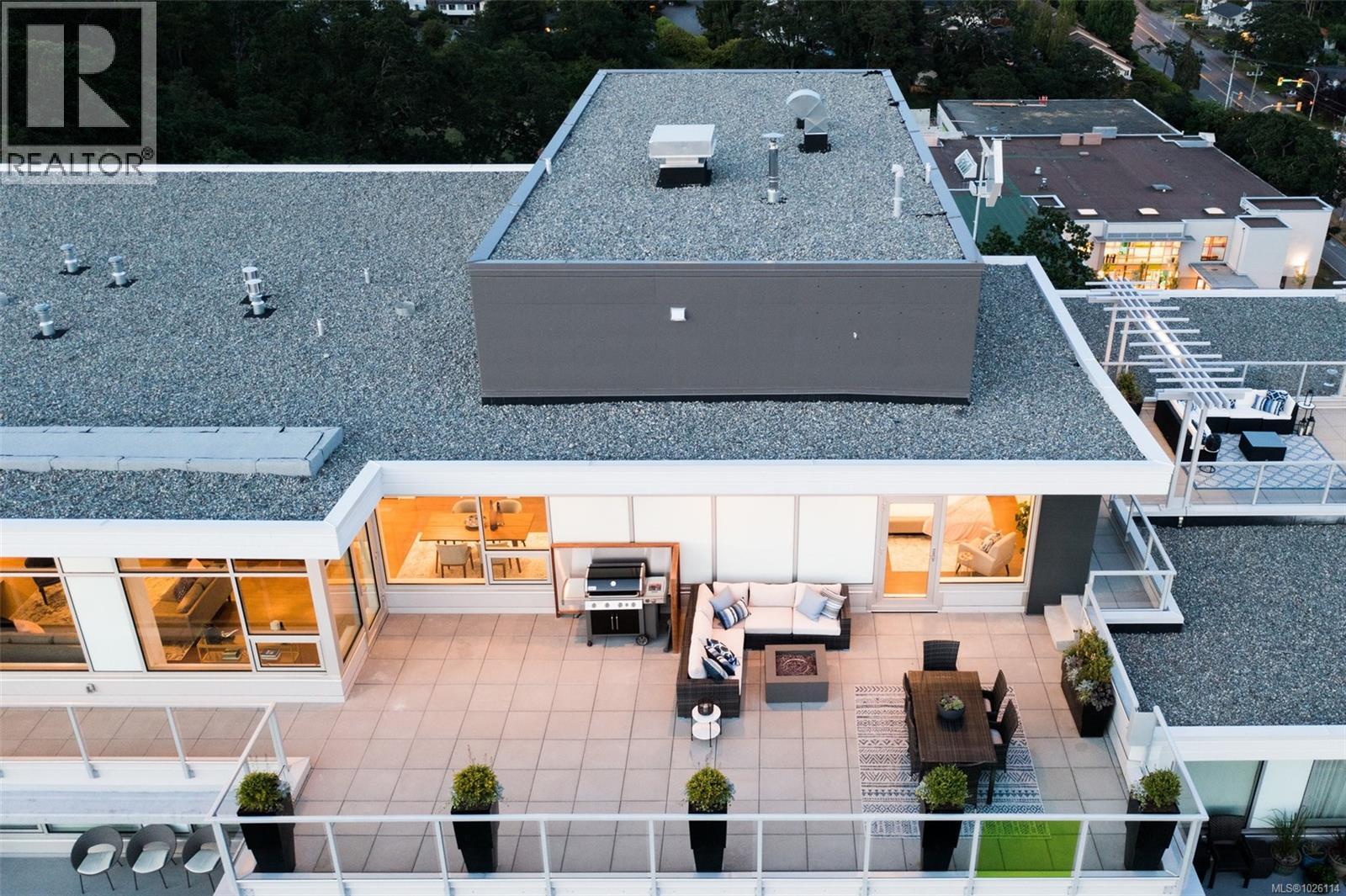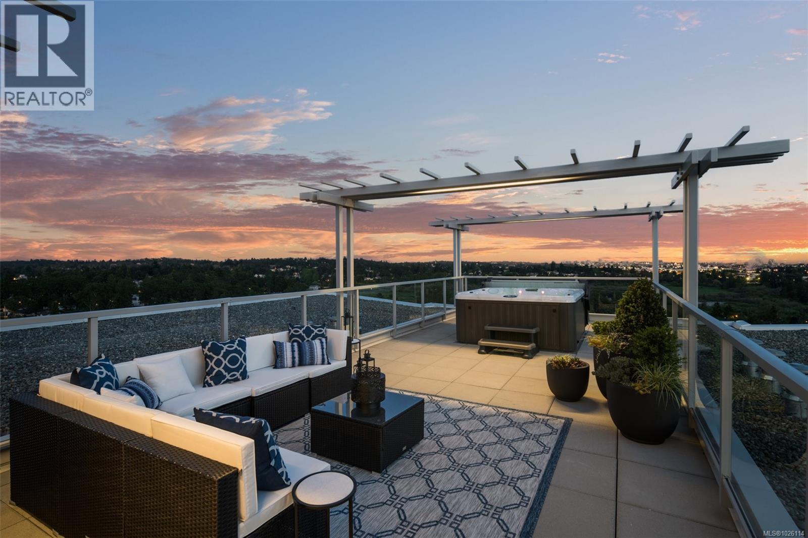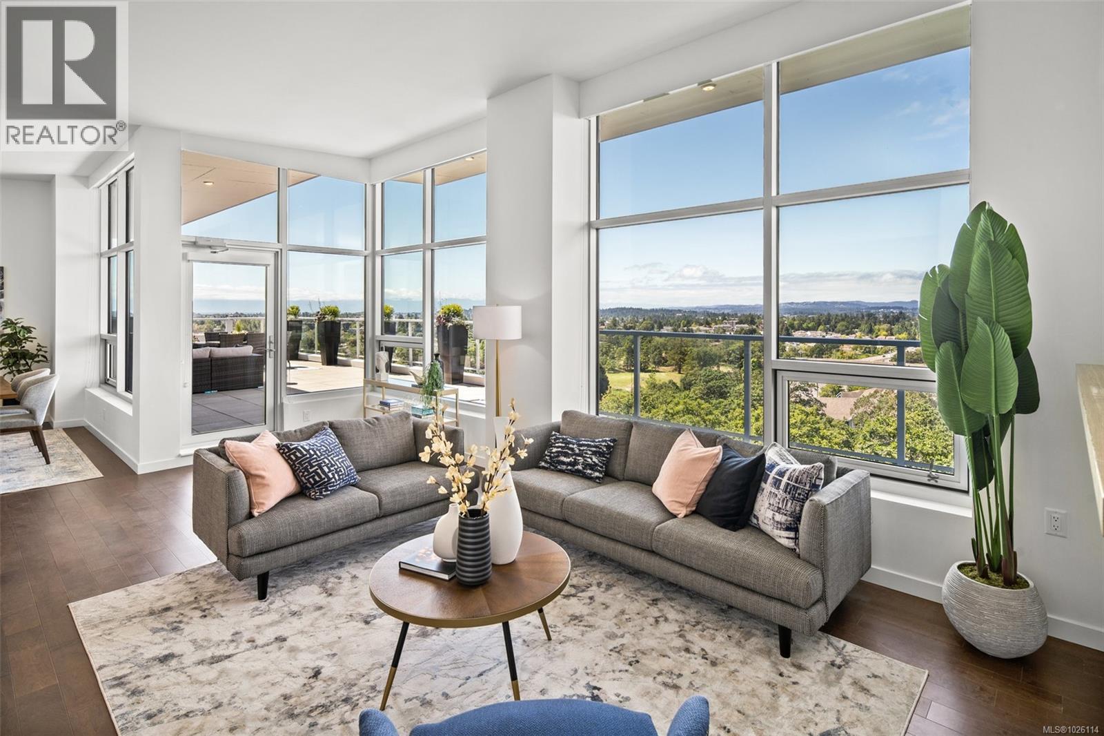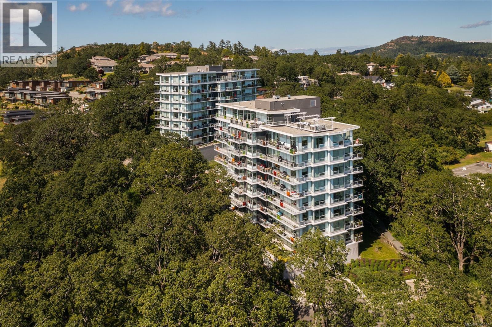 A Rare Penthouse Offering. The premier residence in this steel and concrete development and one of only two on its floor, this home is truly without equal. Nearly 1,600 sq.ft. of private terraces showcase 300° views from downtown Victoria to the Sooke Hills and Olympic Mountains. Inside, 1,568 sq.ft. of light-filled space features vaulted ceilings, expansive windows, built-in valences and heat pumps found only in penthouse homes. A split-bedroom layout ensures privacy, each with a deluxe ensuite, while most rooms enjoy private outlooks. The kitchen highlights include quartz surfaces, premium cabinetry and a huge island, flowing to an open living and dining room with a gas fireplace as a focal point. Outdoor living is unrivalled with an oversized balcony which includes a hot tub, three lighted arbours and a fire pit to create a retreat unmatched by any other unit. Two parking stalls closest to the elevator plus an oversized storage room add convenience. Pets are welcome too! Just 20 minutes from Sidney or downtown Victoria, with access to the Lochside and Galloping Goose trails. (30407726)