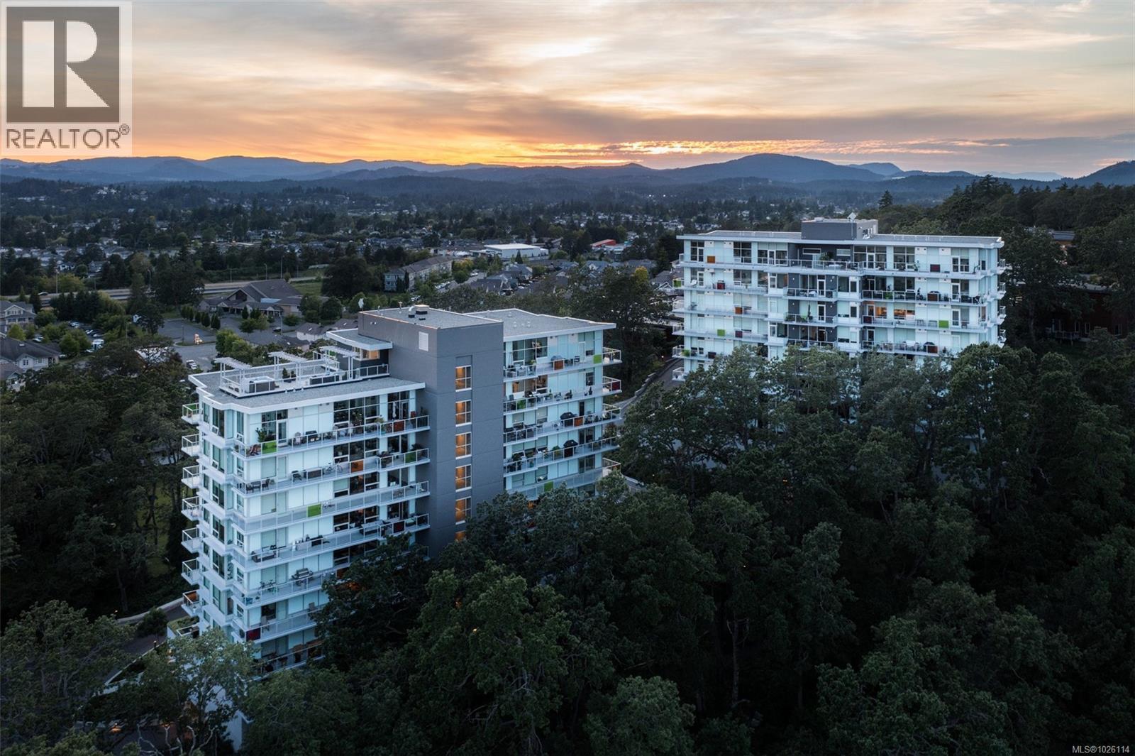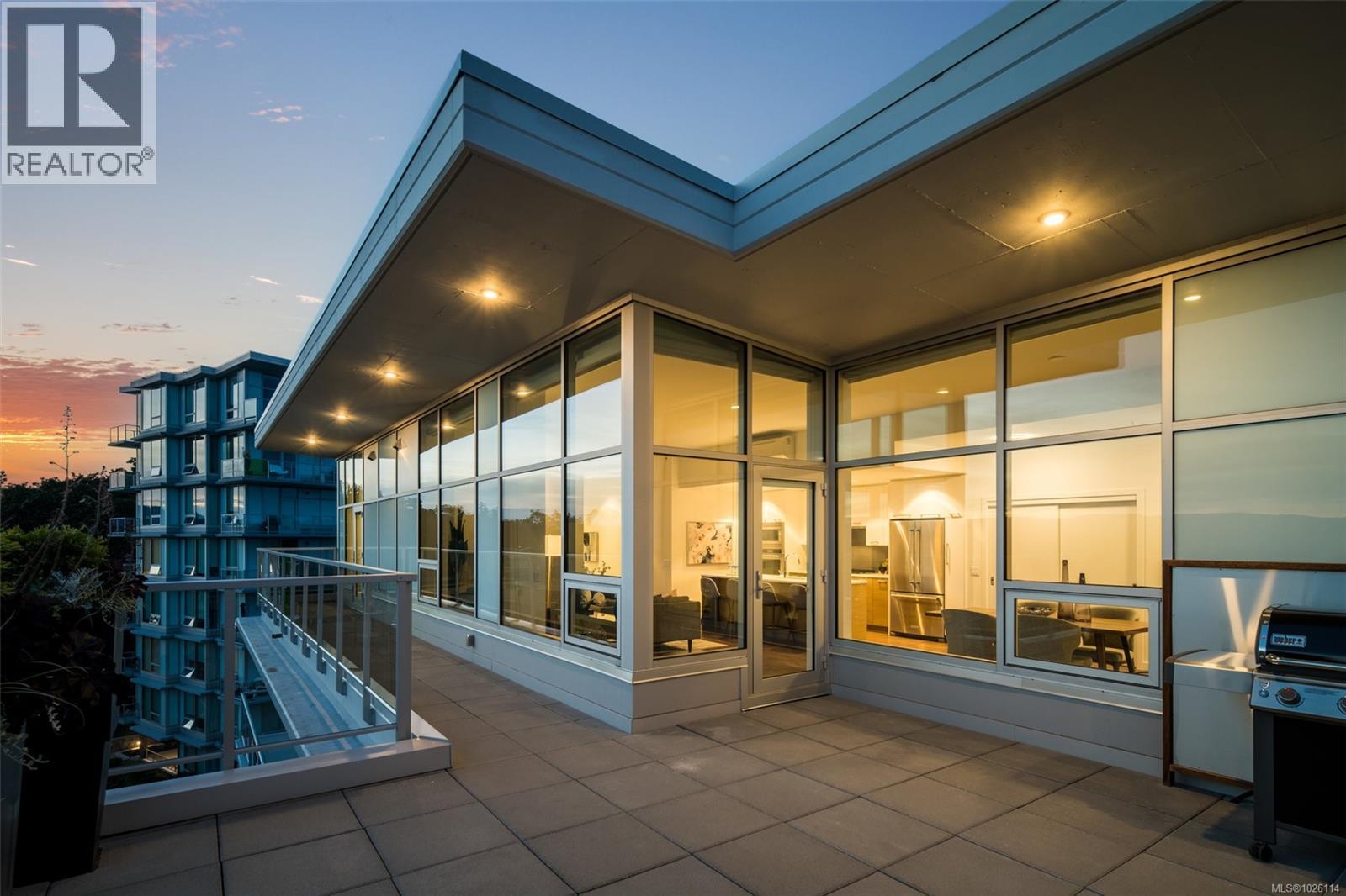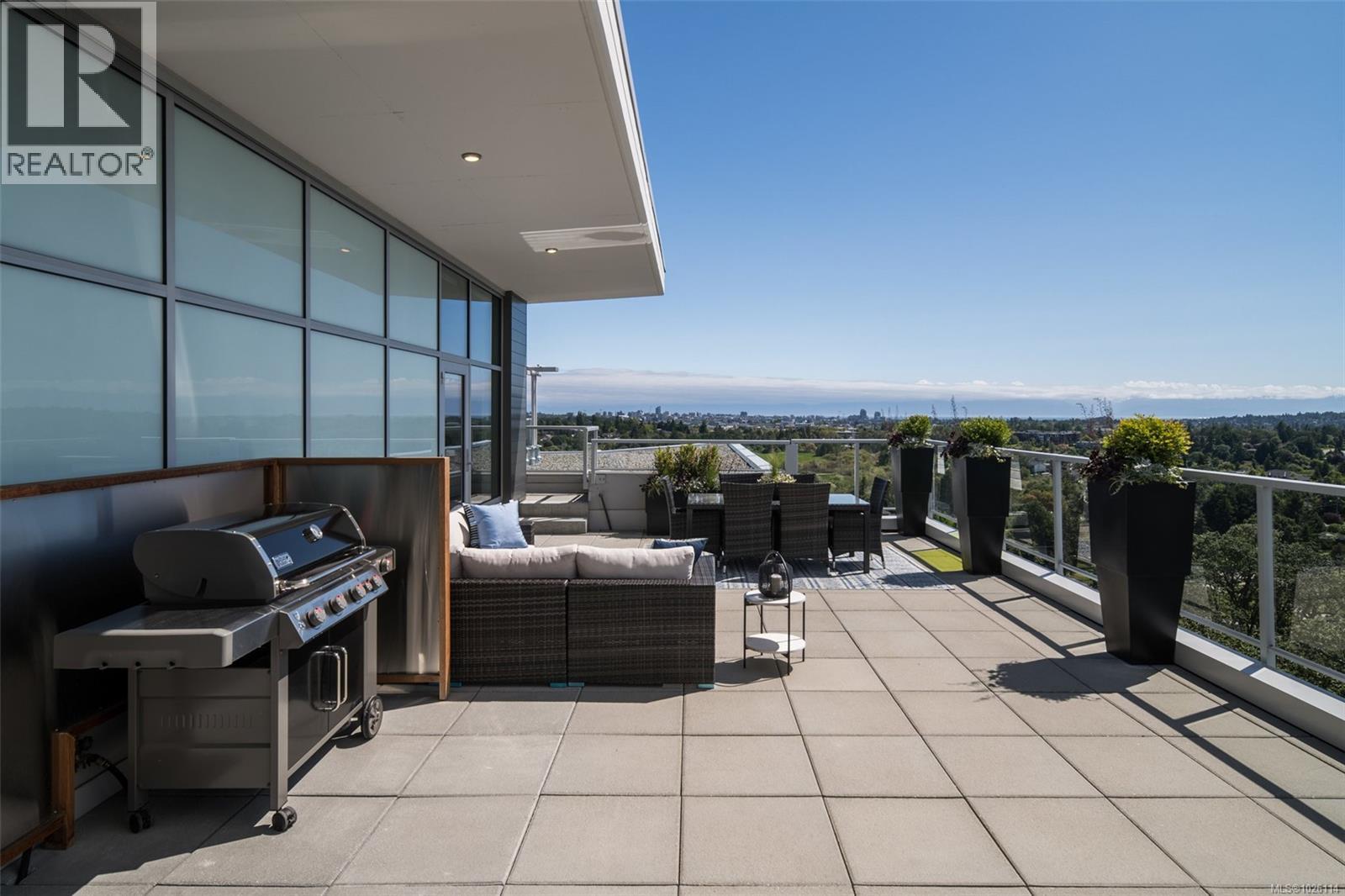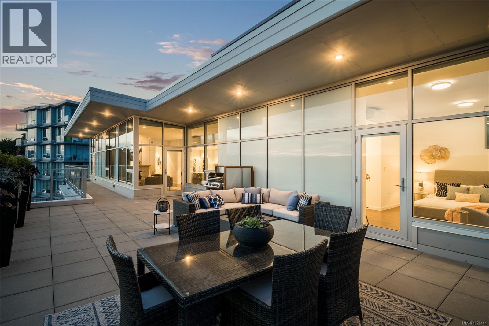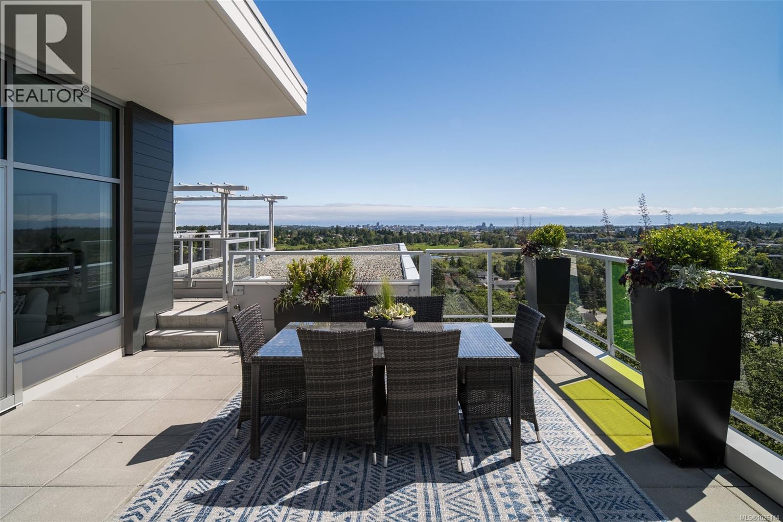 A Rare Penthouse Offering. The premier residence in this steel and concrete development and one of only two on its floor, this home is truly without equal. Nearly 1,600 sq.ft. of private terraces showcase 300° views from downtown Victoria to the Sooke Hills and Olympic Mountains. Inside, 1,568 sq.ft. of light-filled space features vaulted ceilings, expansive windows, built-in valences and heat pumps found only in penthouse homes. A split-bedroom layout ensures privacy, each with a deluxe ensuite, while most rooms enjoy private outlooks. The kitchen highlights include quartz surfaces, premium cabinetry and a huge island, flowing to an open living and dining room with a gas fireplace as a focal point. Outdoor living is unrivalled with an oversized balcony which includes a hot tub, three lighted arbours and a fire pit to create a retreat unmatched by any other unit. Two parking stalls closest to the elevator plus an oversized storage room add convenience. Pets are welcome too! Just 20 minutes from Sidney or downtown Victoria, with access to the Lochside and Galloping Goose trails. (30407726)