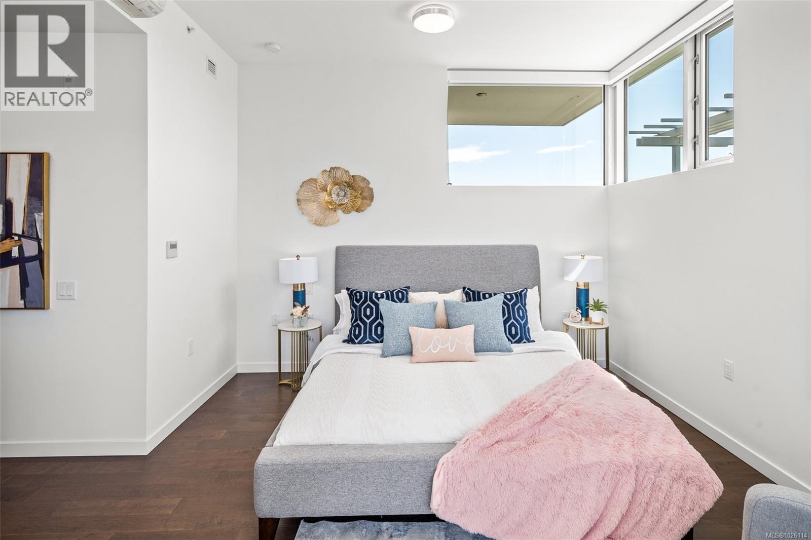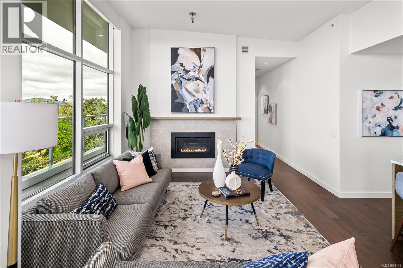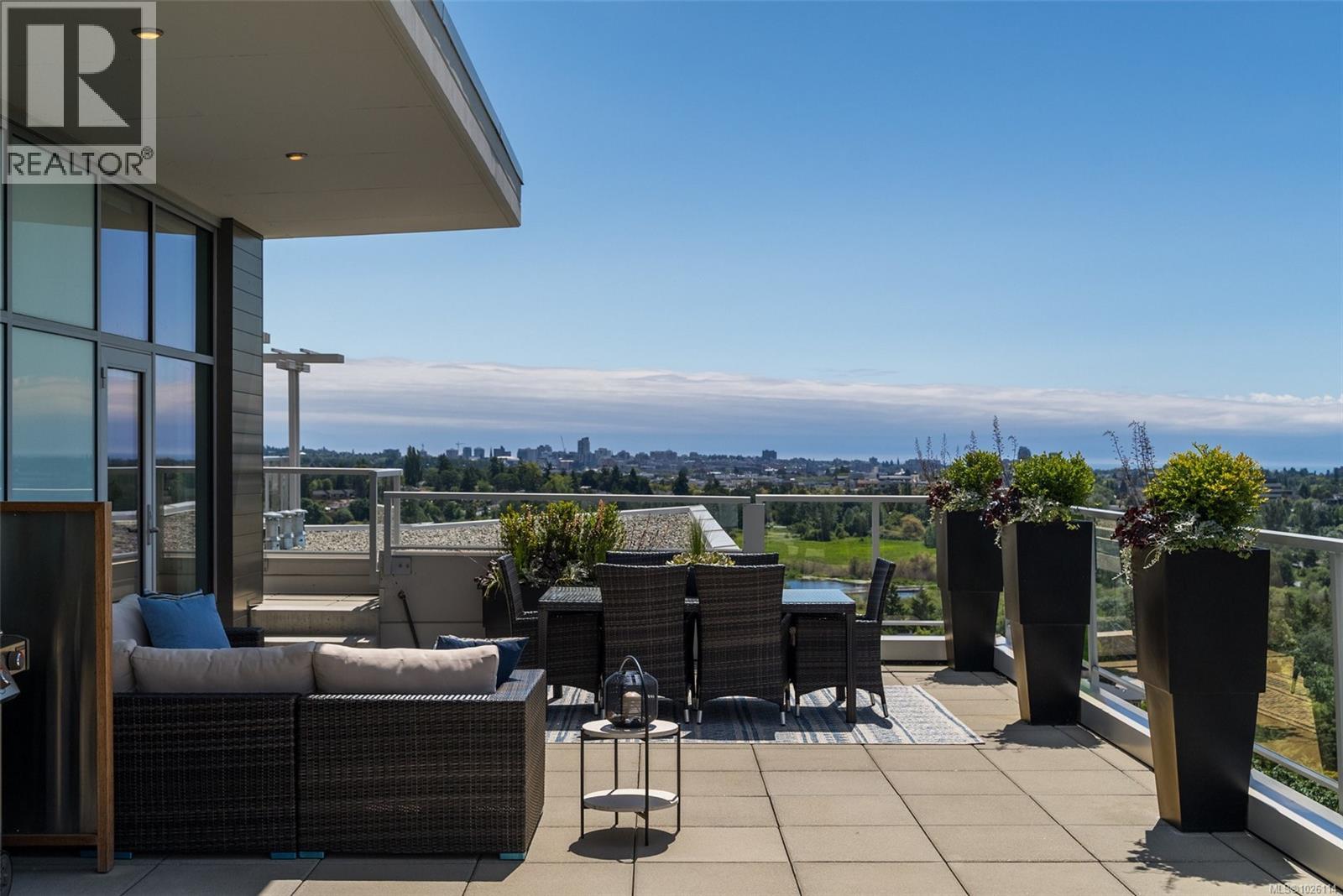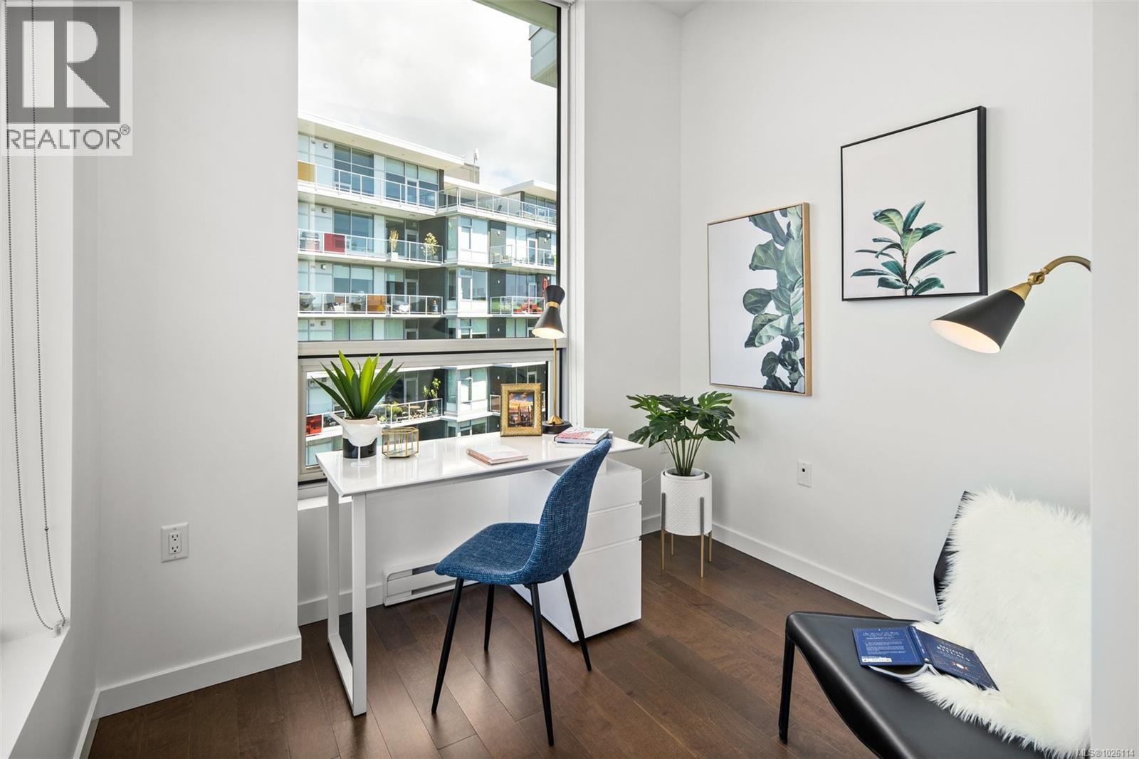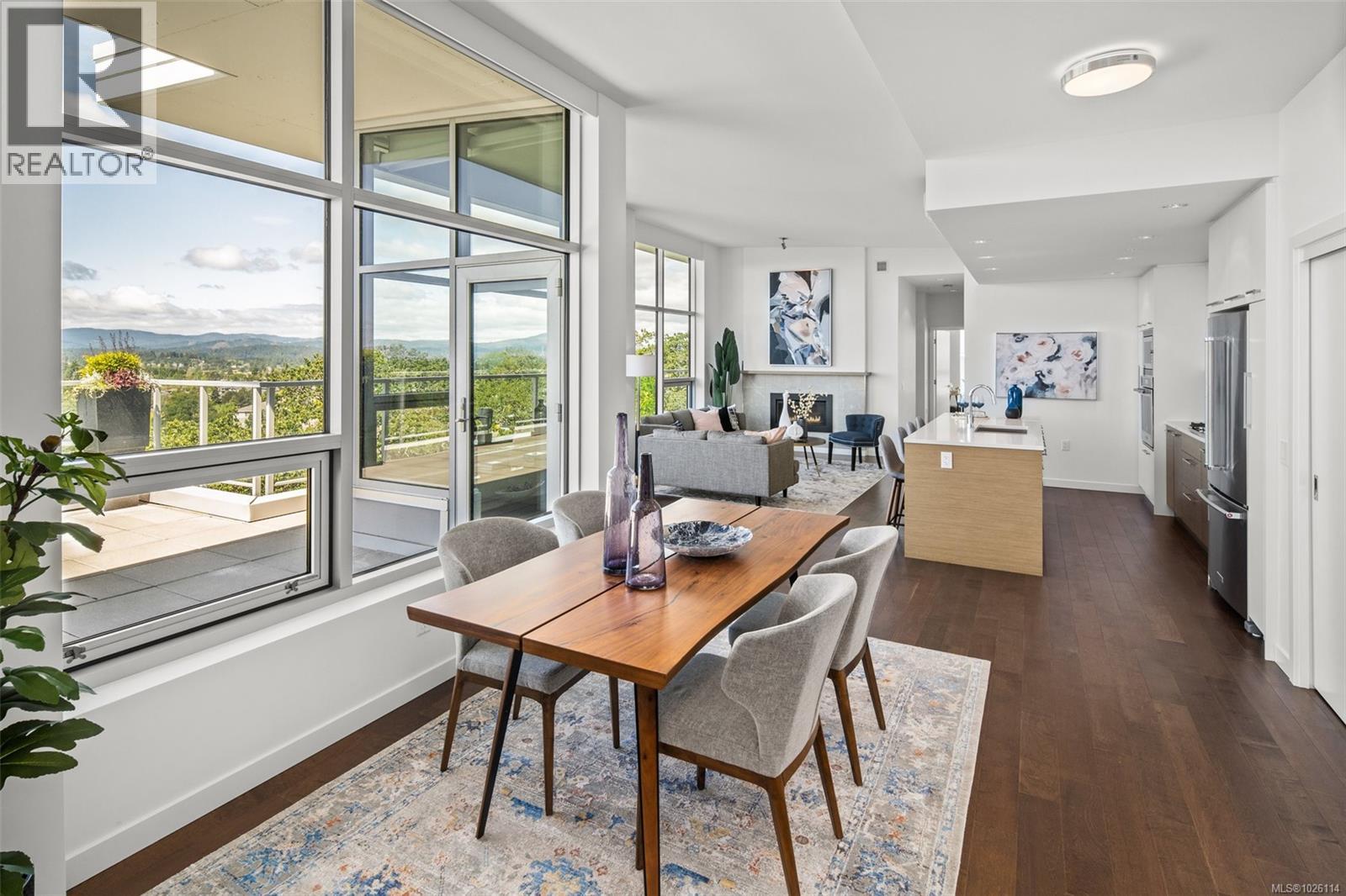 A Rare Penthouse Offering. The premier residence in this steel and concrete development and one of only two on its floor, this home is truly without equal. Nearly 1,600 sq.ft. of private terraces showcase 300° views from downtown Victoria to the Sooke Hills and Olympic Mountains. Inside, 1,568 sq.ft. of light-filled space features vaulted ceilings, expansive windows, built-in valences and heat pumps found only in penthouse homes. A split-bedroom layout ensures privacy, each with a deluxe ensuite, while most rooms enjoy private outlooks. The kitchen highlights include quartz surfaces, premium cabinetry and a huge island, flowing to an open living and dining room with a gas fireplace as a focal point. Outdoor living is unrivalled with an oversized balcony which includes a hot tub, three lighted arbours and a fire pit to create a retreat unmatched by any other unit. Two parking stalls closest to the elevator plus an oversized storage room add convenience. Pets are welcome too! Just 20 minutes from Sidney or downtown Victoria, with access to the Lochside and Galloping Goose trails. (30407726)