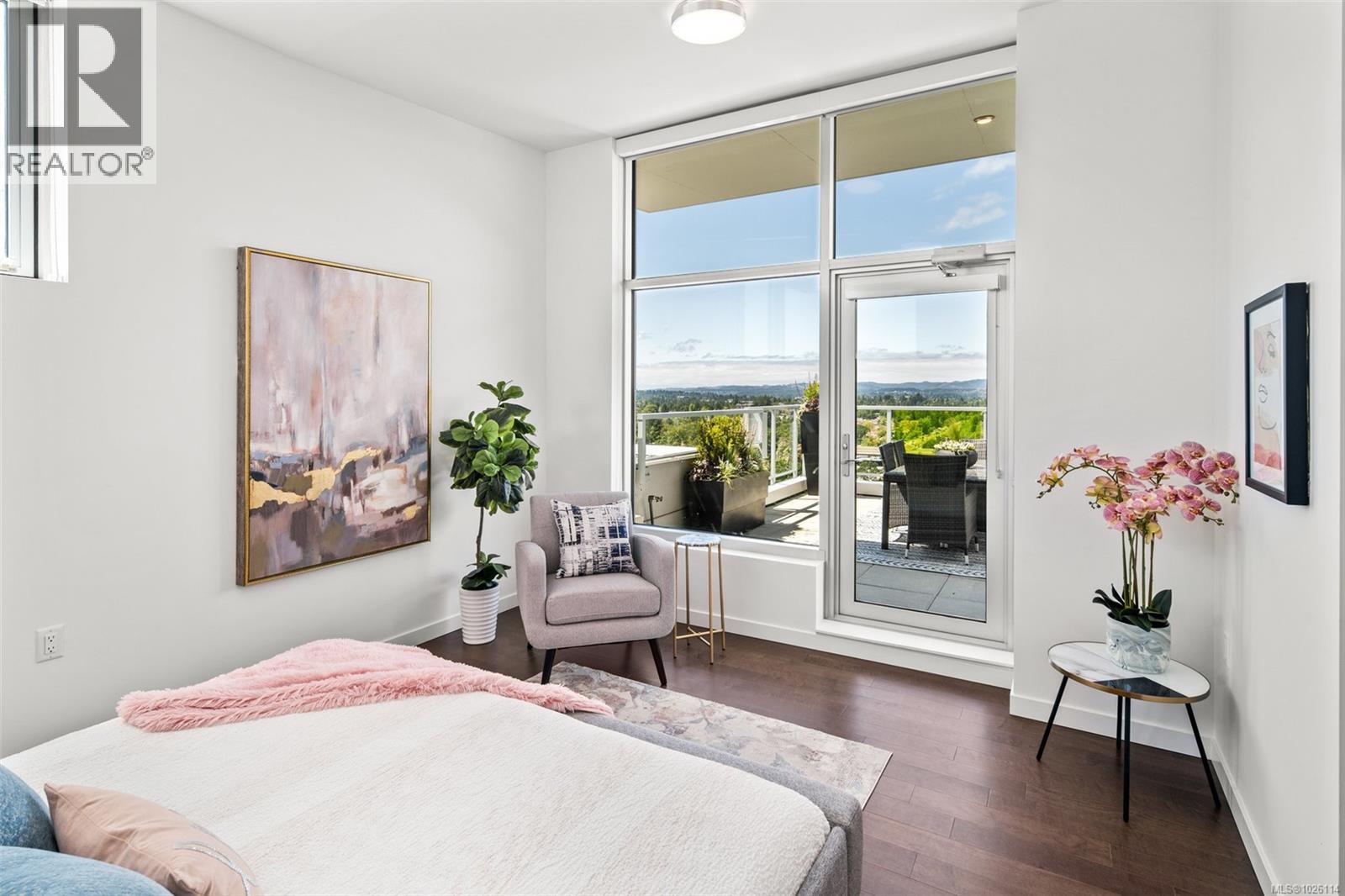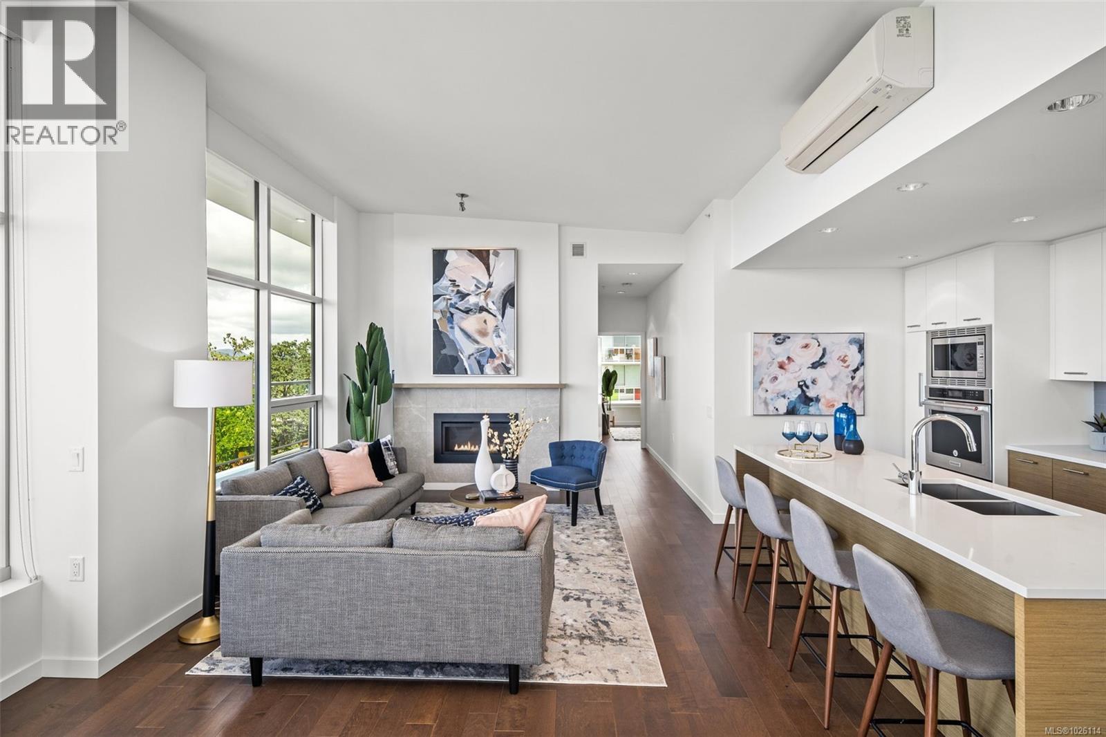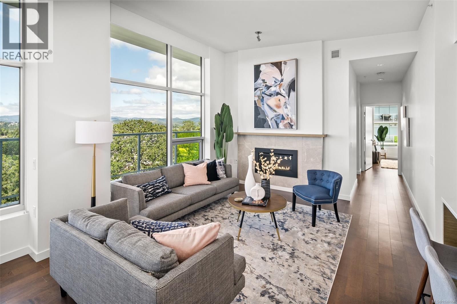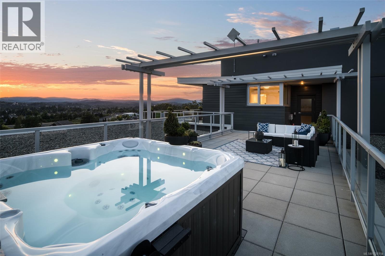 A Rare Penthouse Offering. The premier residence in this steel and concrete development and one of only two on its floor, this home is truly without equal. Nearly 1,600 sq.ft. of private terraces showcase 300° views from downtown Victoria to the Sooke Hills and Olympic Mountains. Inside, 1,568 sq.ft. of light-filled space features vaulted ceilings, expansive windows, built-in valences and heat pumps found only in penthouse homes. A split-bedroom layout ensures privacy, each with a deluxe ensuite, while most rooms enjoy private outlooks. The kitchen highlights include quartz surfaces, premium cabinetry and a huge island, flowing to an open living and dining room with a gas fireplace as a focal point. Outdoor living is unrivalled with an oversized balcony which includes a hot tub, three lighted arbours and a fire pit to create a retreat unmatched by any other unit. Two parking stalls closest to the elevator plus an oversized storage room add convenience. Pets are welcome too! Just 20 minutes from Sidney or downtown Victoria, with access to the Lochside and Galloping Goose trails. (30407726)