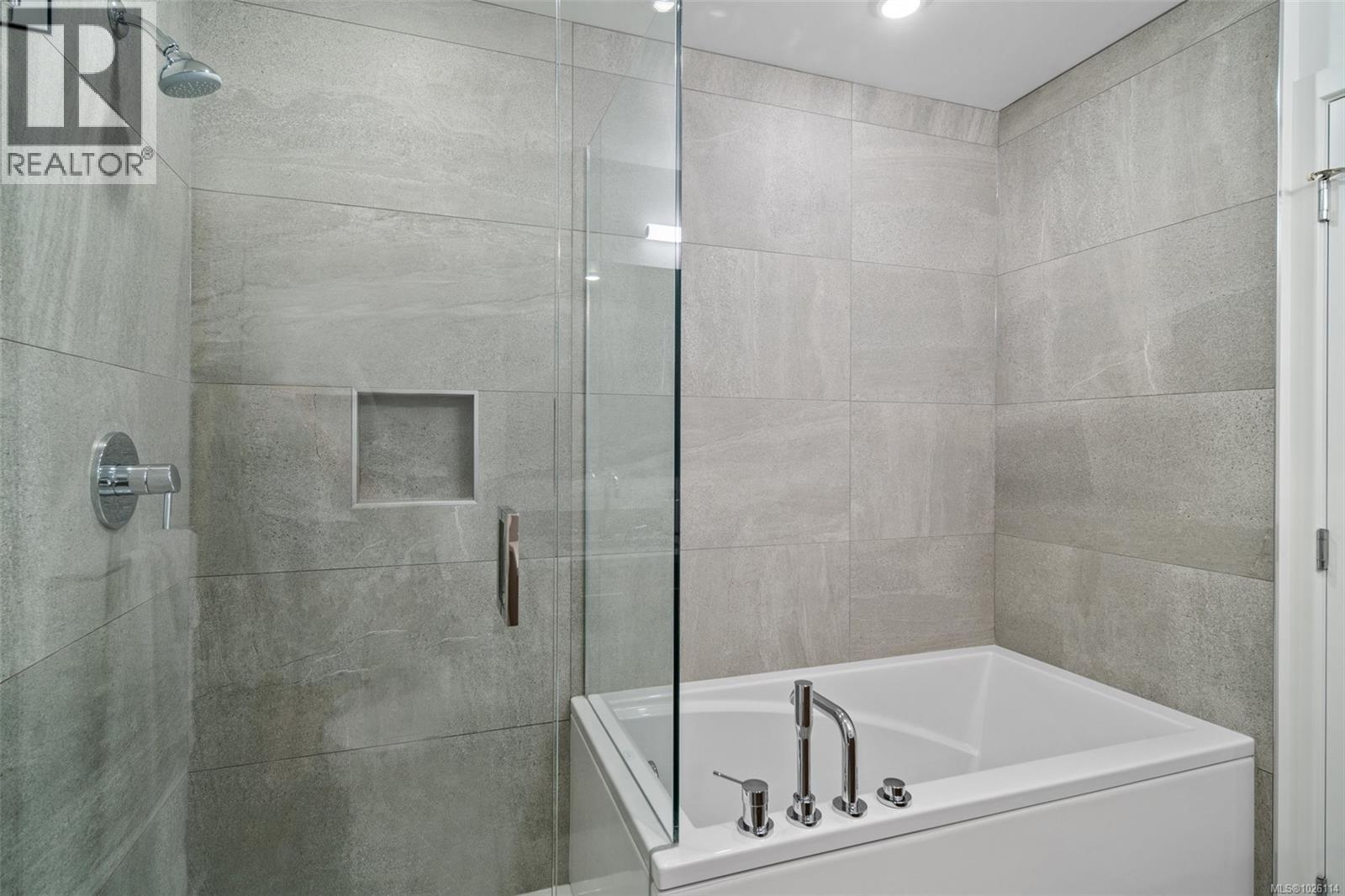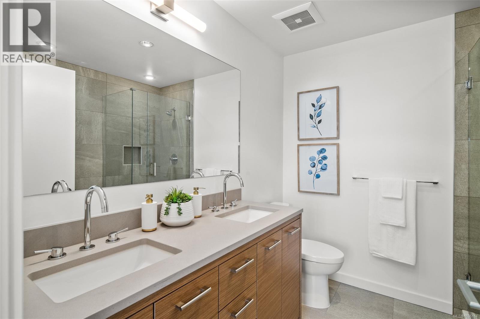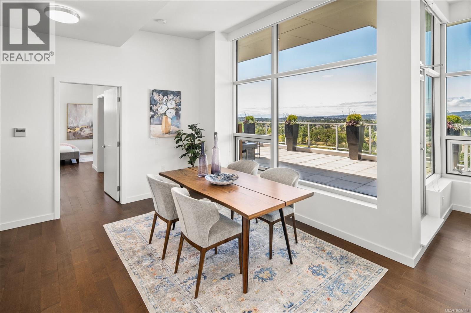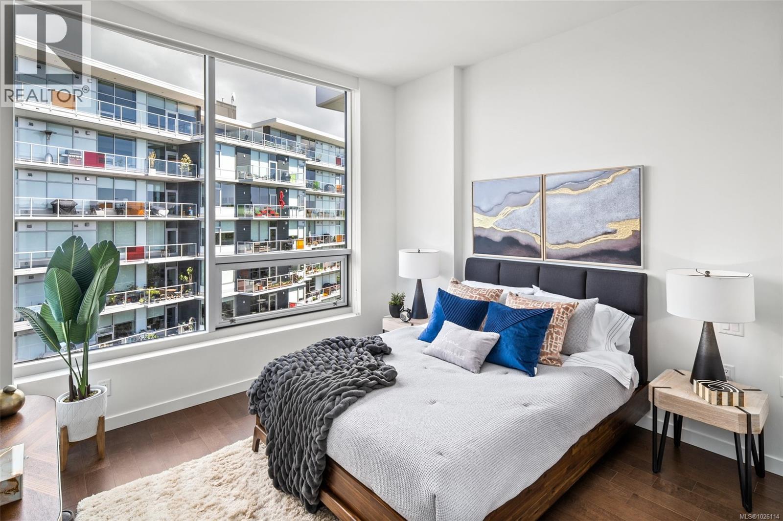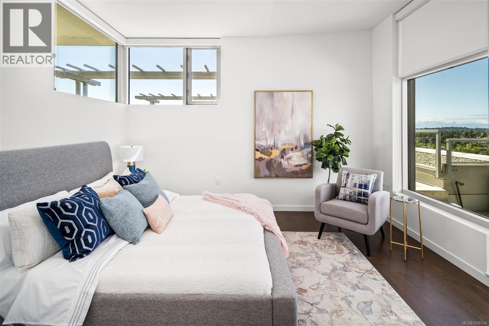 A Rare Penthouse Offering. The premier residence in this steel and concrete development and one of only two on its floor, this home is truly without equal. Nearly 1,600 sq.ft. of private terraces showcase 300° views from downtown Victoria to the Sooke Hills and Olympic Mountains. Inside, 1,568 sq.ft. of light-filled space features vaulted ceilings, expansive windows, built-in valences and heat pumps found only in penthouse homes. A split-bedroom layout ensures privacy, each with a deluxe ensuite, while most rooms enjoy private outlooks. The kitchen highlights include quartz surfaces, premium cabinetry and a huge island, flowing to an open living and dining room with a gas fireplace as a focal point. Outdoor living is unrivalled with an oversized balcony which includes a hot tub, three lighted arbours and a fire pit to create a retreat unmatched by any other unit. Two parking stalls closest to the elevator plus an oversized storage room add convenience. Pets are welcome too! Just 20 minutes from Sidney or downtown Victoria, with access to the Lochside and Galloping Goose trails. (30407726)