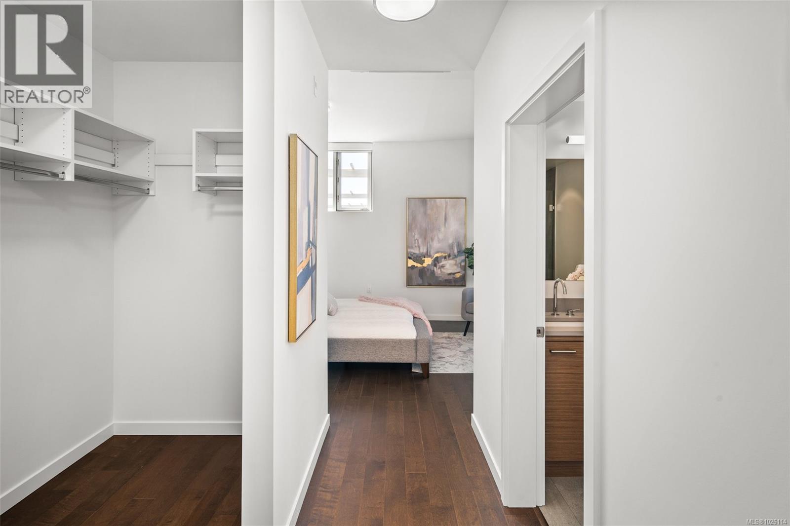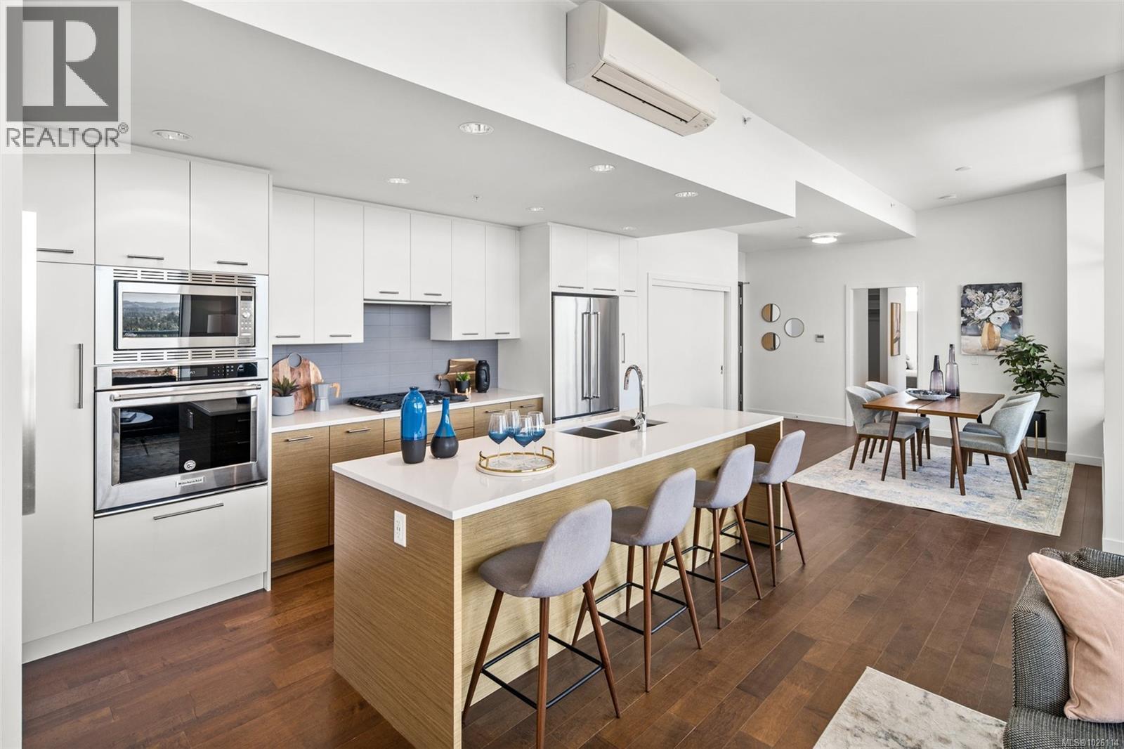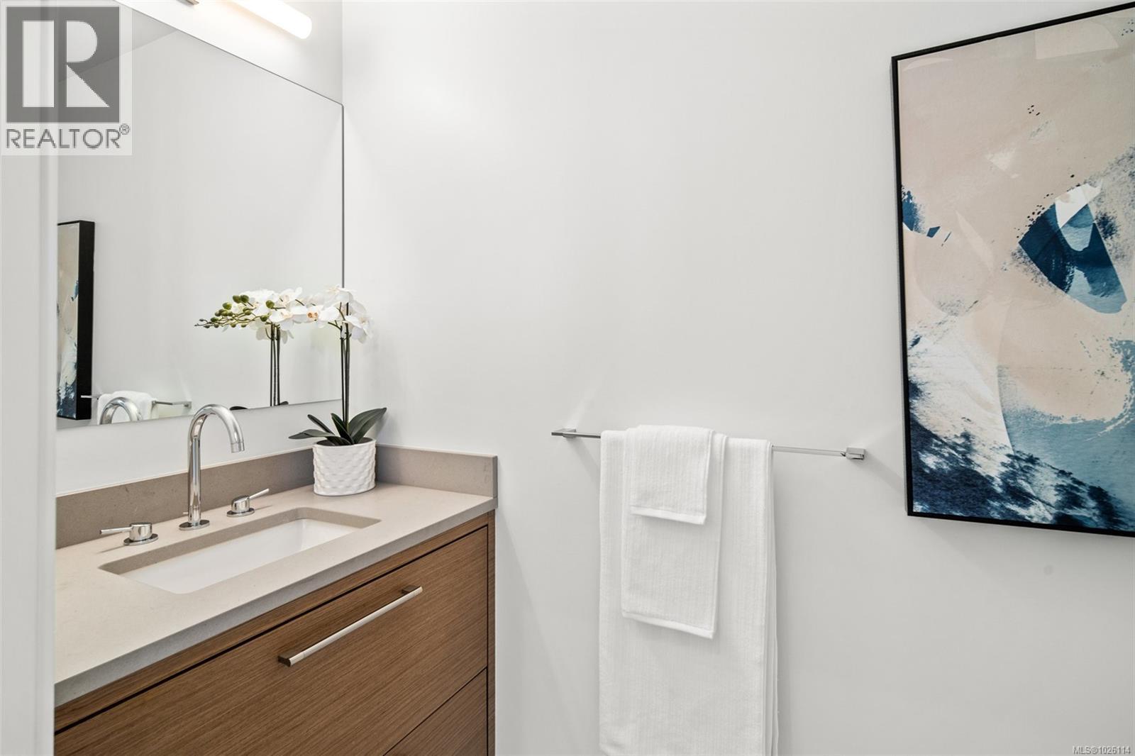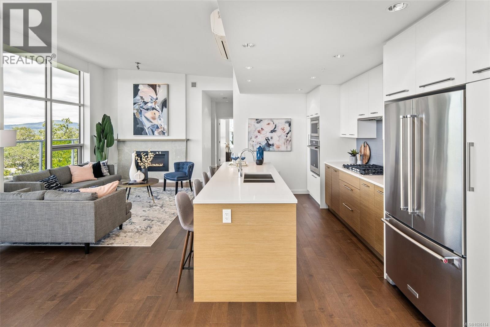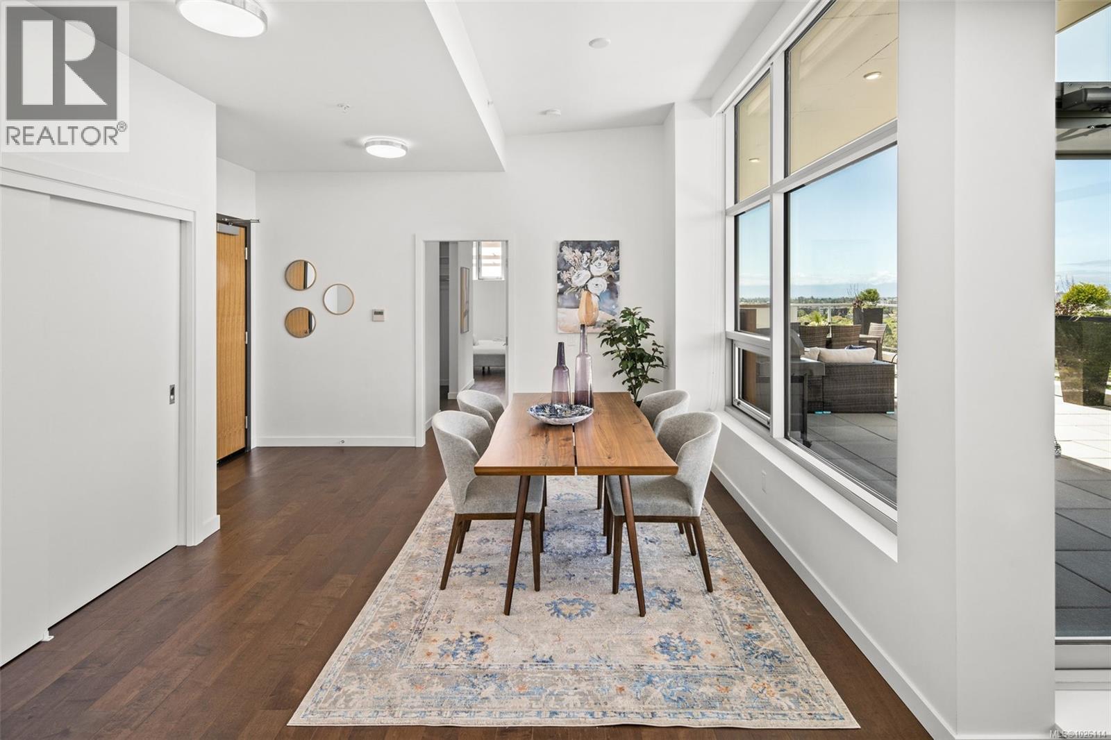 A Rare Penthouse Offering. The premier residence in this steel and concrete development and one of only two on its floor, this home is truly without equal. Nearly 1,600 sq.ft. of private terraces showcase 300° views from downtown Victoria to the Sooke Hills and Olympic Mountains. Inside, 1,568 sq.ft. of light-filled space features vaulted ceilings, expansive windows, built-in valences and heat pumps found only in penthouse homes. A split-bedroom layout ensures privacy, each with a deluxe ensuite, while most rooms enjoy private outlooks. The kitchen highlights include quartz surfaces, premium cabinetry and a huge island, flowing to an open living and dining room with a gas fireplace as a focal point. Outdoor living is unrivalled with an oversized balcony which includes a hot tub, three lighted arbours and a fire pit to create a retreat unmatched by any other unit. Two parking stalls closest to the elevator plus an oversized storage room add convenience. Pets are welcome too! Just 20 minutes from Sidney or downtown Victoria, with access to the Lochside and Galloping Goose trails. (30407726)