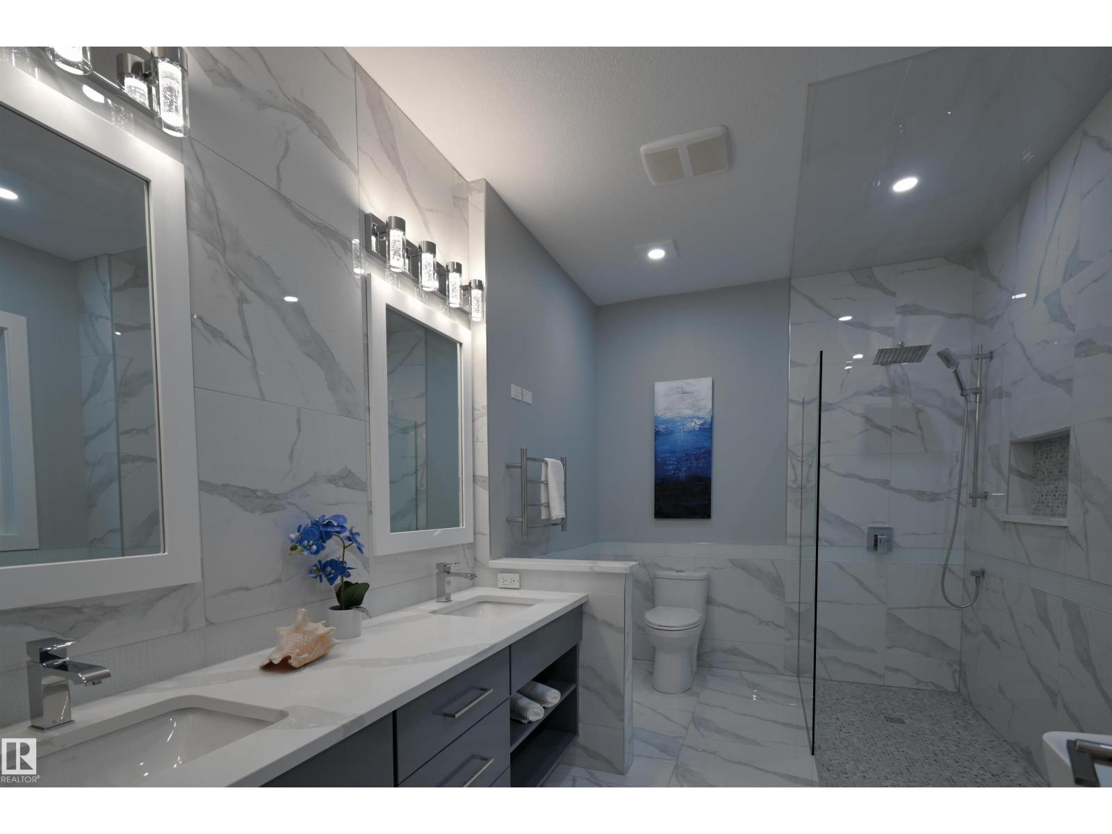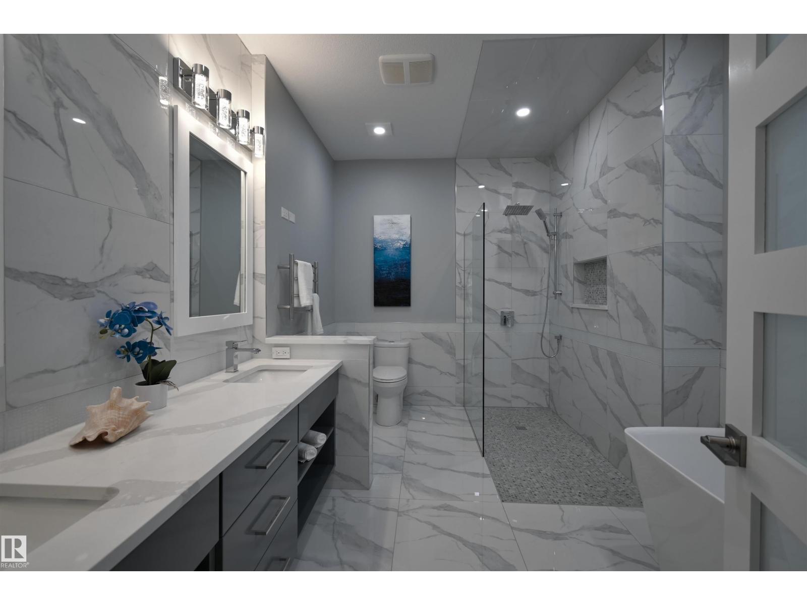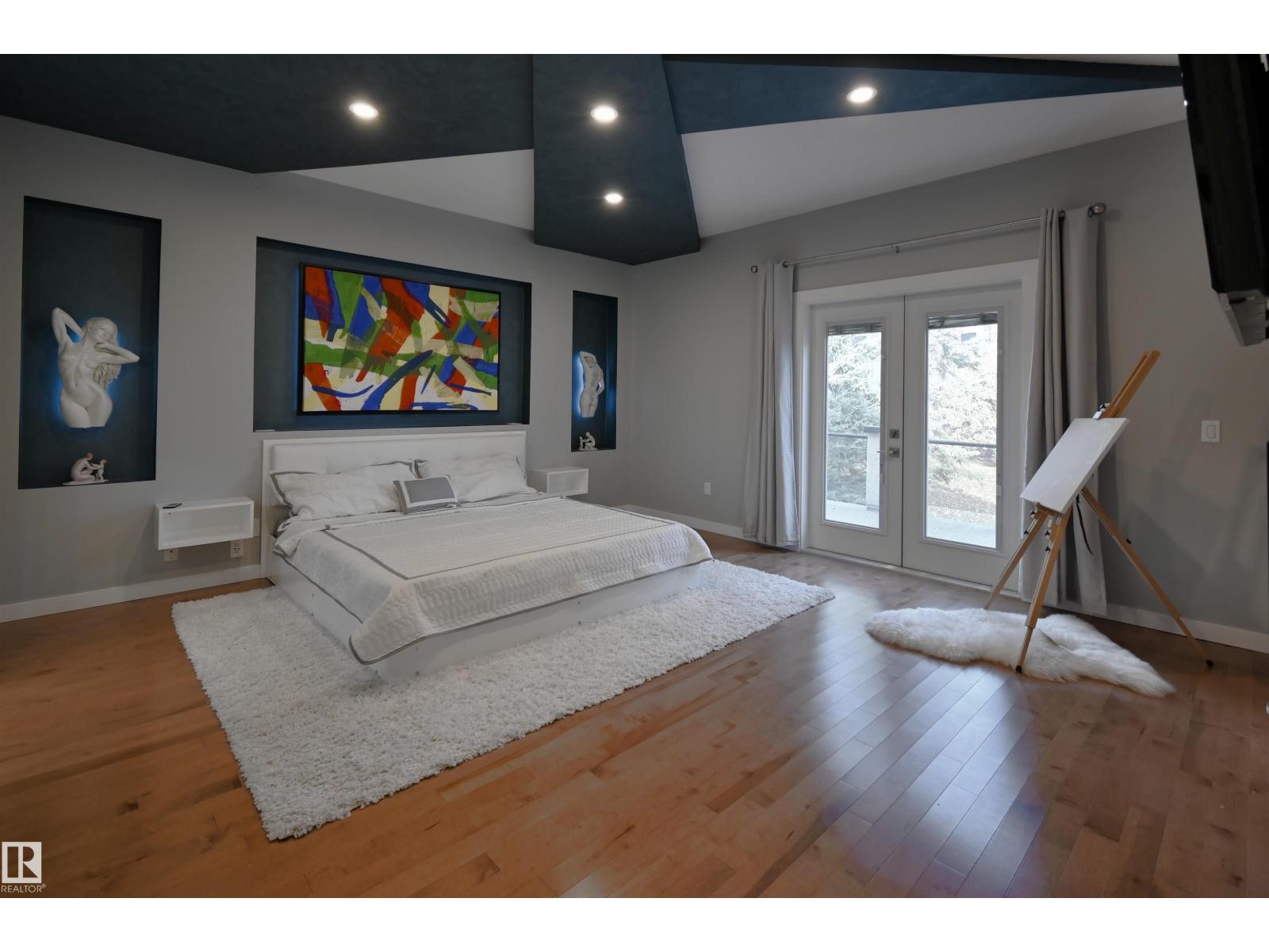 Exceptional Executive Acreage in Prestigious Atim Creek! Just minutes North of Town, this 5-bed + den custom-built bungalow has been beautifullyrenovated. The updated kitchen features European cabinets, quartz counters, island & a huge new pantry. Ample natural light, a fireplace & vaultedceilings add elegance to the open main living space. Large windows in the living and dining rooms offer a treed view of the property. The primary suiteis HUGE, offering a gorgeous new 5-pc ensuite, walk-in closet, fireplace and deck access. Two additional beds, den, laundry & dog wash complete themain floor. The finished lower level has a family/games room with fireplace and wet bar, 4th & 5th beds (both with ensuites), media room and threemore bathrooms. The huge deck is perfect for backyard entertaining, and the lower level walks out to a large, sheltered patio. Gather around the firepit in the private, treed yard. Parking is never a problem thanks to the oversized heated triple garage. Just 12 min to Edmonton! (33857501)