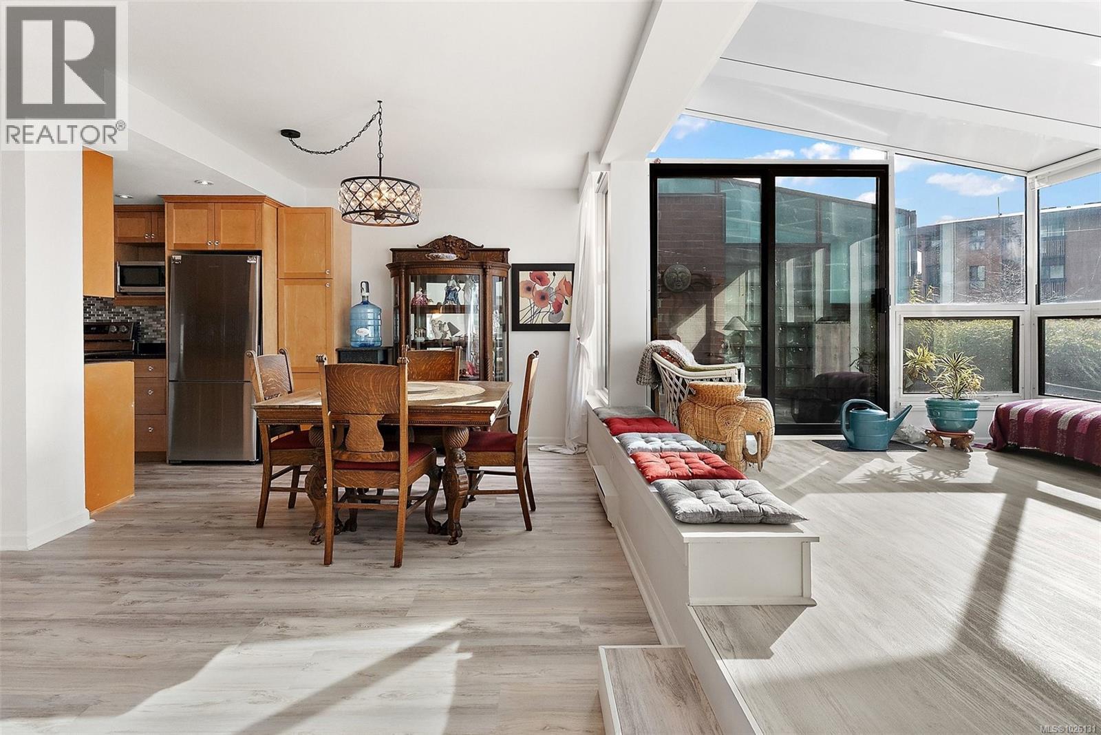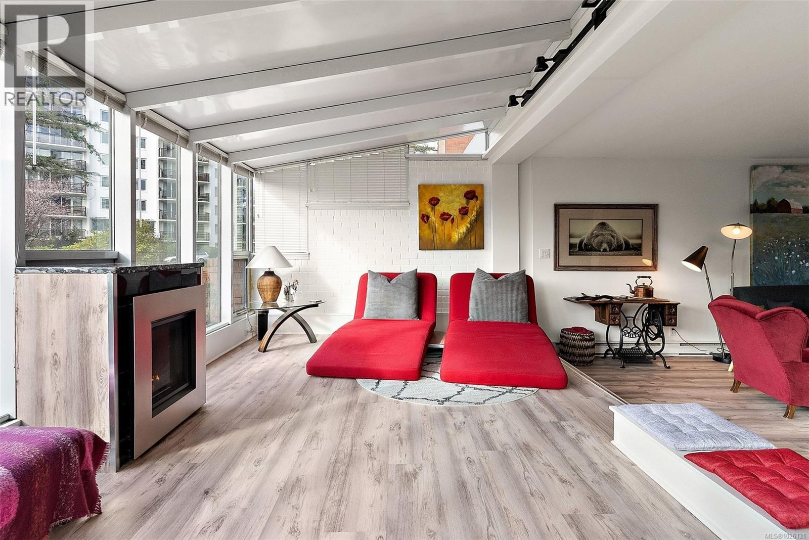 Welcome to this wonderful 2 bed, 2 bath, 2 level condo offering over 1,200 sq. ft. of thoughtfully designed living space in a desirable waterfront building. A unique feature is the enclosed patio, transformed into an incredible sunroom w large windows, electric FP, & exceptional privacy—perfect for enjoying peaceful views of the gardens, ocean, & mtns. Kitchen showcases quartz countertops & flows seamlessly into the living/dining area. Main level also features a 2 piece powder room with quartz counters, while upstairs offers 2 spacious bedrooms & a 4 piece bath. The elevator is conveniently located just outside your door for easy access to both levels. Includes parking, storage & access to amenities including a meeting rm, games rm, & 2 gyms. Step outside & you’re on one of the most beautiful oceanfront walkways, or stroll over the bridge to downtown Victoria. A rare offering in a beloved building the owner enjoys so much, she has bought another one in the building! (30410295)