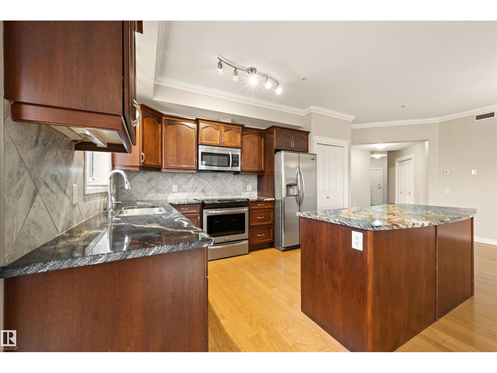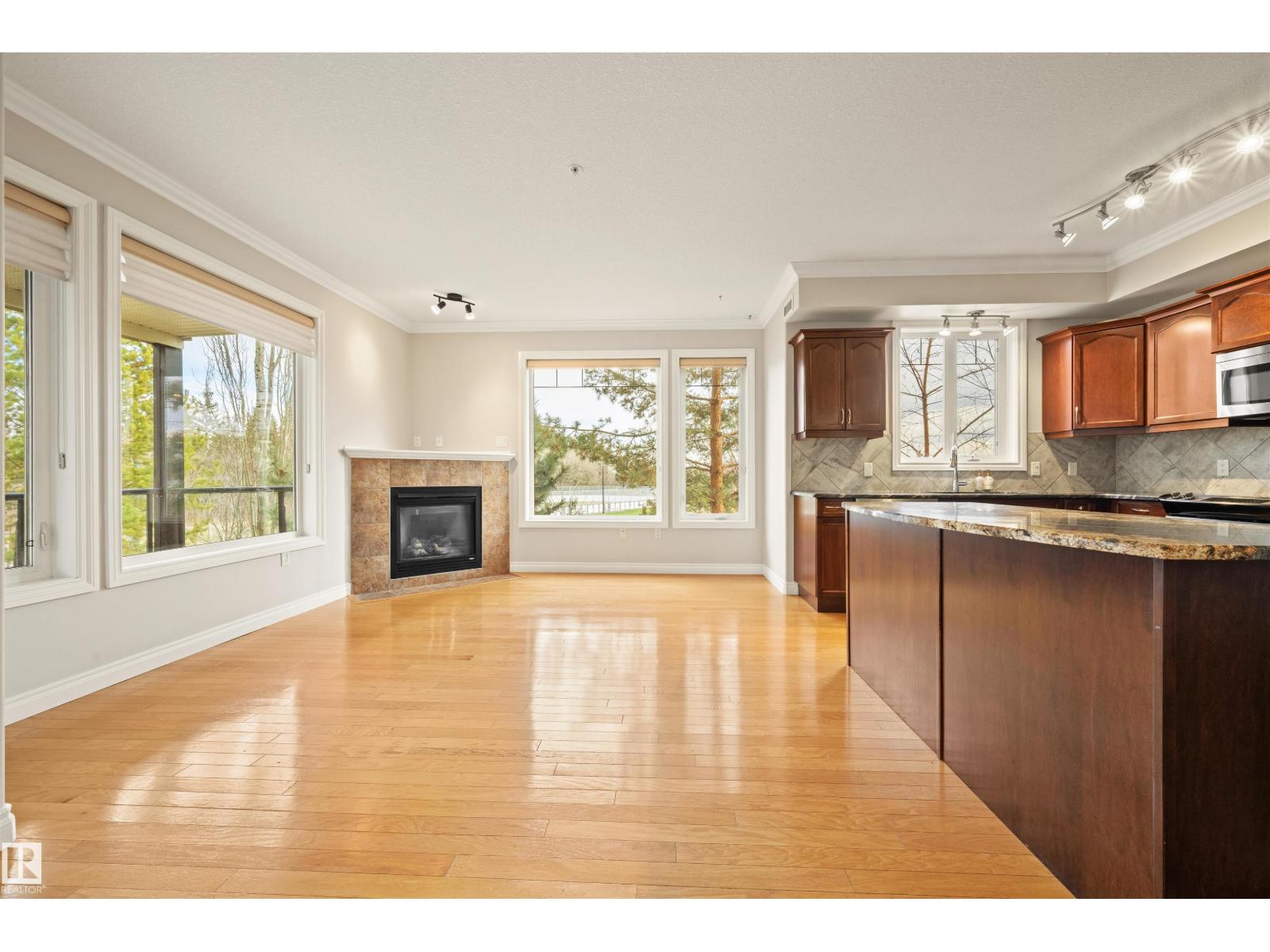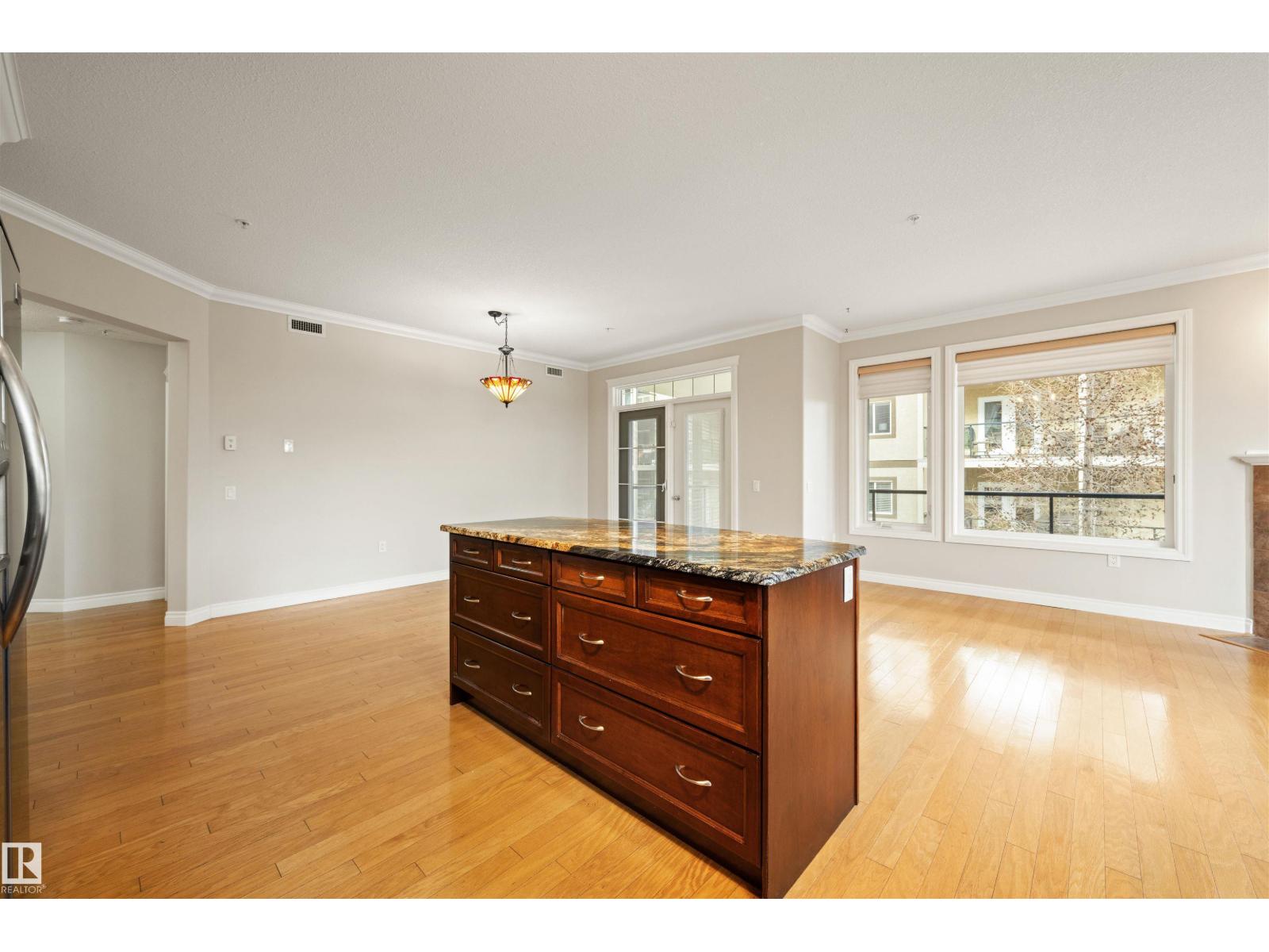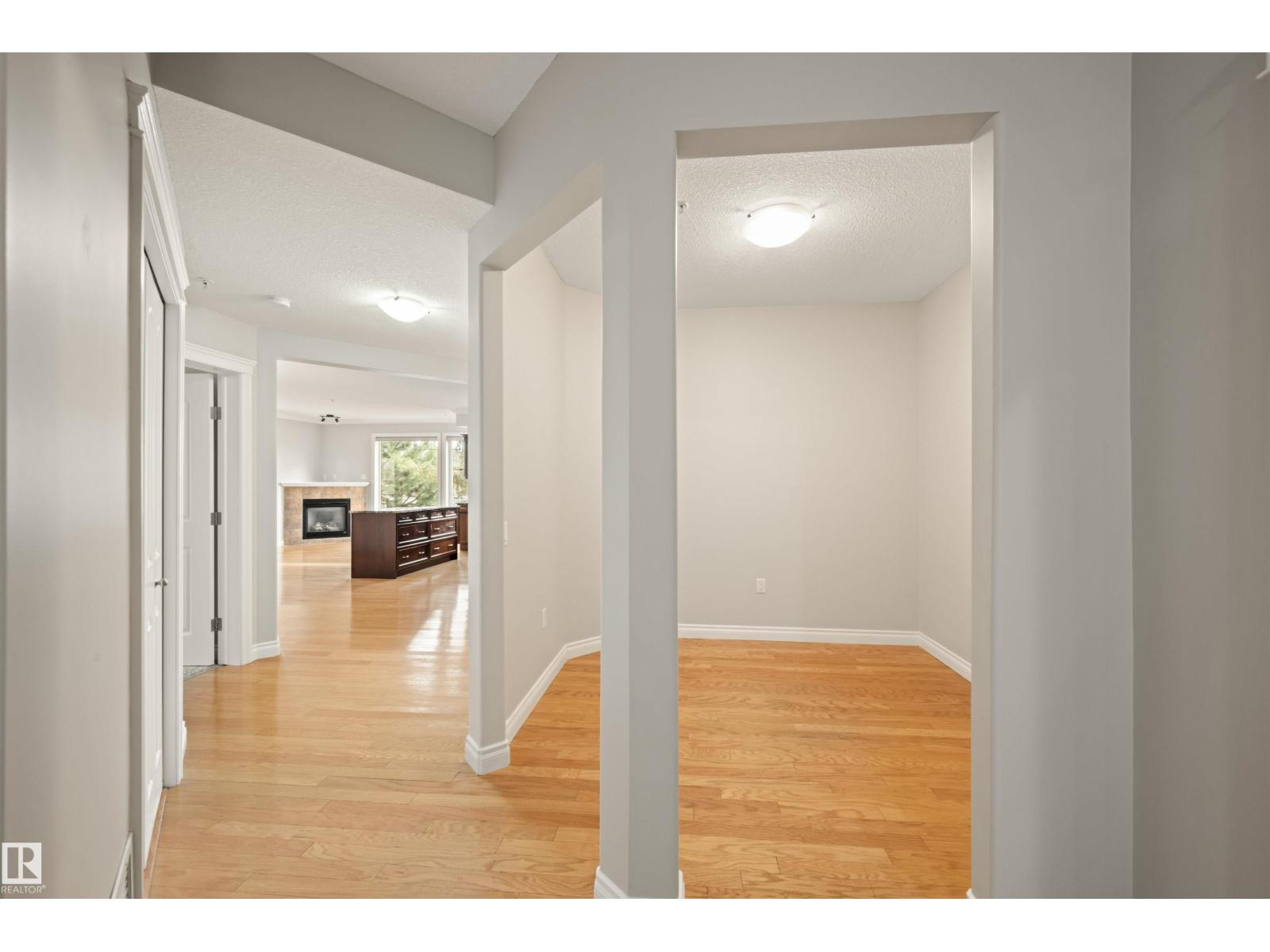 Welcome to this sophisticated and highly coveted corner unit with central A/C in this adult (18+) condo building. A stylish, private foyer welcomes you into the elegant dining area and open-concept layout. Newer luxury hardwood flooring flows throughout the space. The bright kitchen features stainless steel appliances, a pantry, and an island, while 9' ceiling and large windows flood the living room with natural light and frame the cozy natural gas fireplace. The spacious primary bedroom includes a walk-in closet and full ensuite. A second bedroom sits conveniently beside the main 4 piece bath. You’ll also love the generous laundry room, dedicated office space/flex room, and the huge balcony—perfect for hosting guests. Comes with a titled underground parking stall and underground storage locker. Enjoy exceptional amenities: gym, sauna, steam room, social/games room, guest suite, bike room, and car wash. This building is also pet-friendly! (33858597)