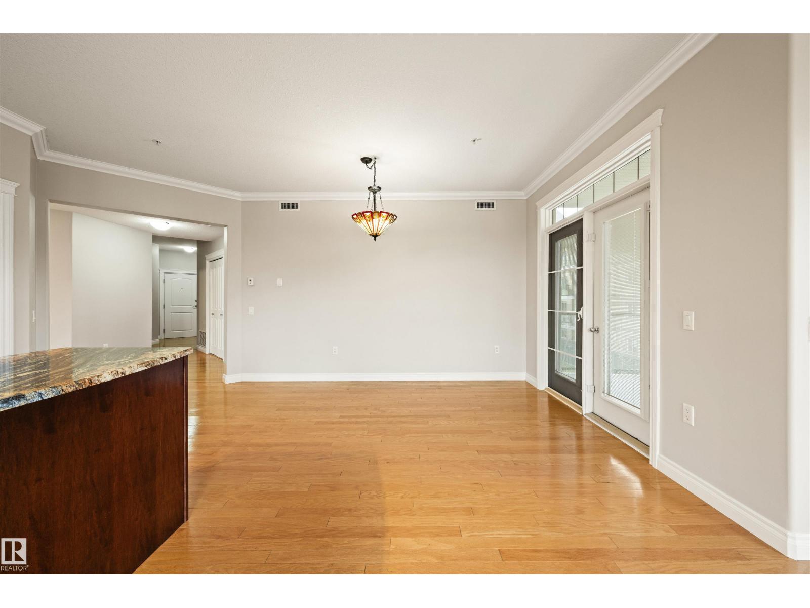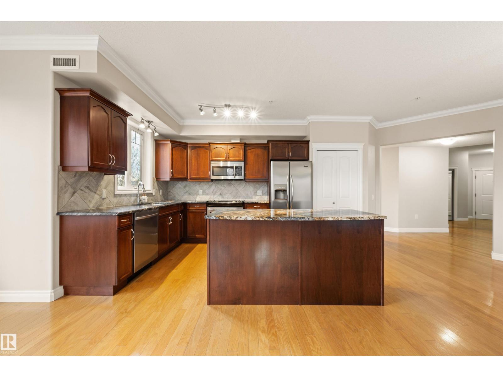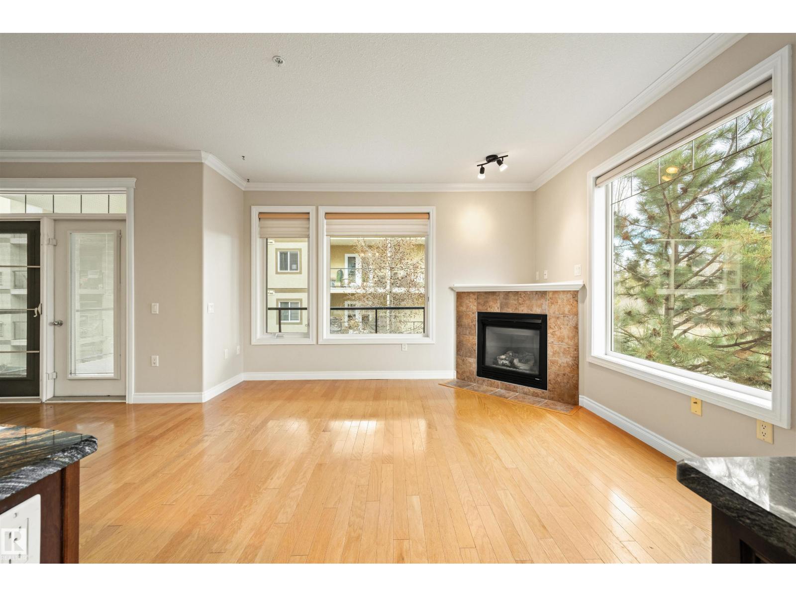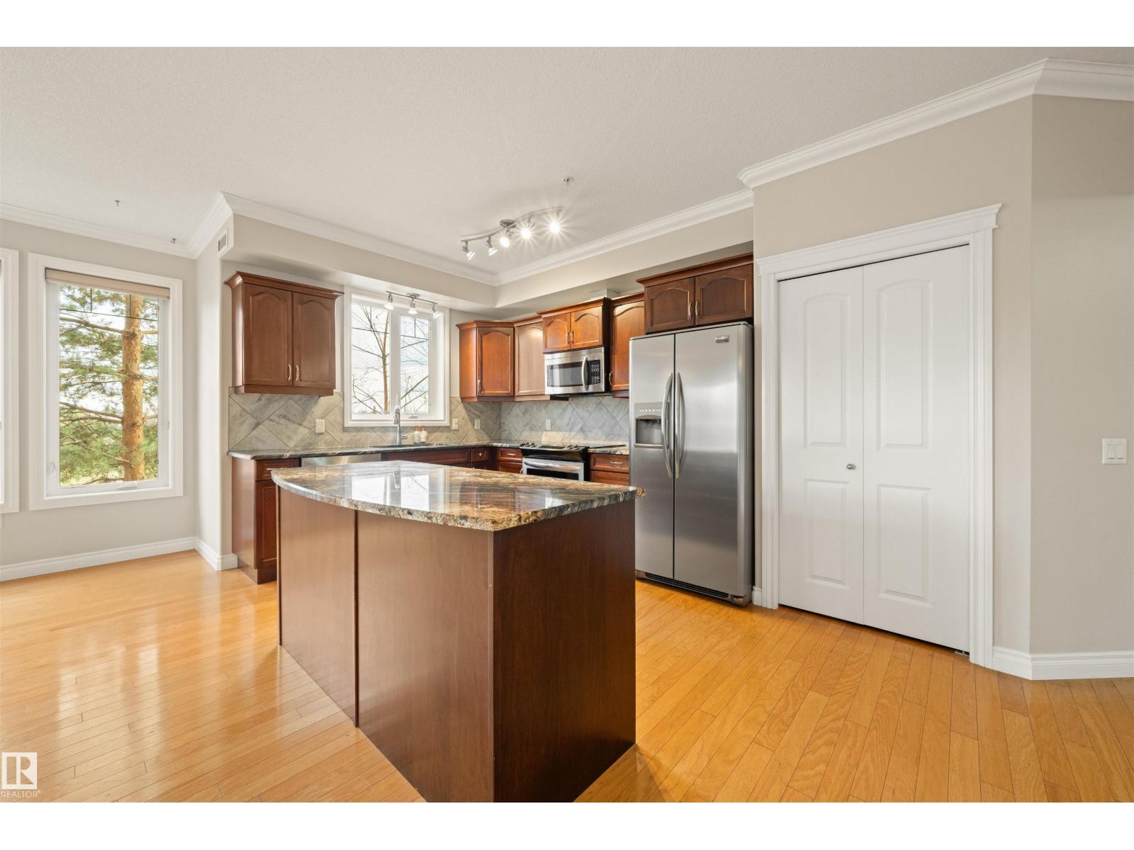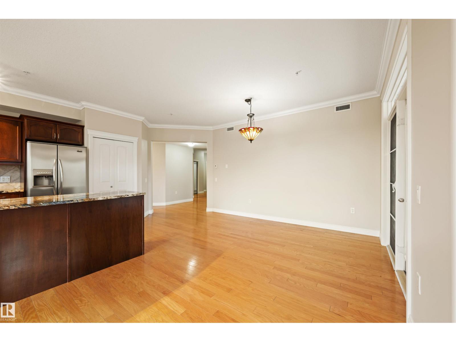 Welcome to this sophisticated and highly coveted corner unit with central A/C in this adult (18+) condo building. A stylish, private foyer welcomes you into the elegant dining area and open-concept layout. Newer luxury hardwood flooring flows throughout the space. The bright kitchen features stainless steel appliances, a pantry, and an island, while 9' ceiling and large windows flood the living room with natural light and frame the cozy natural gas fireplace. The spacious primary bedroom includes a walk-in closet and full ensuite. A second bedroom sits conveniently beside the main 4 piece bath. You’ll also love the generous laundry room, dedicated office space/flex room, and the huge balcony—perfect for hosting guests. Comes with a titled underground parking stall and underground storage locker. Enjoy exceptional amenities: gym, sauna, steam room, social/games room, guest suite, bike room, and car wash. This building is also pet-friendly! (33858597)