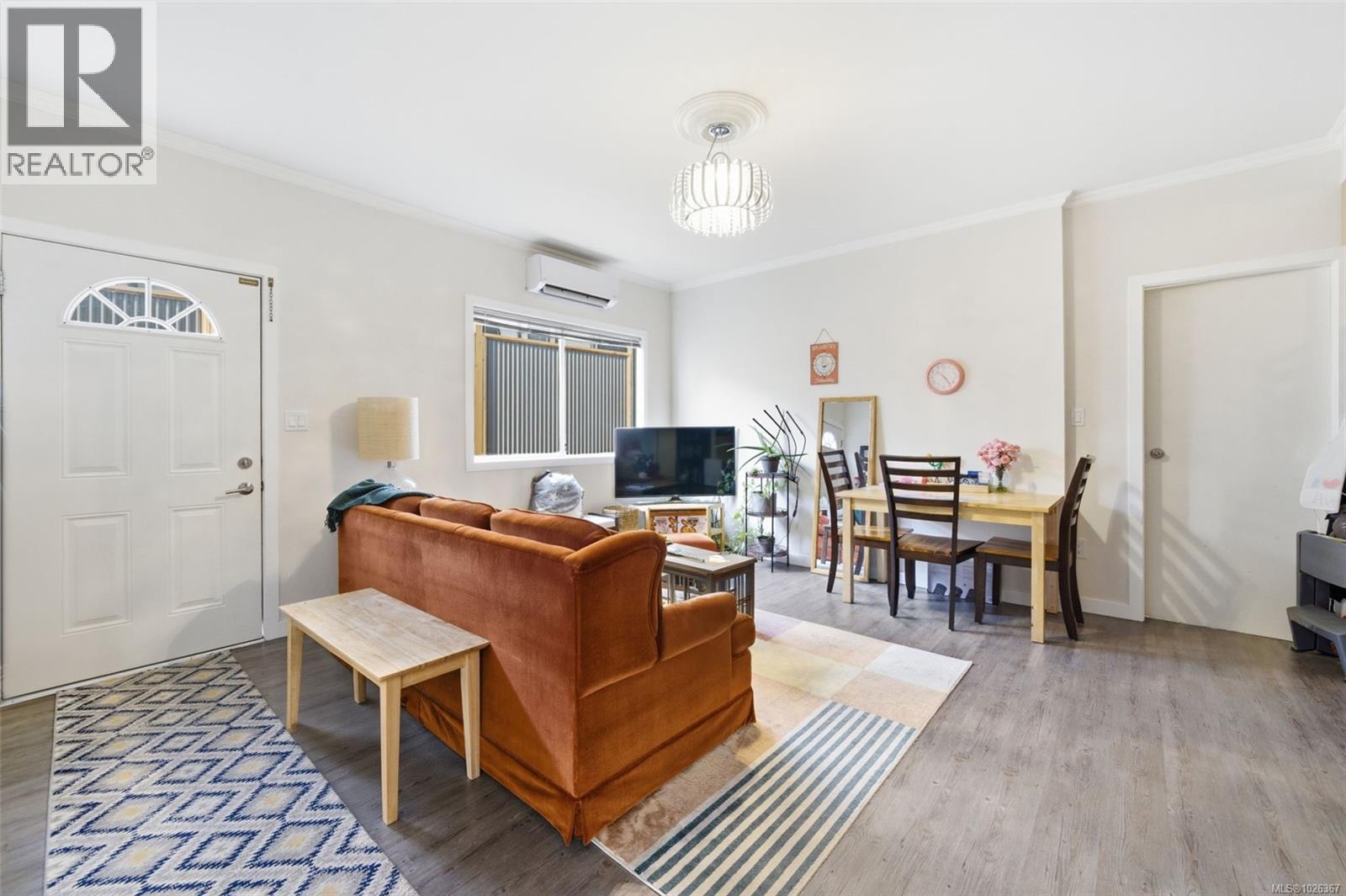 Living room featuring wood finished floors, ornamental molding, and a mini split for heating / cooling