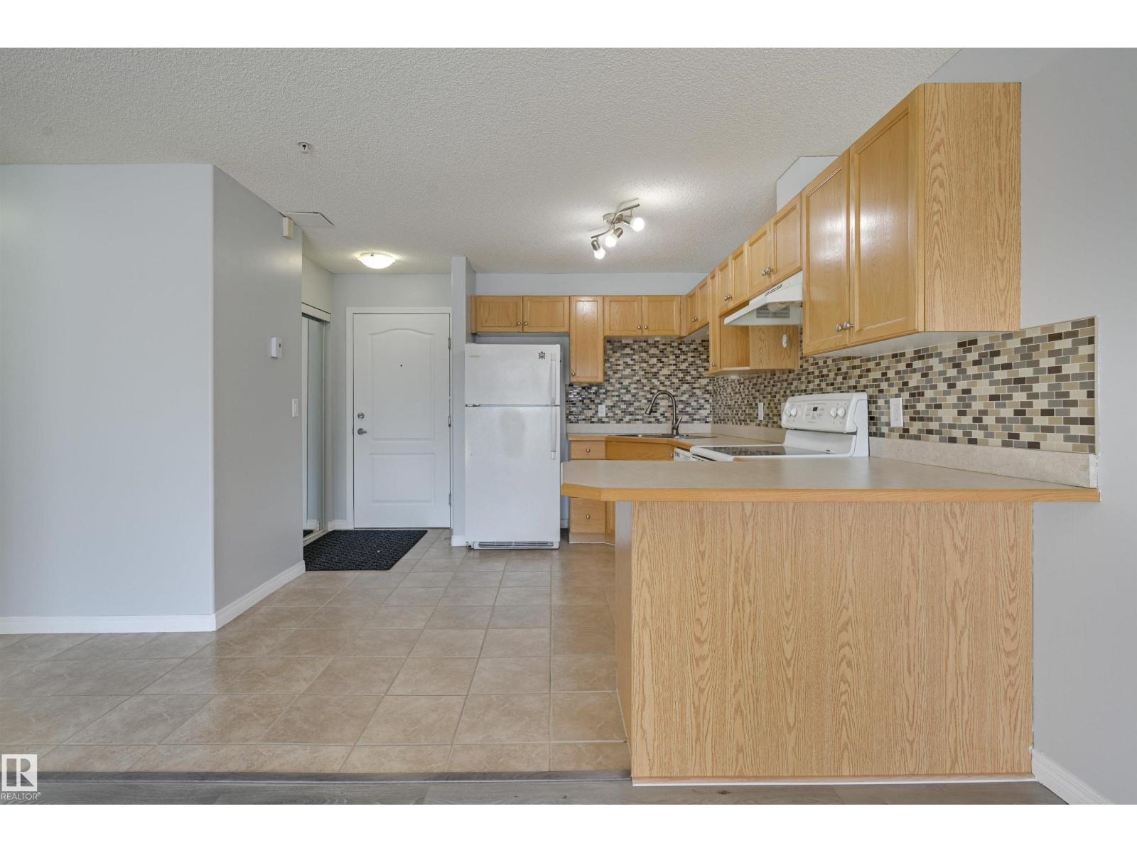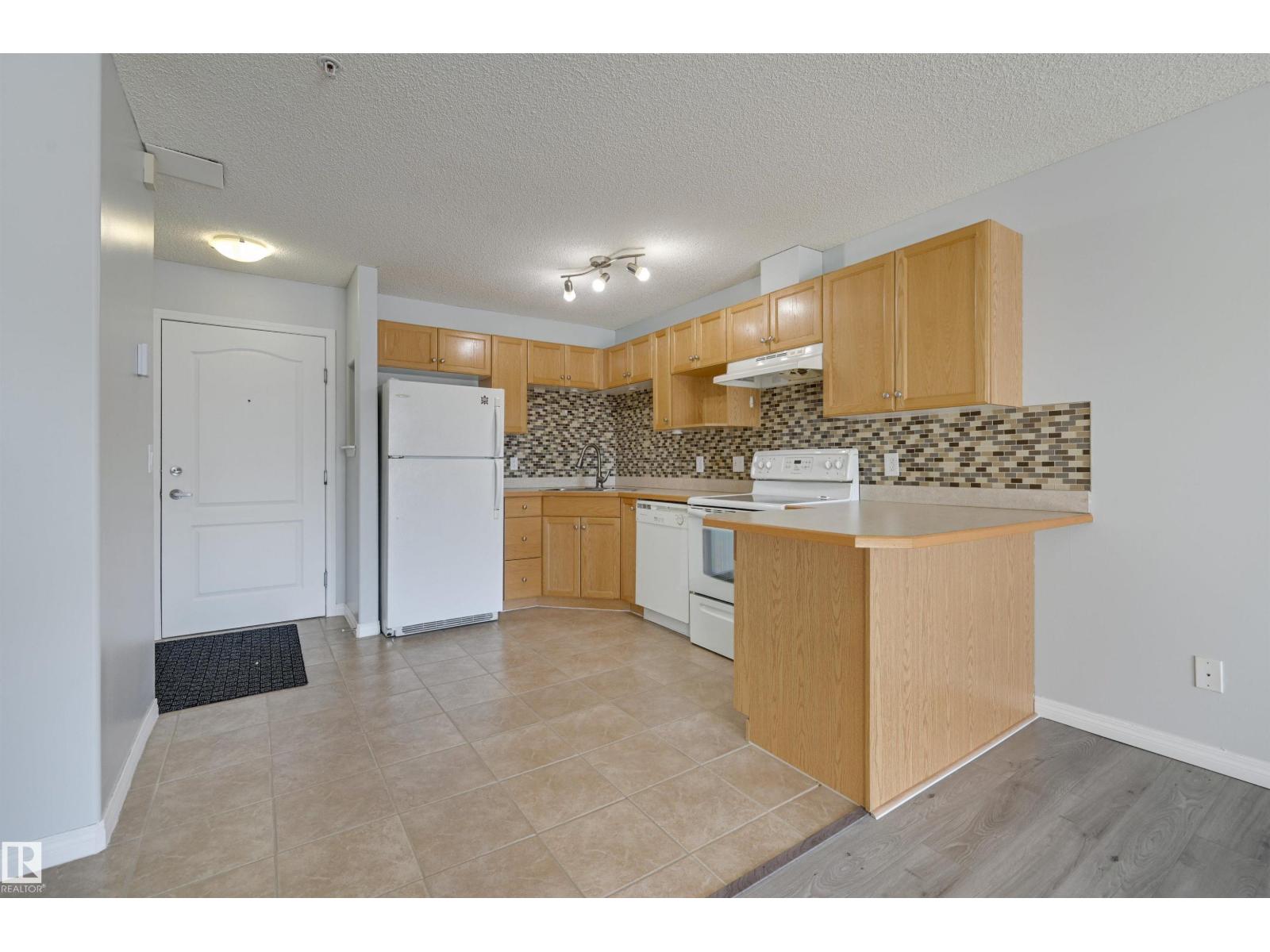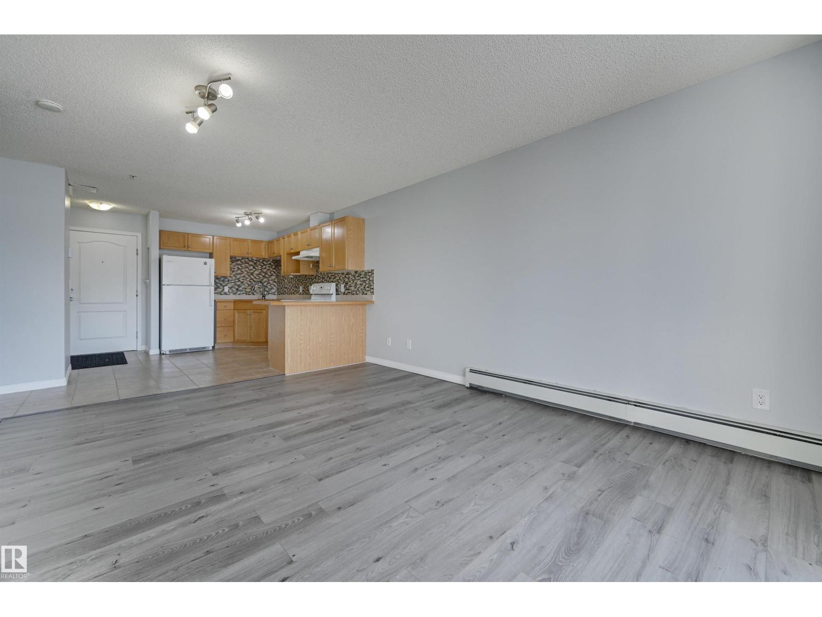 Welcome to this bright upgraded one bedroom condo in Park Place at Eaux Claires! Close to all amenities and easy access to the Anthony Henday. This suite is SW facing providing direct sunlight all day long with nice updates including flooring, paint, ceiling fan, and tile kitchen backsplash. There is a spacious living and dining area with laminate floors. Functional U-shaped kitchen with breakfast bar, oak cabinetry, and tile floors. The primary bedroom has plush upgraded carpets and modern ceiling fan. Main bathroom next to the bedroom complete with tub/shower. In suite laundry and there is a good sized in suite storage room. This suite comes with a titled parking stall. Very reasonable $372.39/mth condo fee which covers heat and water utilities. A fresh, bright, and move in ready home with at an affordable price point! Conveniently located right next to a major shopping district and Eaux Claires public transportation hub. (33861528)