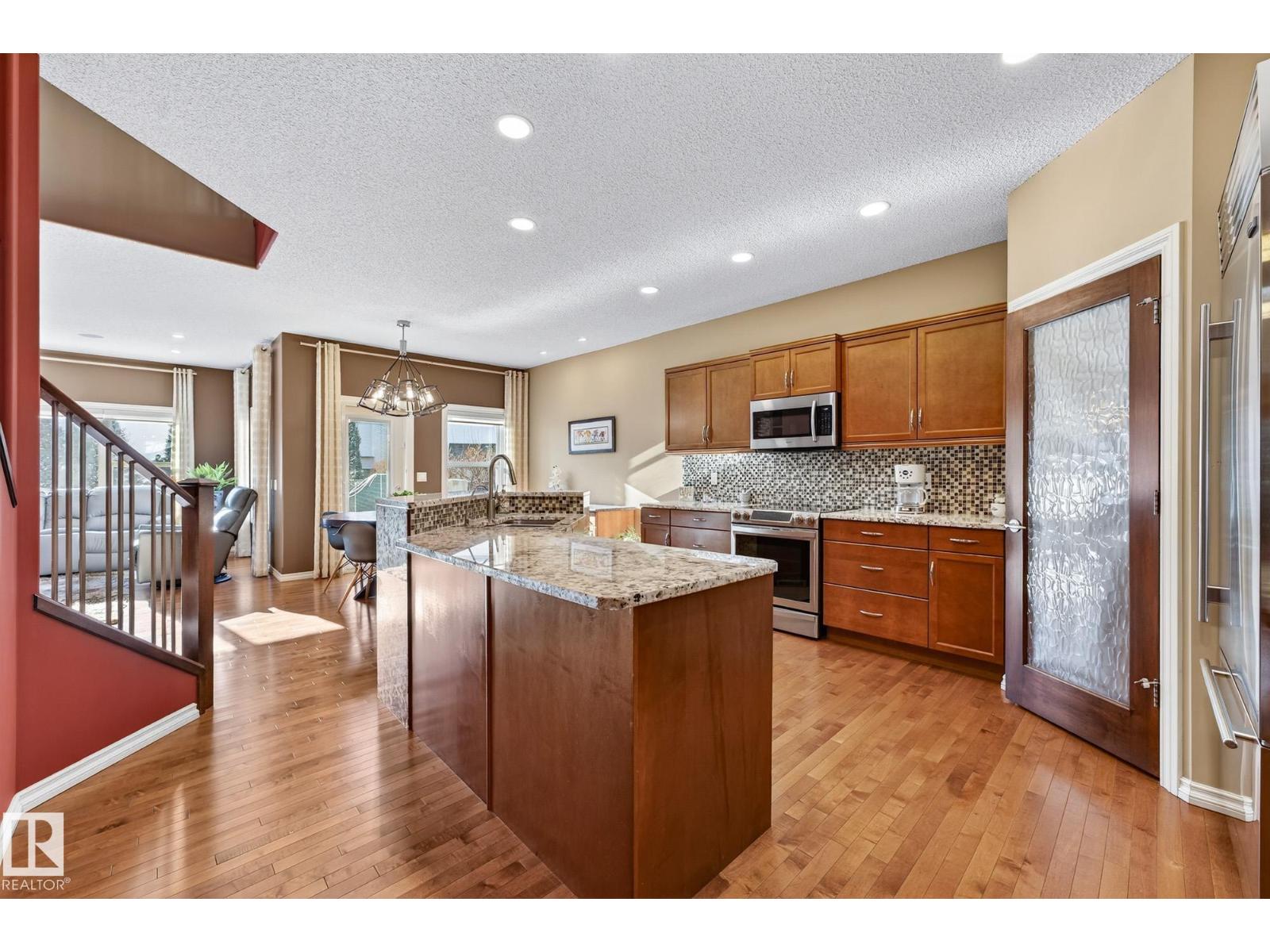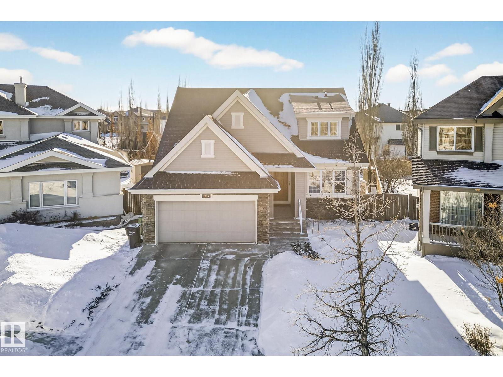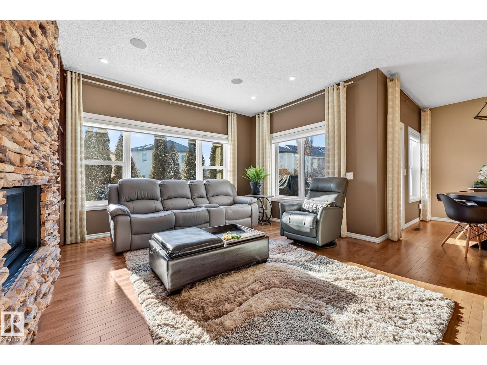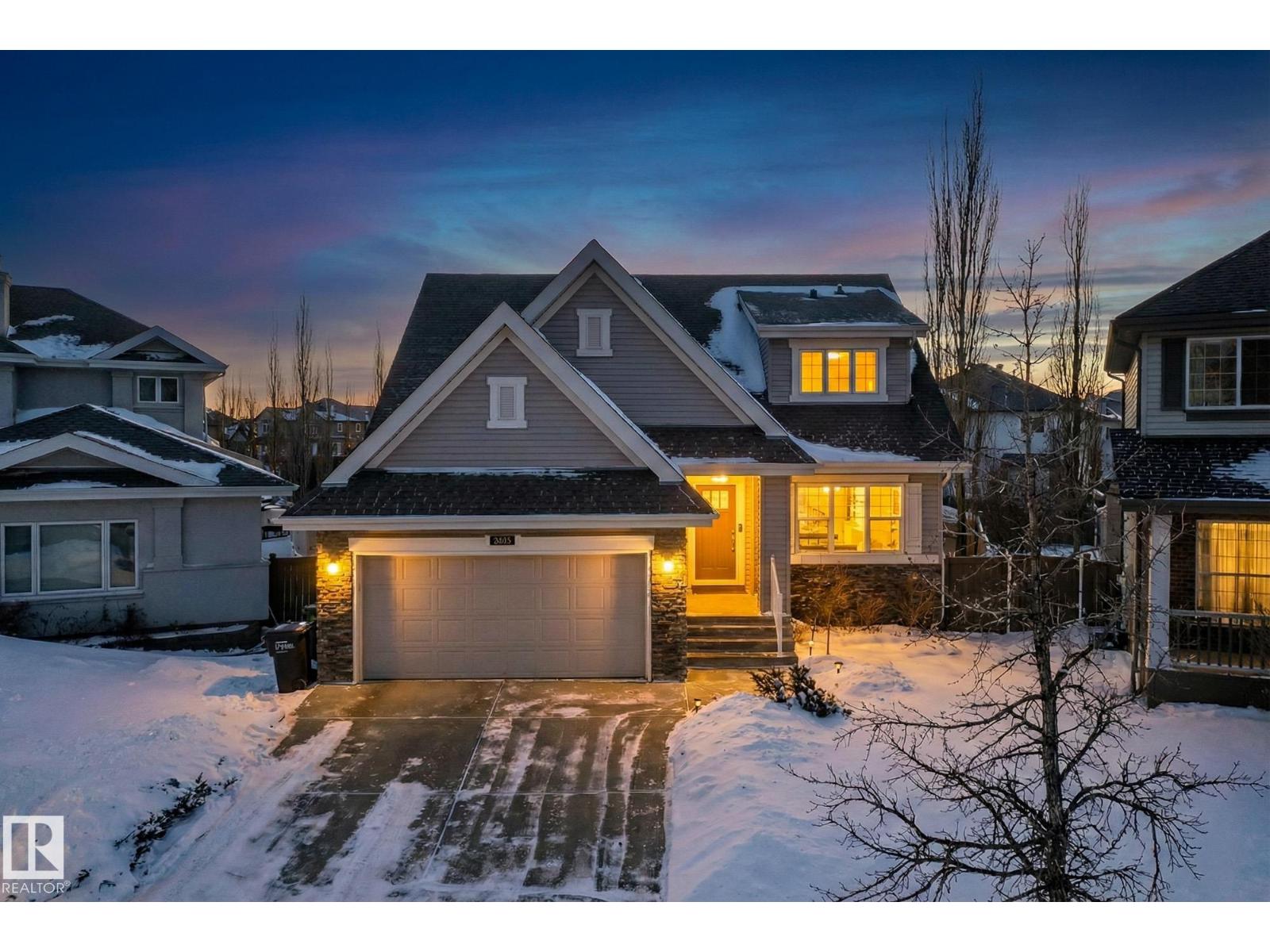 This beautiful, spacious bungalow with a unique loft design is located on a quiet crescent in the Hodgson community, with convenient access to both the Henday and Whitemud. It offers 4 beds, 4 baths (two with in-floor heating), two gas fireplaces, a main floor den, and a large laundry room with in-floor heating. The home showcases a highly functional layout. The gourmet kitchen features abundant counter and cabinet space, high-end appliances, granite countertops, and hardwood floors throughout. The private upstairs loft includes a bonus room, bedroom, and 4-piece bath. The fully finished basement offers a cozy family room, a large wet bar with two built-in bar fridges and a dishwasher, plus a theatre room with built-in surround sound. Additional features include a new roof, hot water tank, and washer and dryer (all installed in 2023), along with central air conditioning. The professionally landscaped yard with irrigation, a circular brick patio, and two sheds completes this exceptional, well-kept home. (33862073)