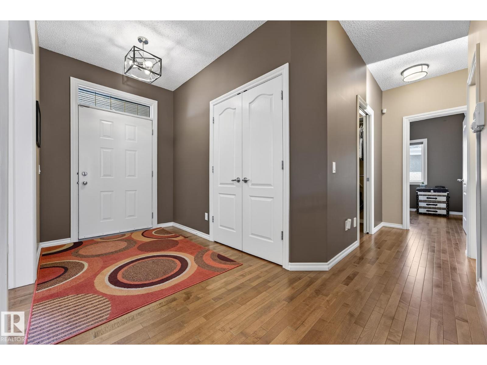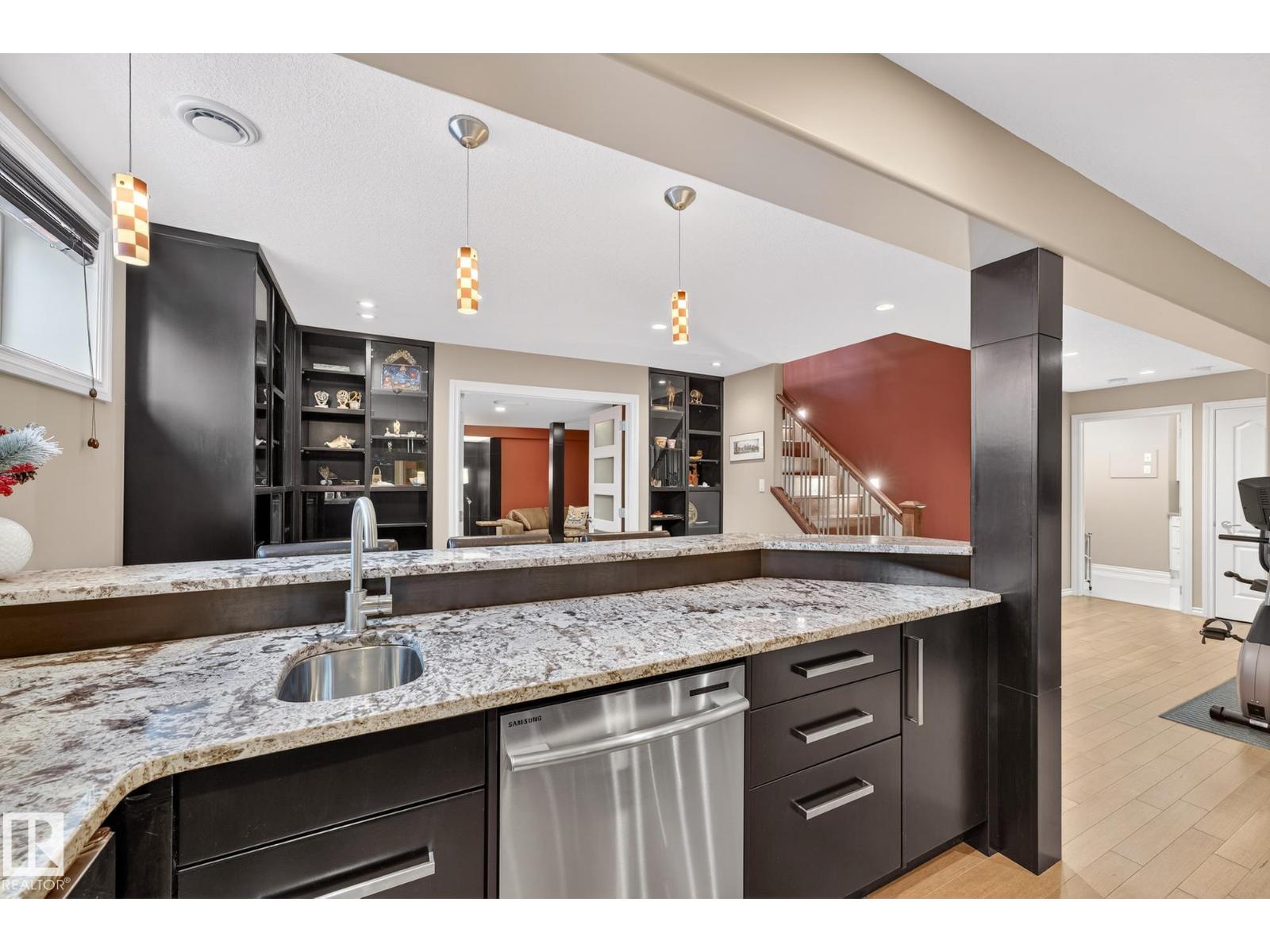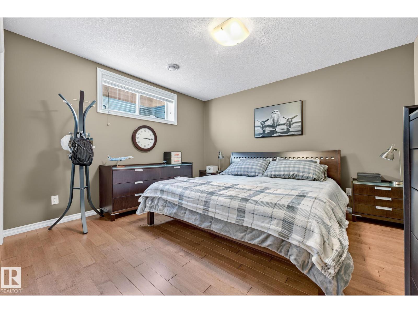 This beautiful, spacious bungalow with a unique loft design is located on a quiet crescent in the Hodgson community, with convenient access to both the Henday and Whitemud. It offers 4 beds, 4 baths (two with in-floor heating), two gas fireplaces, a main floor den, and a large laundry room with in-floor heating. The home showcases a highly functional layout. The gourmet kitchen features abundant counter and cabinet space, high-end appliances, granite countertops, and hardwood floors throughout. The private upstairs loft includes a bonus room, bedroom, and 4-piece bath. The fully finished basement offers a cozy family room, a large wet bar with two built-in bar fridges and a dishwasher, plus a theatre room with built-in surround sound. Additional features include a new roof, hot water tank, and washer and dryer (all installed in 2023), along with central air conditioning. The professionally landscaped yard with irrigation, a circular brick patio, and two sheds completes this exceptional, well-kept home. (33862073)
