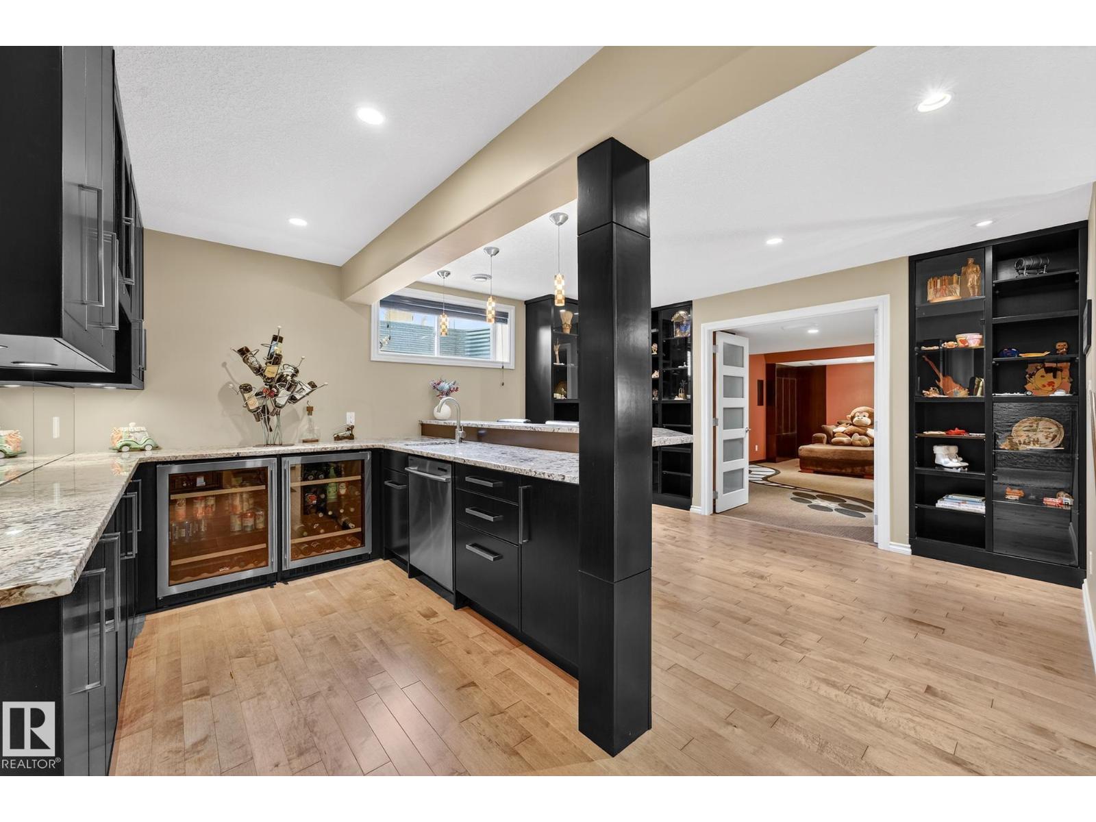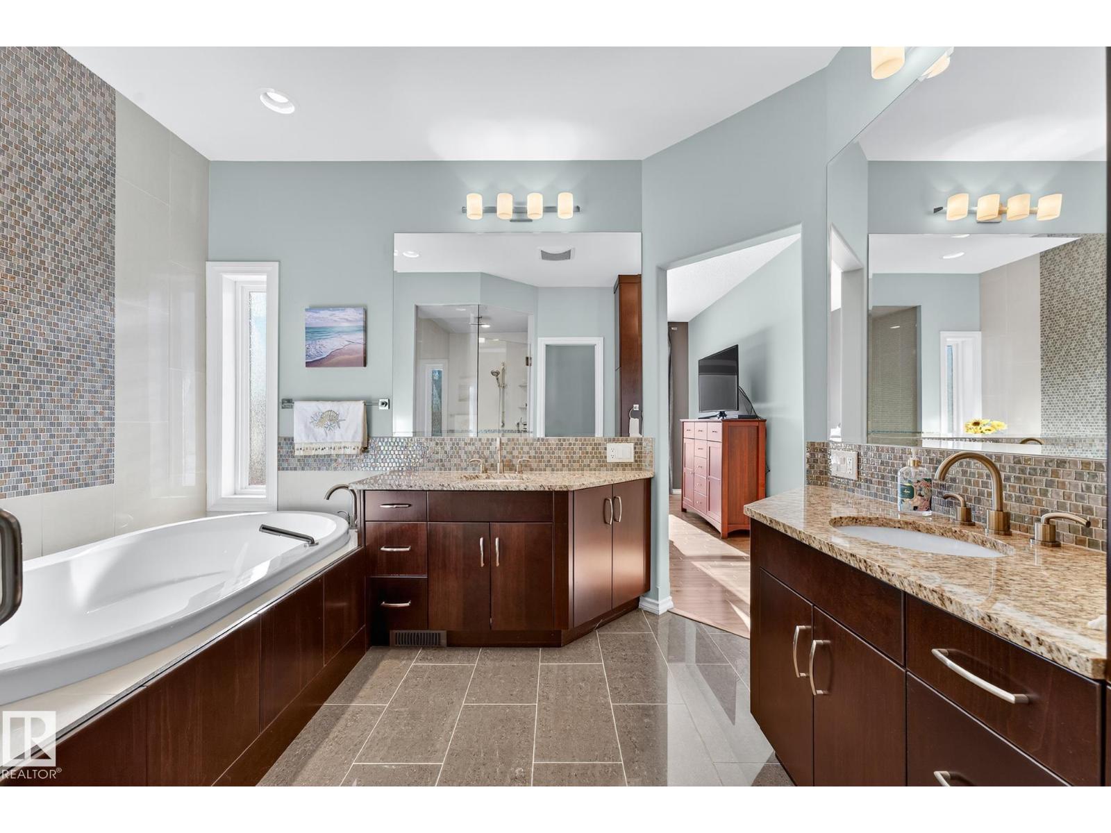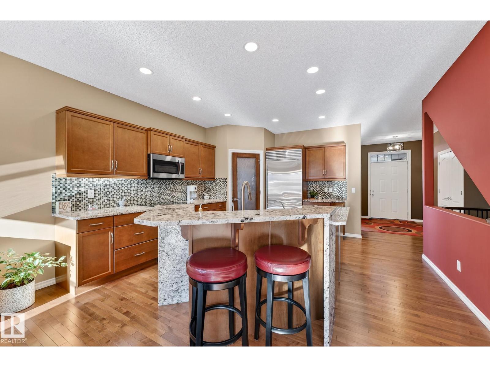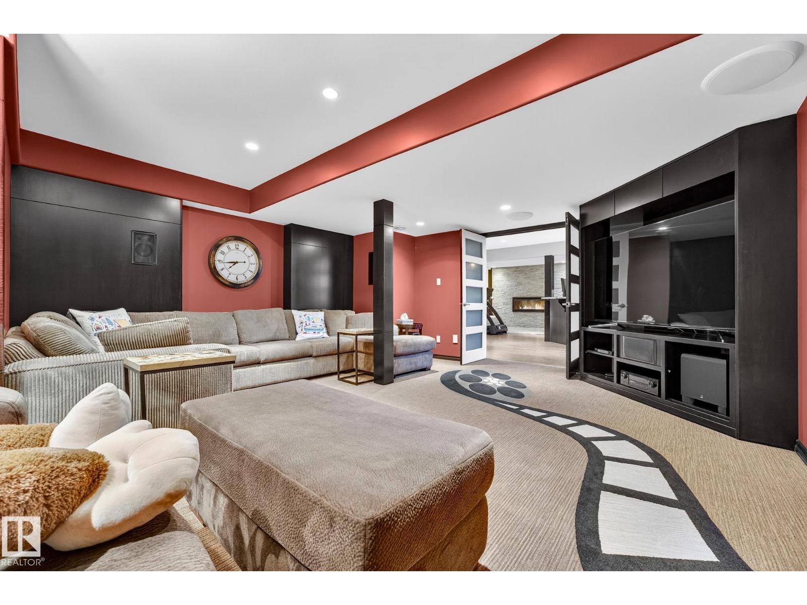 This beautiful, spacious bungalow with a unique loft design is located on a quiet crescent in the Hodgson community, with convenient access to both the Henday and Whitemud. It offers 4 beds, 4 baths (two with in-floor heating), two gas fireplaces, a main floor den, and a large laundry room with in-floor heating. The home showcases a highly functional layout. The gourmet kitchen features abundant counter and cabinet space, high-end appliances, granite countertops, and hardwood floors throughout. The private upstairs loft includes a bonus room, bedroom, and 4-piece bath. The fully finished basement offers a cozy family room, a large wet bar with two built-in bar fridges and a dishwasher, plus a theatre room with built-in surround sound. Additional features include a new roof, hot water tank, and washer and dryer (all installed in 2023), along with central air conditioning. The professionally landscaped yard with irrigation, a circular brick patio, and two sheds completes this exceptional, well-kept home. (33862073)