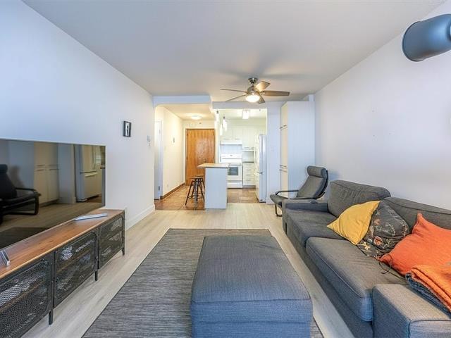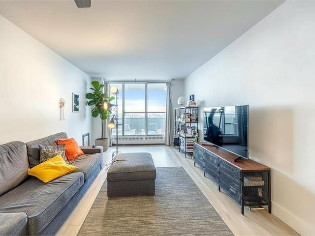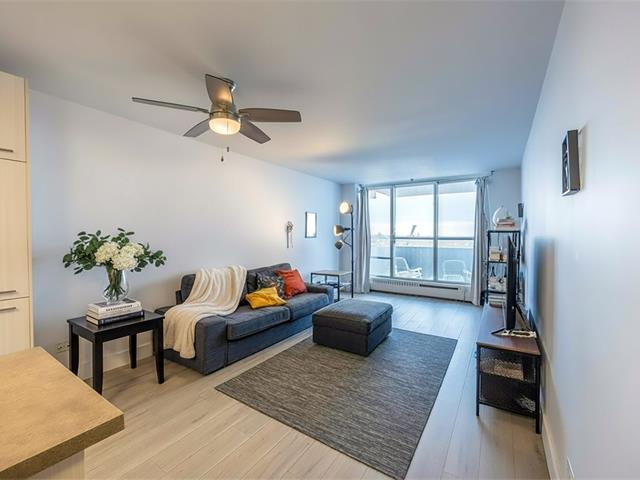 On the 16th floor of the prestigious Les Dauphins-sur-le-Parc building, discover spectacular views of eastern Montreal, the stadium, and the St. Lawrence River. This spacious 1-bedroom condo -- one of the largest in the building with extended living room and bedroom -- features recently renovated floors, kitchen, and bathroom. The side living room opens onto a sunny balcony flooded with natural light. Nestled in the heart of Plateau-Mont-Royal, facing majestic Lafontaine Park and near top restaurants and services, it offers absolute comfort and optimal security. On-site panoramic pool, gym, sauna, concierge, and laundry. (46714970)