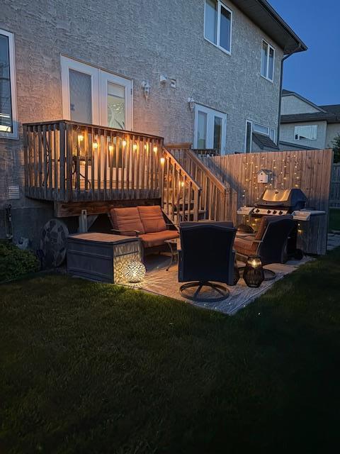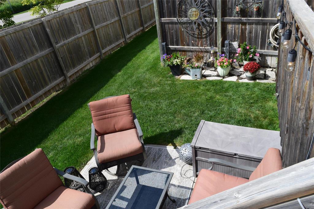 Back yard with privacy fences, small deck, patio area and flower garden