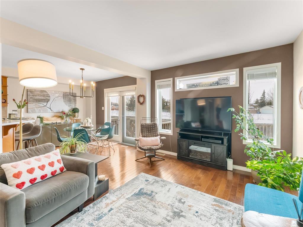Living room to dining room view. Garden doors to deck and West facing back yard. Amazing views of sun sets. Lots of warmth and sun in the back yard.