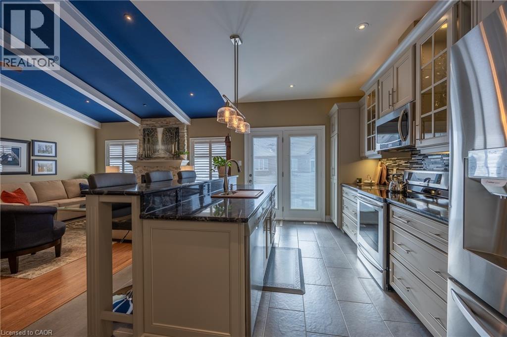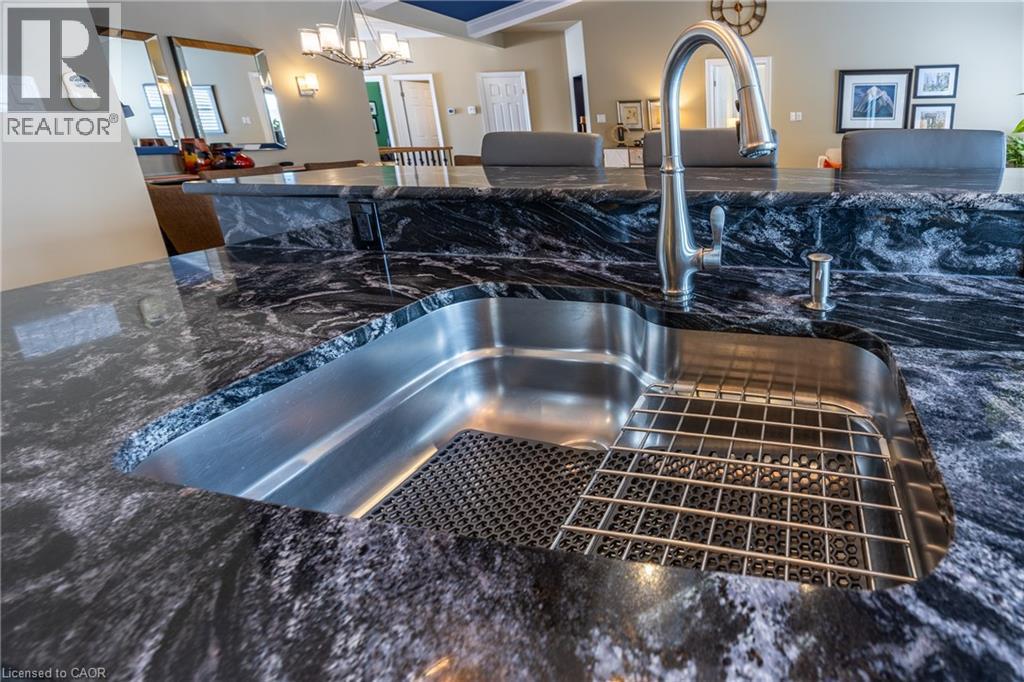Welcome to 27 Viking Lane, a highly coveted bungalow townhome offering a rare three-car garage configuration and one of the most sought-after floor plans in this exclusive 55+ adult lifestyle community. Offered for only the second time in over five years, this residence presents a unique opportunity to enjoy refined, low-maintenance living. Thoughtfully designed, the home offers 3 bedrooms, 3 bathrooms, and 2,763 sq. ft. of beautifully finished living space. Its stone and brick exterior, concrete driveway, and manicured landscaping create curb appeal, while a low monthly fee of $217 covers snow removal, grass cutting, and irrigation for effortless ownership. Inside, a generous 6-foot-wide foyer opens to a bright, open-concept main level with 9-foot ceilings. The kitchen, dining, and living areas flow seamlessly together, ideal for everyday comfort. Quality craftsmanship is evident throughout, with bamboo and ceramic flooring, crown molding, vaulted ceilings, pot lighting, upgraded trim, and refined plumbing fixtures. The living room is anchored by a dramatic floor-to-ceiling stone fireplace. The upgraded kitchen combines style and function, featuring granite countertops, built-in stainless-steel appliances, an induction cooktop, detailed island millwork, and elegant glass display cabinetry. A convenient laundry room with pantry and direct garage access enhances practicality. The primary suite offers a spacious walk-in closet and an elegant ensuite featuring granite counters, double sinks, a glass shower, and a deep soaker tub. The fully finished lower level offers luxury laminate flooring, a built-in wet bar with fridge, home theatre with 132-inch screen and surround sound, third bedroom, full bathroom, and versatile bonus room. Residents enjoy access to a 9-hole golf course, pickleball courts, dog park, restaurant, and lakefront amenities on Lake Erie, just minutes from the shops, dining, and waterfront charm of Port Dover. Come see for yourself! (70194535)