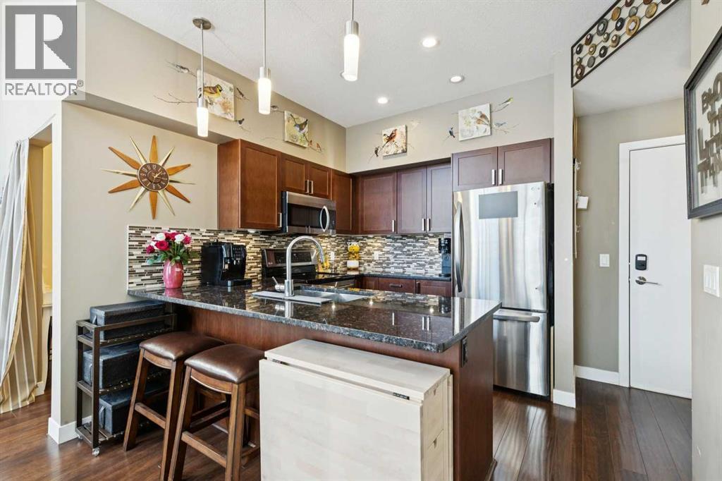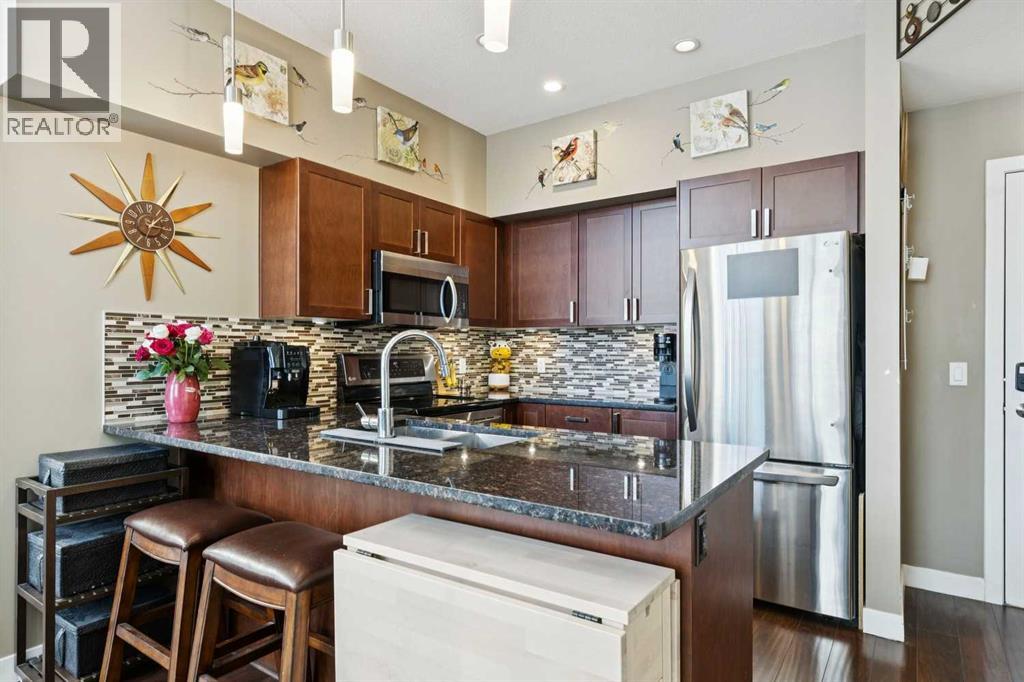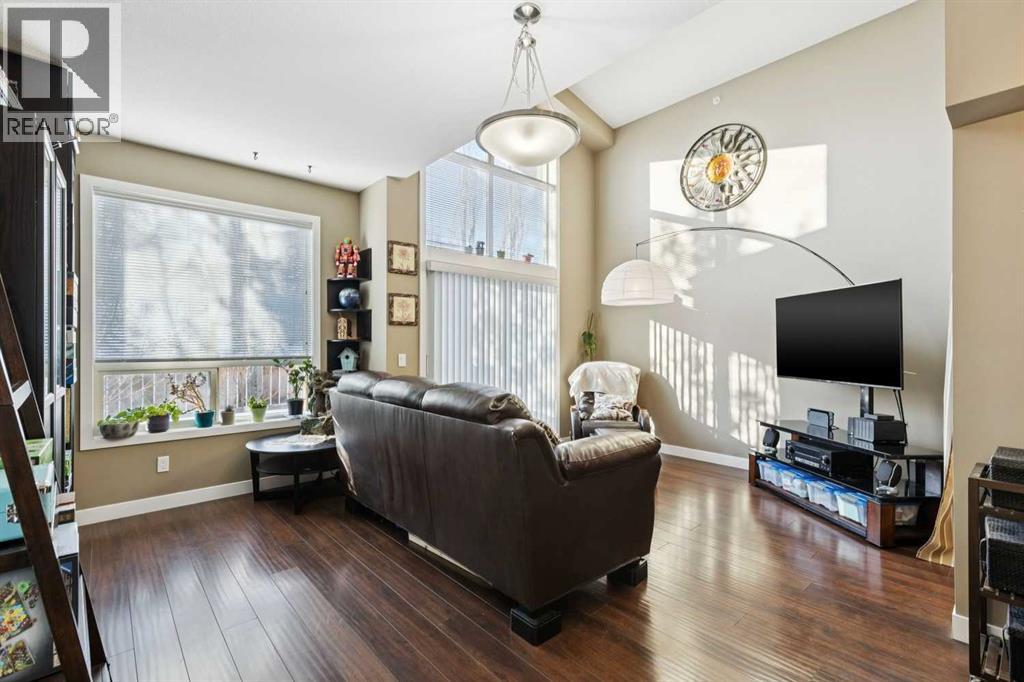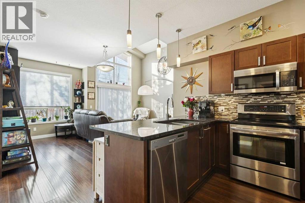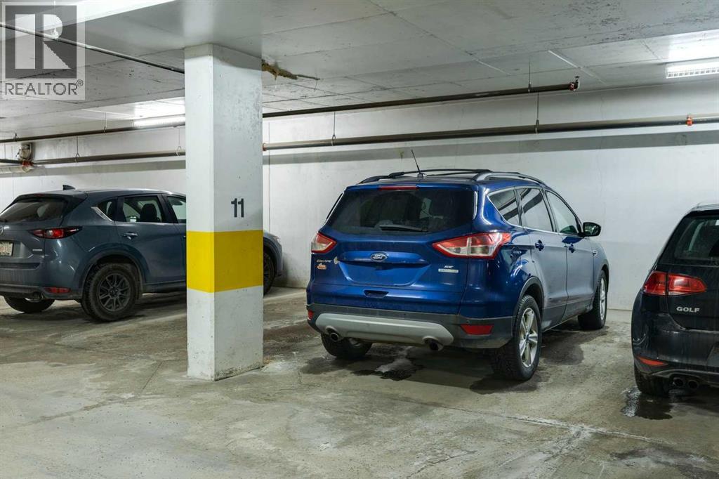 Welcome to Stonecroft Highland Park. Situated on the top floor this single bedroom + den unit features 15ft vaulted ceilings providing a ton of natural light - rare for apartment style condos. Combined with large windows, the height and design create an open, light-filled space that immediately stands out. The functional layout offers thoughtfully designed living throughout. The chefs style kitchen provides excellent cabinet and counter space, complete with granite countertops, stainless steel appliances, and a functional breakfast bar. The primary bedroom is spacious and bright, with large windows and his and hers closets for added storage and organization. A generous 4 piece bathroom and versatile den offer flexibility for a home office, guest area, or additional living space. Additional features include a stacked in-suite washer and dryer, private patio, heated underground parking stall, and separate storage locker. Overall this unit shows pride of ownership throughout! Condo fees include heat and water. The building is well cared for and offers a social room and lots of covered visitor parking. Located on a quiet street next to an off-leash dog park, it provides convenient access to Deerfoot Trail, Centre Street, nearby shops, amenities, and downtown by public transit. An excellent opportunity for comfortable living in a desirable and convenient location. Top floor units in this building don't last long so be sure to schedule your tour before its gone! (31675640)