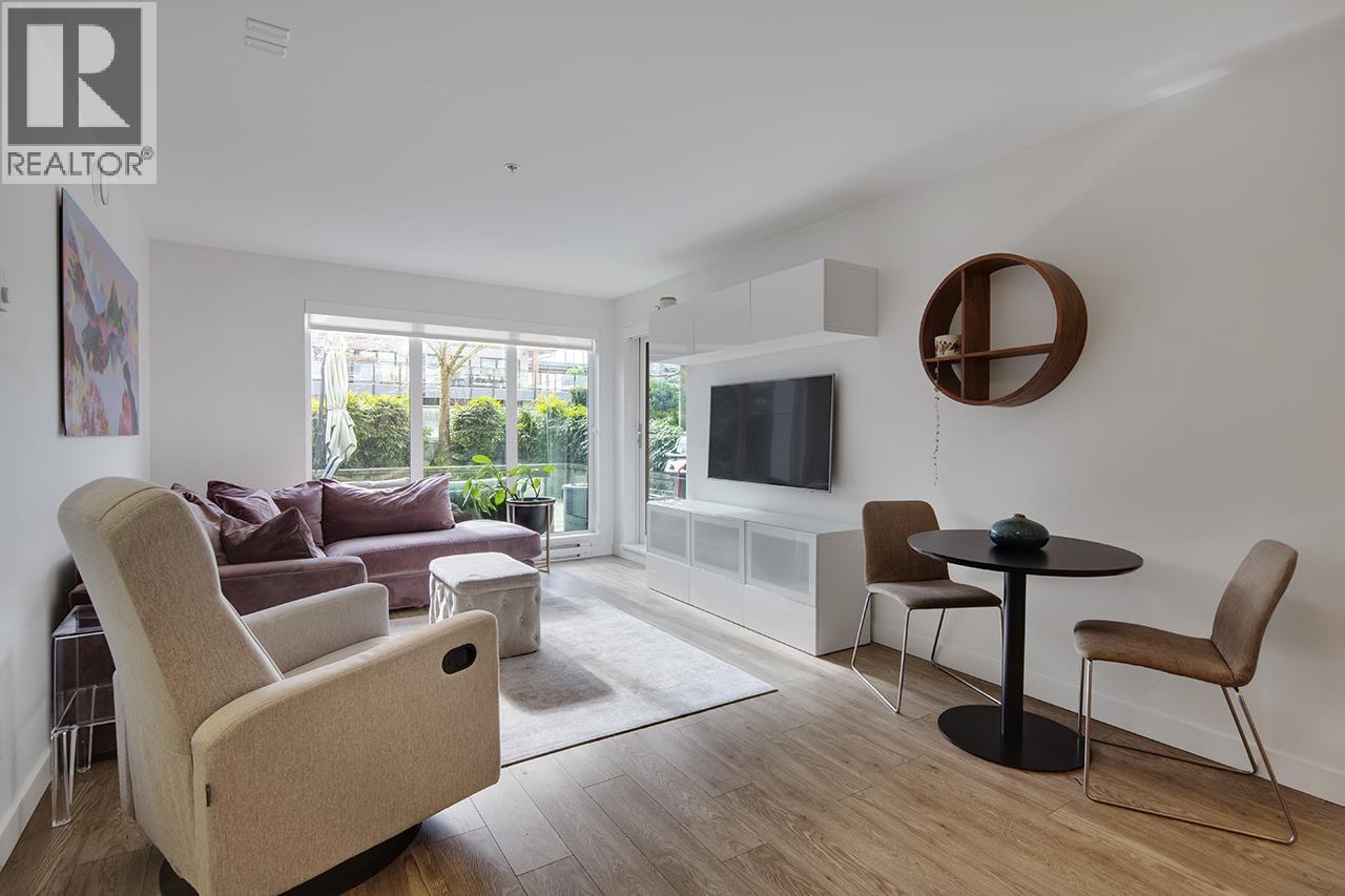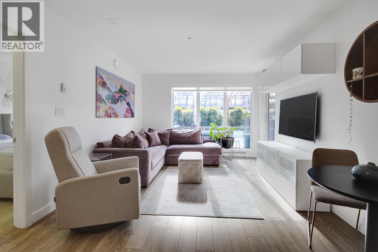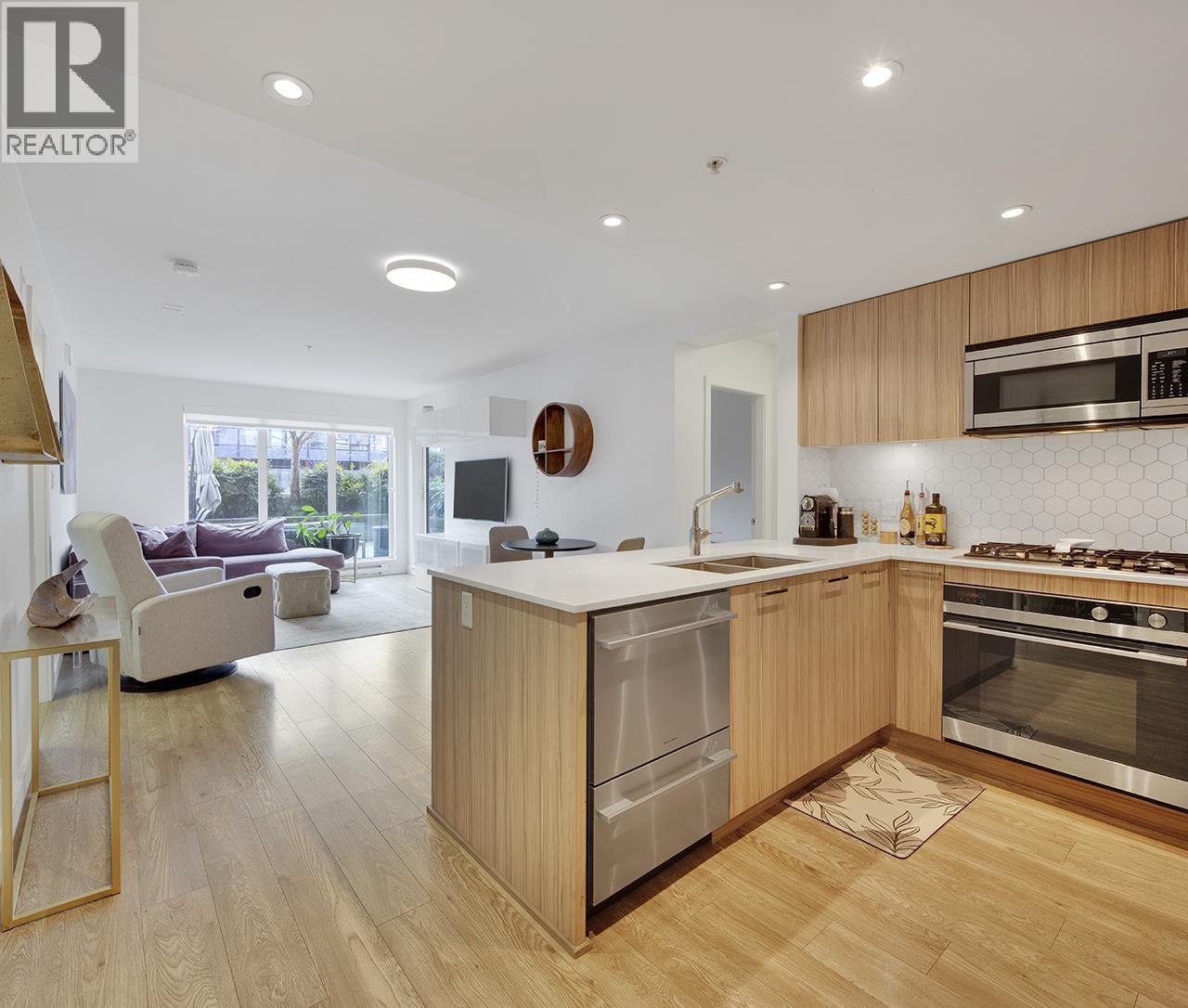 Step into this exceptional south facing 3-bedroom, 2-bathroom with XL 421sf south-facing patio! 3rd bedroom is a den and can be used as bedroom. The open-concept design seamlessly connects the kitchen, living and dining areas that are flooded with natural light from floor-to-ceiling windows. The gourmet kitchen features quartz countertops, inviting island bar, and top-of-the-line Fisher Paykel appliances. Outside, the sprawling sun soaked deck offers plenty of space for dining and relaxing. Located in a vibrant neighbourhood, just steps away from shops, transit, cafes, and scenic trails. In-suite laundry and 1 parking space, this pet-friendly home offers an unparalleled opportunity for luxurious urban living. OPEN HOUSE Sat Feb 28 2-4pm (32481953)