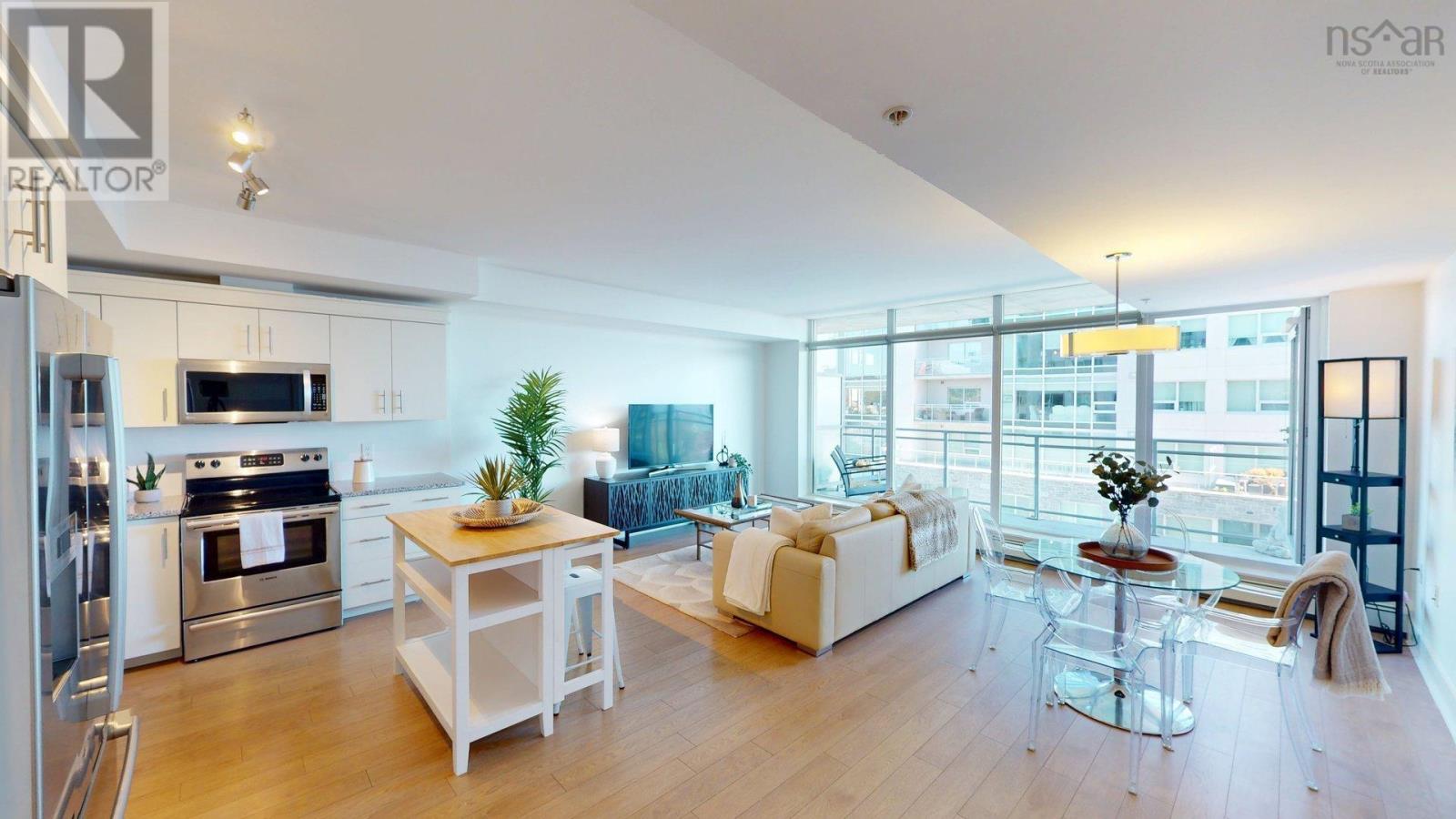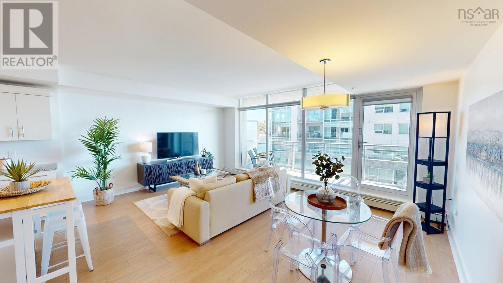 Waterfront living! Fantastic views of Harbour and Canal! Downtown! Want more? Yes? Good, because there is lots more! Affordable home ownership in a highly desirable location with huge future upside potential. Welcome home to The Anchorage and enjoy urban waterfront living. This perfect sized one bedroom unit is located in a great part of the building which maximizes natural light and amazing views through the floor to ceiling windows. The functional open concept layout of the living, dining and kitchen is an excellent space for living and entertaining. This area flows nicely to the spacious balcony which provides added outdoor living space. The large bedroom offers enough space to be a private oasis and has a great walk-in closet. The well appointed bath and separate in-unit laundry complete the well designed space. The Kings Wharf development is sought after and The Anchorage is a welcoming and attentively managed building with an amazing live-in superintendent. All of this combined with underground parking and an additional storage unit are why the many great neighbours call this building home. Outside this waterfront home, all amenities are near. Including: walking/biking trails, shopping, public transit, the harbour ferry, marinas and all that vibrant Downtown Dartmouth has to offer. Fantastic restaurants, independent one-of-a-kind shops and several cafe's are just steps away. Be sure to view the virtual tour and book your private viewing today! (231993458)