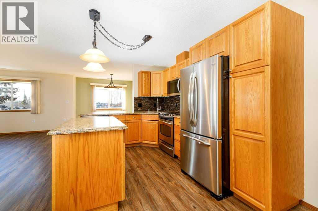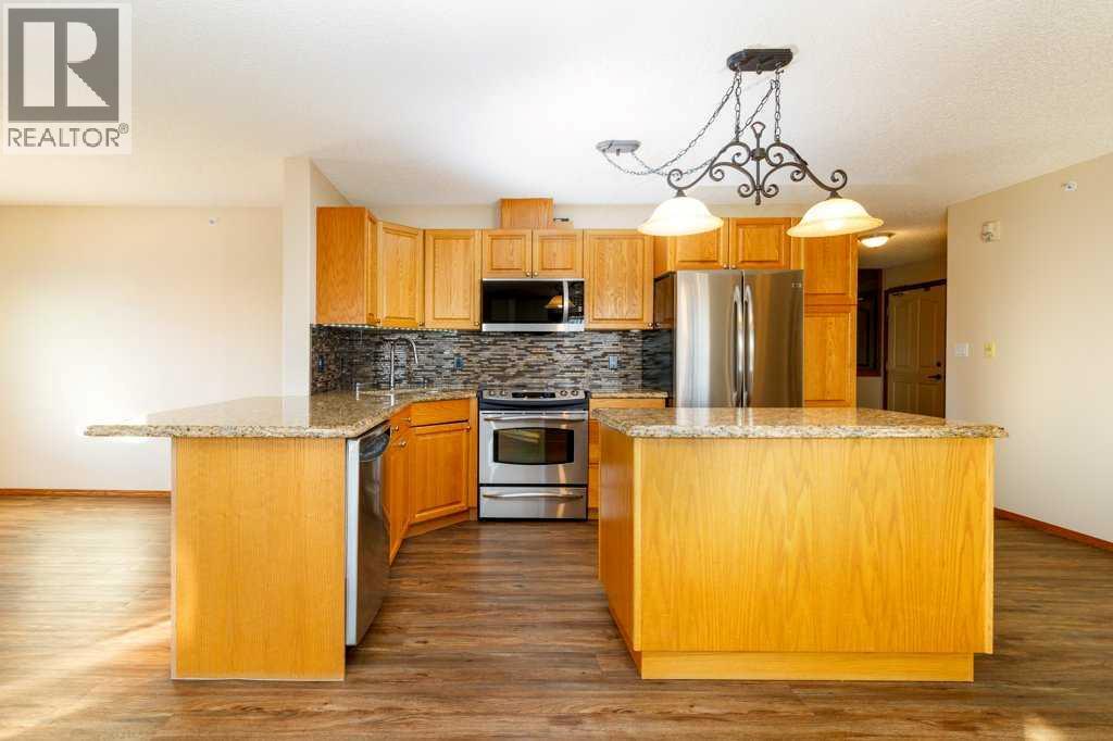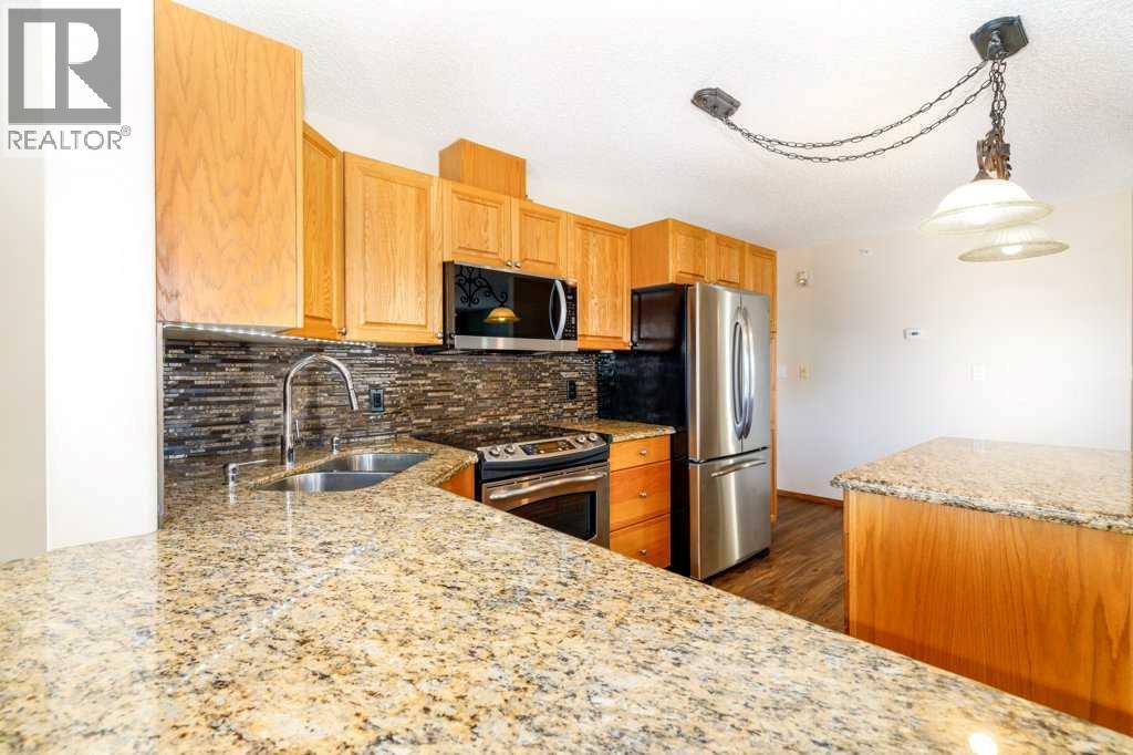Immaculate-Spacious-Open-Updated-Top Floor-Corner Unit. One of the most sought after condo complexes in Red Deer! Tons of natural light with this corner unit facing south east. Beautiful kitchen with granite counter tops, island, upgraded appliances and lots of cabinets. Huge living room and corner gas fireplace. New laminate flooring in living room, kitchen and hallways. Spacious laundry room with separate new washer and dryer. Even room for a freezer and storage cabinet. The primary bedroom is large enough for king size furniture, double closets and 3pc bath. Main bath has a 6' tub. The underground heated parking spot is one of the best, very close to the elevator, close to all amenities in Red Deer's South East! Grocery stores, restaurants, coffee shops & Collicutt Centre. The condo amenities are also a real plus: Guest suite, social room with pool table and shuffle board, library and work out room. Truly a must see and a pleasure to show! (31679019)
