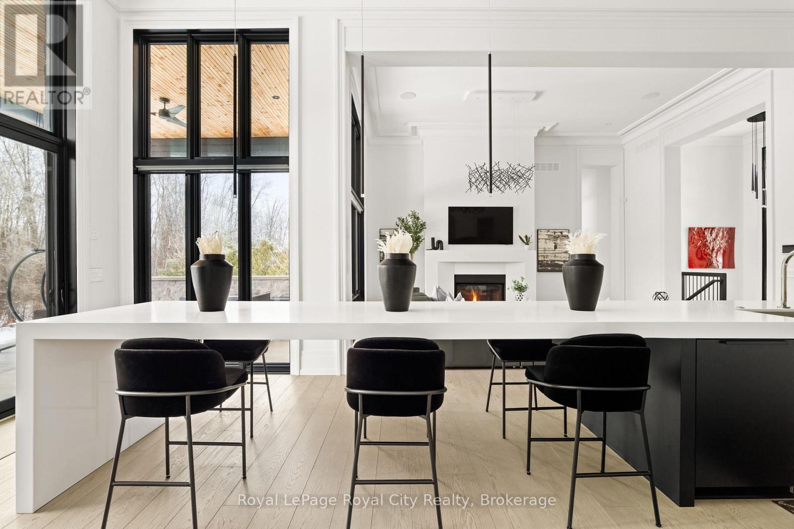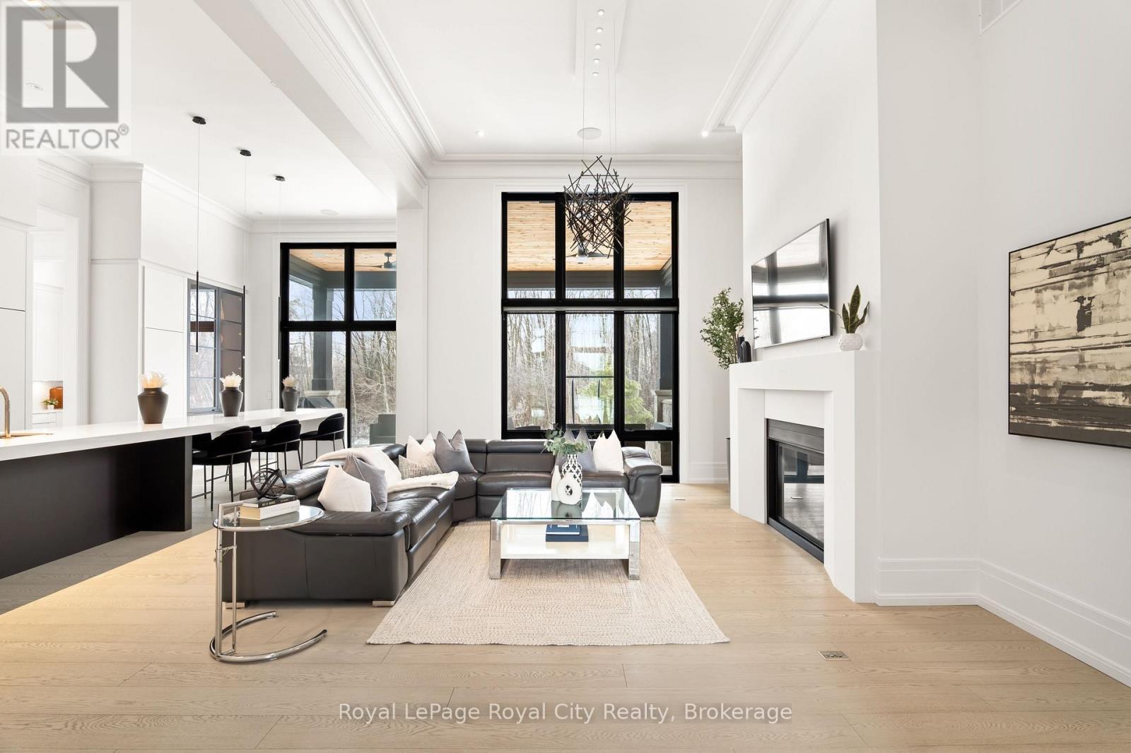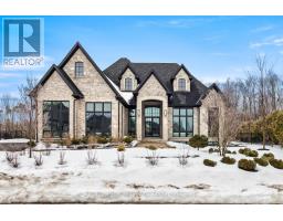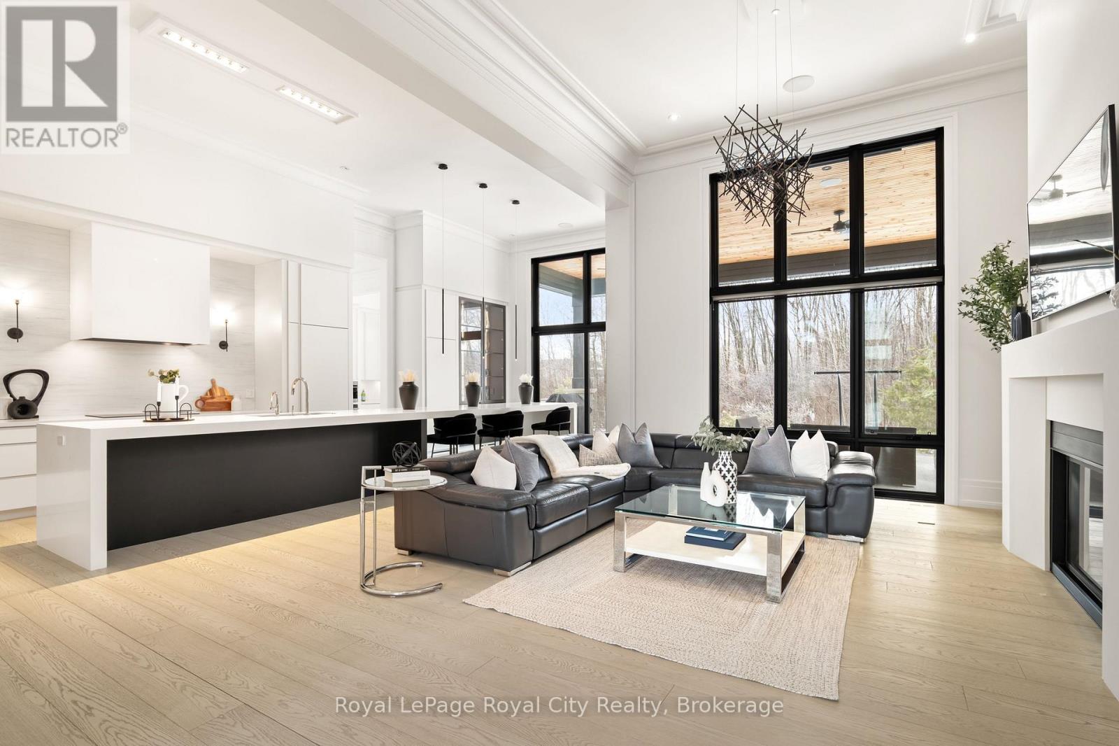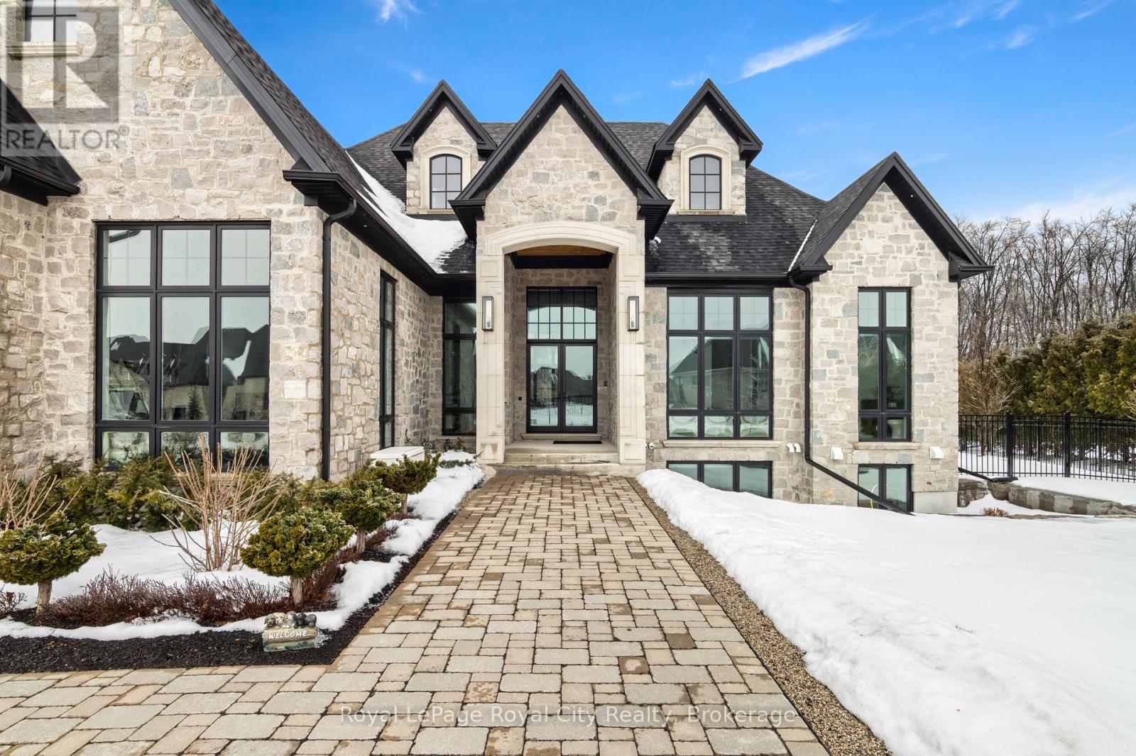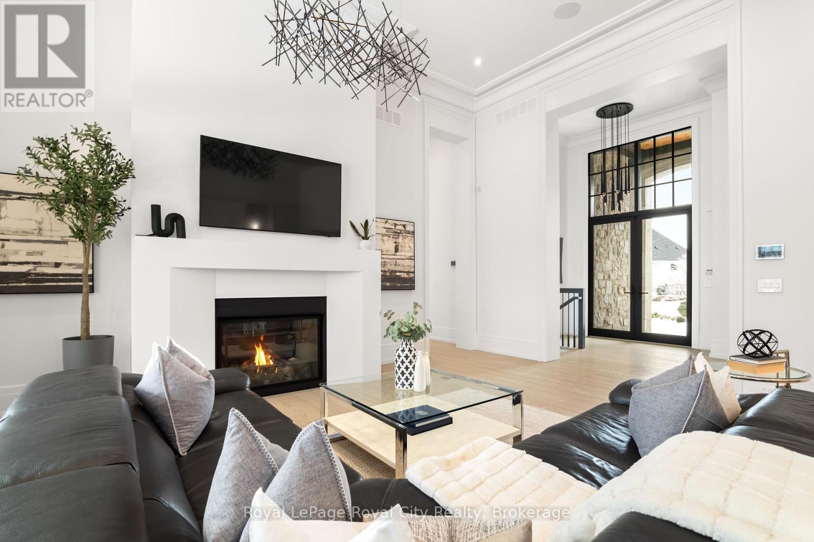 Welcome to life inside Heritage Lake Estates - a private, gated enclave in Puslinch known for its mature surroundings and beautiful custom homes. Set on a premium half-acre pie-shaped lot backing onto mature treelines, this custom stone bungalow offers privacy without compromise. With 2,252 square feet on the main floor and soaring 14-foot ceilings, the principal living space is defined by symmetry, scale, and natural light. A custom fireplace anchors the living room, while upgraded crown moulding and floor-to-ceiling windows create a refined yet inviting atmosphere.The kitchen and dining area are gallery-inspired in design, centred around a striking 21-foot stone waterfall island with seating for eight. Integrated cabinetry conceals premium WOLF appliances for a seamless aesthetic. Heated floors, custom lighting, and electric blinds reflect the many thoughtful upgrades woven throughout the home. Step outside to a covered back patio complete with built-in heaters and an impressive 350 sq ft gas fire feature, overlooking the fenced yard and tranquil forest backdrop - ideal for elevated, year-round outdoor living.The primary suite is a private retreat, offering 12ft ceilings, floor to ceiling windows, a generous walk-in closet and spa-inspired five-piece ensuite with Jet Spa shower system. Across from this, the well-appointed laundry room and additional main-floor bedroom, featuring with its own ensuite bath and walk-in closet, complete the main level. The fully finished lower level adds two bedrooms, each accompanied by an ensuite bathroom, a spacious recreation room with custom fireplace, dedicated office space, and a home gym - perfectly suited for growing families or multi-generational living. A functional mudroom with built-in cabinetry offers direct access to the heated three-car garage and walk-down access to the basement. 153 Heritage Lake Drive invites you to embrace a quiet kind of luxury, framed by the serenity of Puslinch Lake. (42204802)