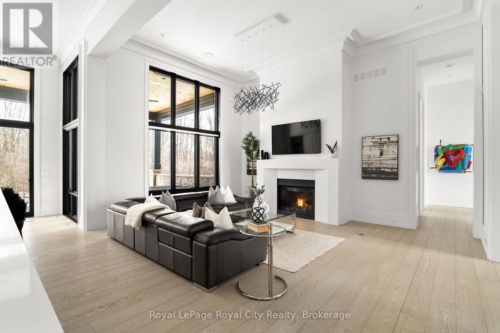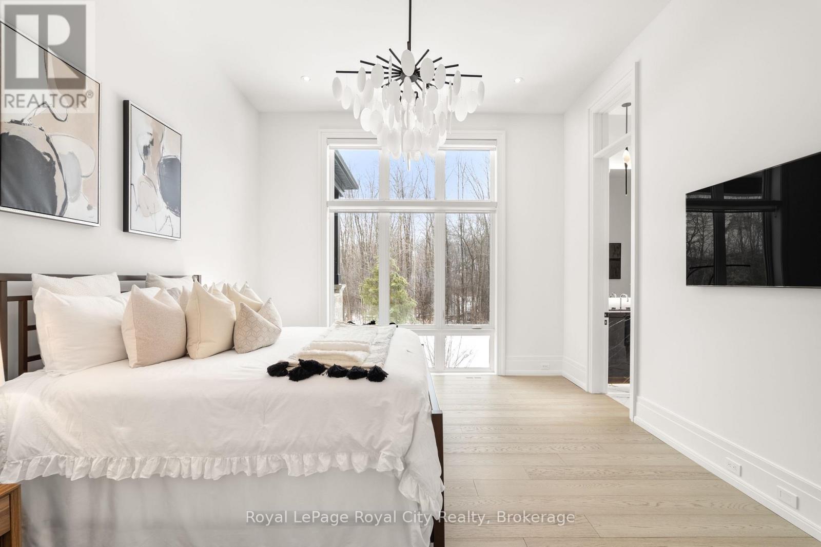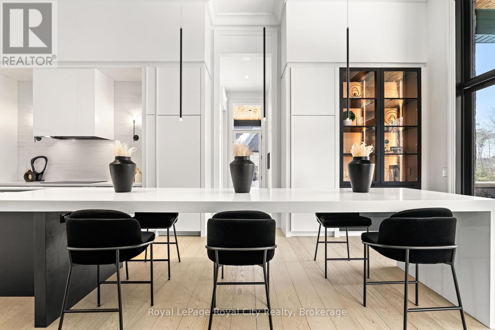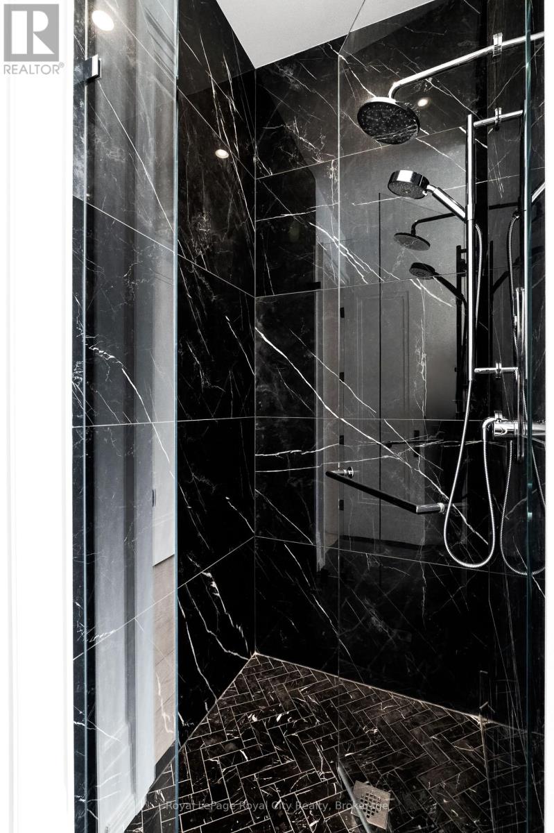 Welcome to life inside Heritage Lake Estates - a private, gated enclave in Puslinch known for its mature surroundings and beautiful custom homes. Set on a premium half-acre pie-shaped lot backing onto mature treelines, this custom stone bungalow offers privacy without compromise. With 2,252 square feet on the main floor and soaring 14-foot ceilings, the principal living space is defined by symmetry, scale, and natural light. A custom fireplace anchors the living room, while upgraded crown moulding and floor-to-ceiling windows create a refined yet inviting atmosphere.The kitchen and dining area are gallery-inspired in design, centred around a striking 21-foot stone waterfall island with seating for eight. Integrated cabinetry conceals premium WOLF appliances for a seamless aesthetic. Heated floors, custom lighting, and electric blinds reflect the many thoughtful upgrades woven throughout the home. Step outside to a covered back patio complete with built-in heaters and an impressive 350 sq ft gas fire feature, overlooking the fenced yard and tranquil forest backdrop - ideal for elevated, year-round outdoor living.The primary suite is a private retreat, offering 12ft ceilings, floor to ceiling windows, a generous walk-in closet and spa-inspired five-piece ensuite with Jet Spa shower system. Across from this, the well-appointed laundry room and additional main-floor bedroom, featuring with its own ensuite bath and walk-in closet, complete the main level. The fully finished lower level adds two bedrooms, each accompanied by an ensuite bathroom, a spacious recreation room with custom fireplace, dedicated office space, and a home gym - perfectly suited for growing families or multi-generational living. A functional mudroom with built-in cabinetry offers direct access to the heated three-car garage and walk-down access to the basement. 153 Heritage Lake Drive invites you to embrace a quiet kind of luxury, framed by the serenity of Puslinch Lake. (42204802)