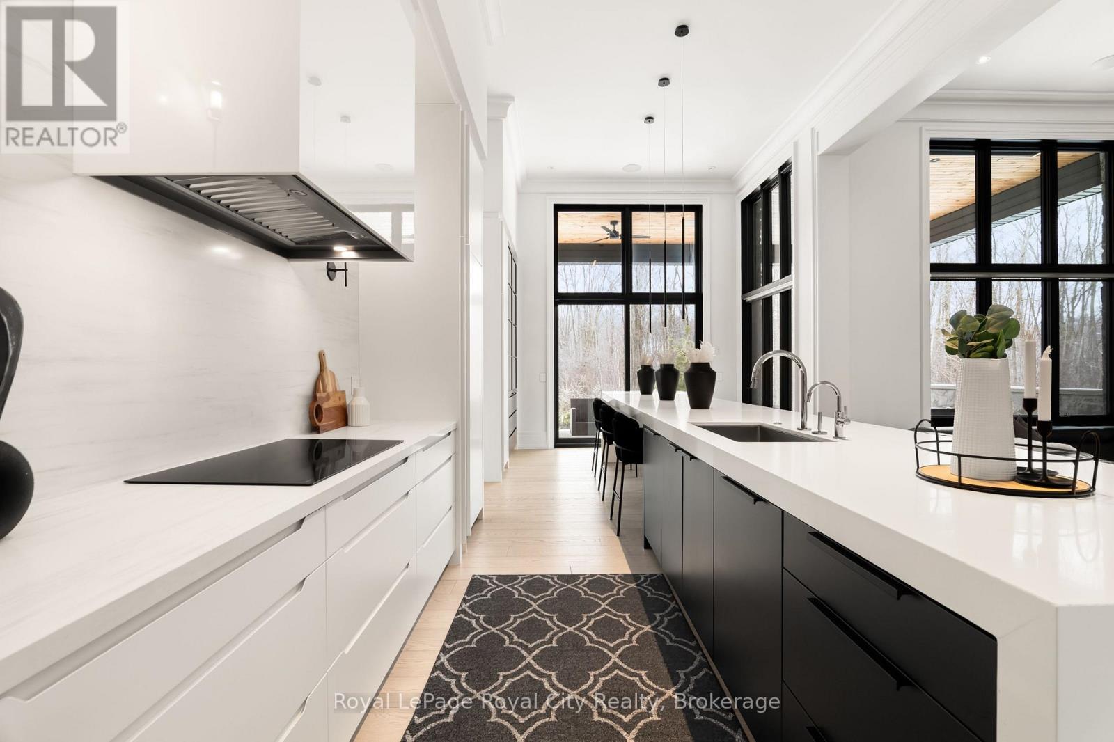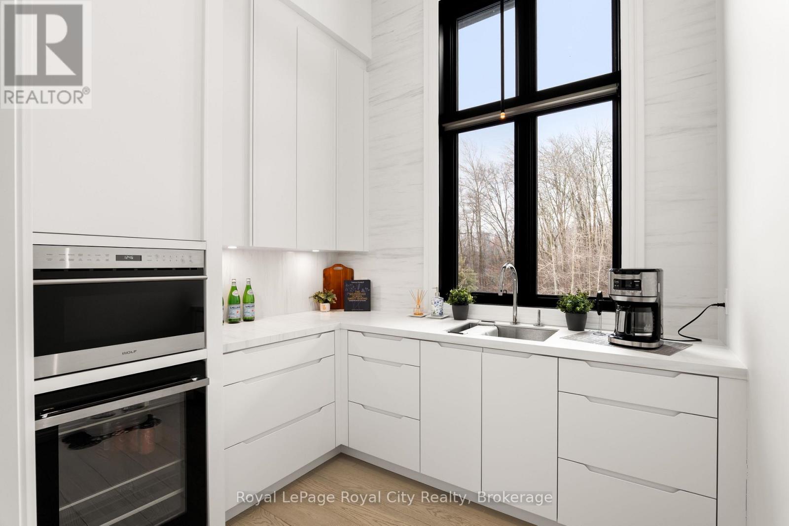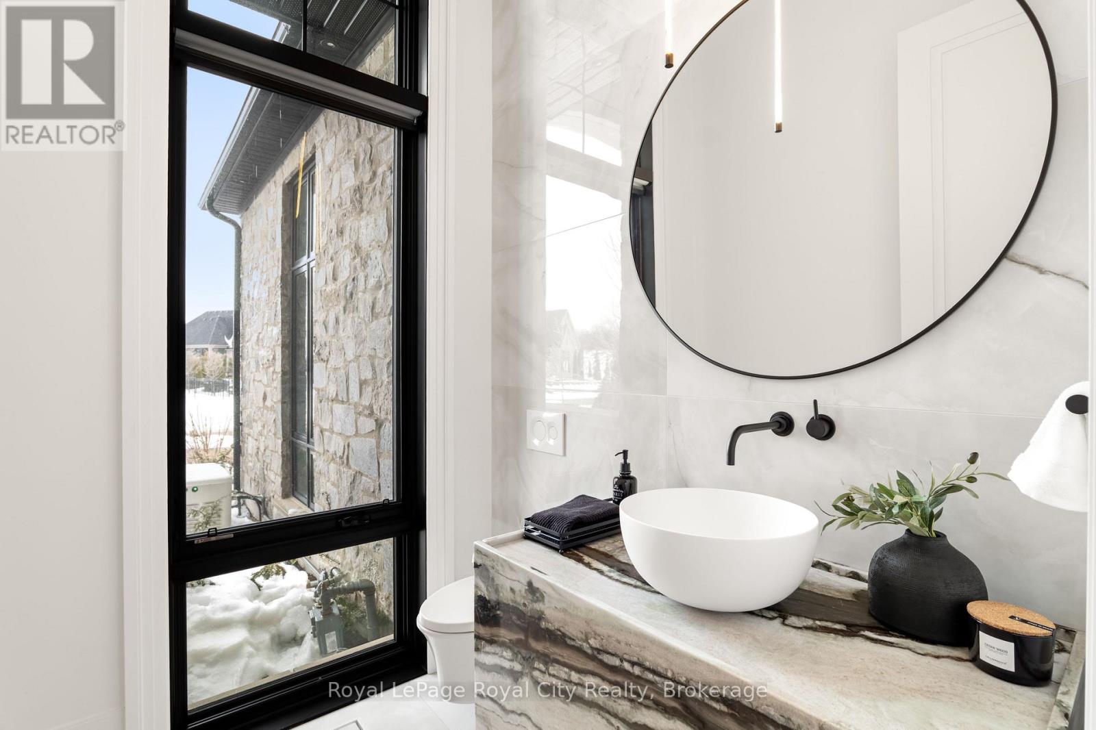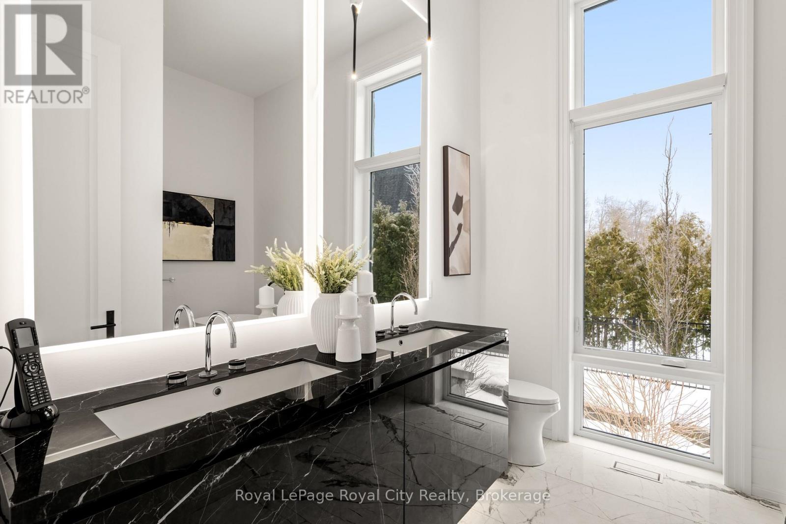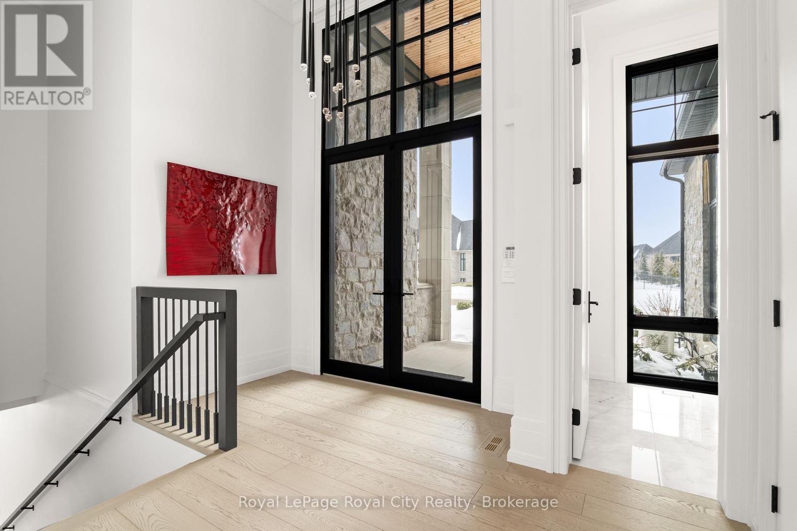 Welcome to life inside Heritage Lake Estates - a private, gated enclave in Puslinch known for its mature surroundings and beautiful custom homes. Set on a premium half-acre pie-shaped lot backing onto mature treelines, this custom stone bungalow offers privacy without compromise. With 2,252 square feet on the main floor and soaring 14-foot ceilings, the principal living space is defined by symmetry, scale, and natural light. A custom fireplace anchors the living room, while upgraded crown moulding and floor-to-ceiling windows create a refined yet inviting atmosphere.The kitchen and dining area are gallery-inspired in design, centred around a striking 21-foot stone waterfall island with seating for eight. Integrated cabinetry conceals premium WOLF appliances for a seamless aesthetic. Heated floors, custom lighting, and electric blinds reflect the many thoughtful upgrades woven throughout the home. Step outside to a covered back patio complete with built-in heaters and an impressive 350 sq ft gas fire feature, overlooking the fenced yard and tranquil forest backdrop - ideal for elevated, year-round outdoor living.The primary suite is a private retreat, offering 12ft ceilings, floor to ceiling windows, a generous walk-in closet and spa-inspired five-piece ensuite with Jet Spa shower system. Across from this, the well-appointed laundry room and additional main-floor bedroom, featuring with its own ensuite bath and walk-in closet, complete the main level. The fully finished lower level adds two bedrooms, each accompanied by an ensuite bathroom, a spacious recreation room with custom fireplace, dedicated office space, and a home gym - perfectly suited for growing families or multi-generational living. A functional mudroom with built-in cabinetry offers direct access to the heated three-car garage and walk-down access to the basement. 153 Heritage Lake Drive invites you to embrace a quiet kind of luxury, framed by the serenity of Puslinch Lake. (42204802)