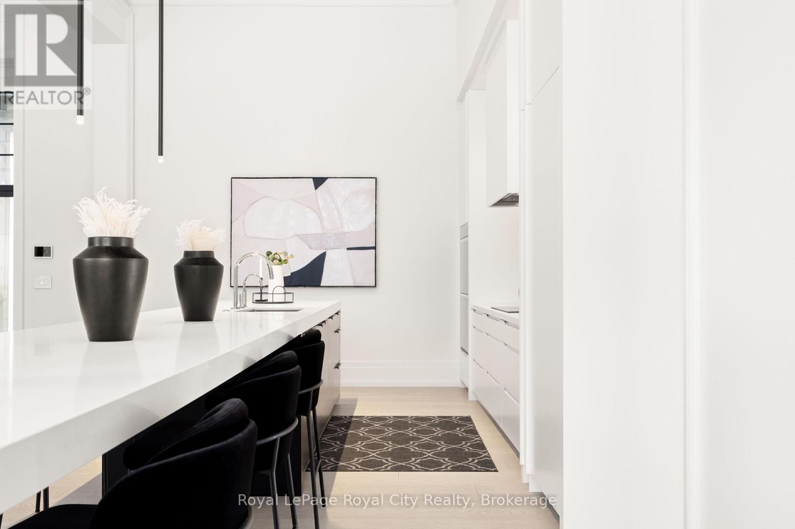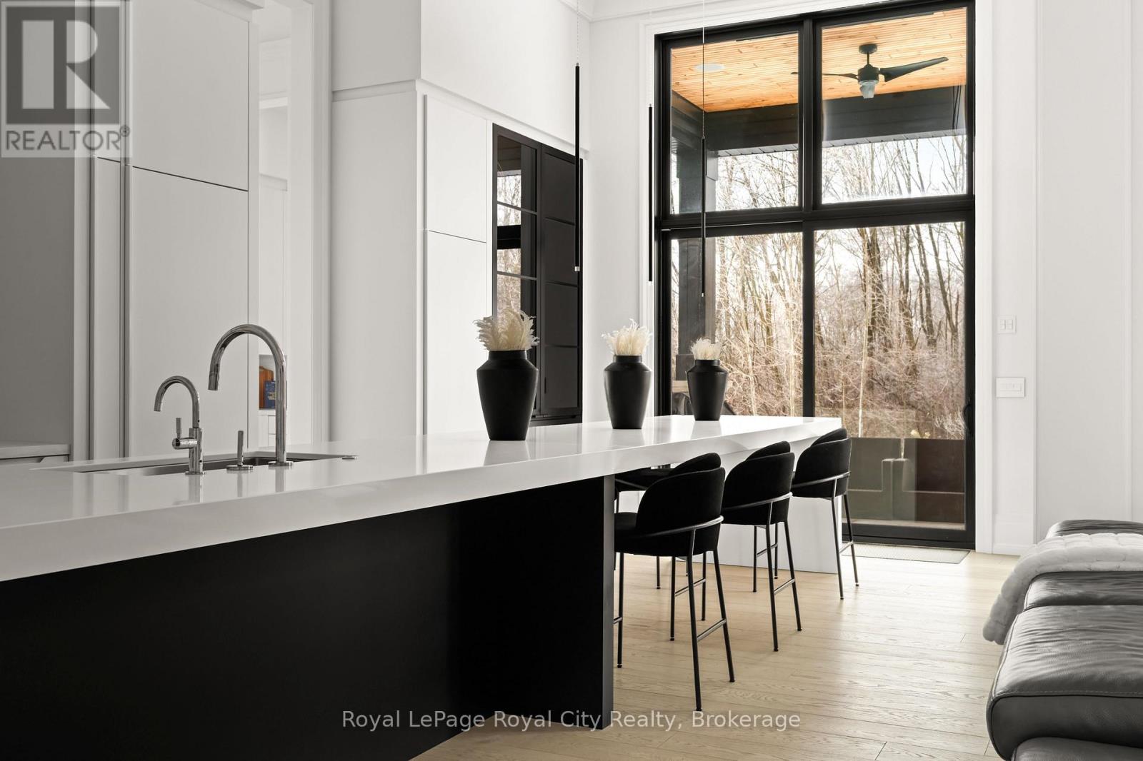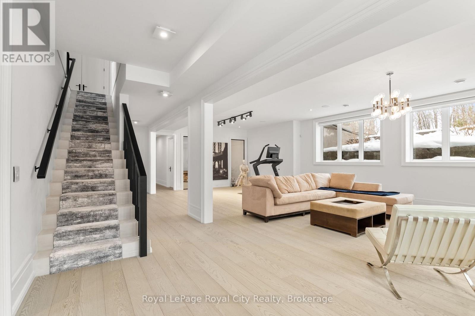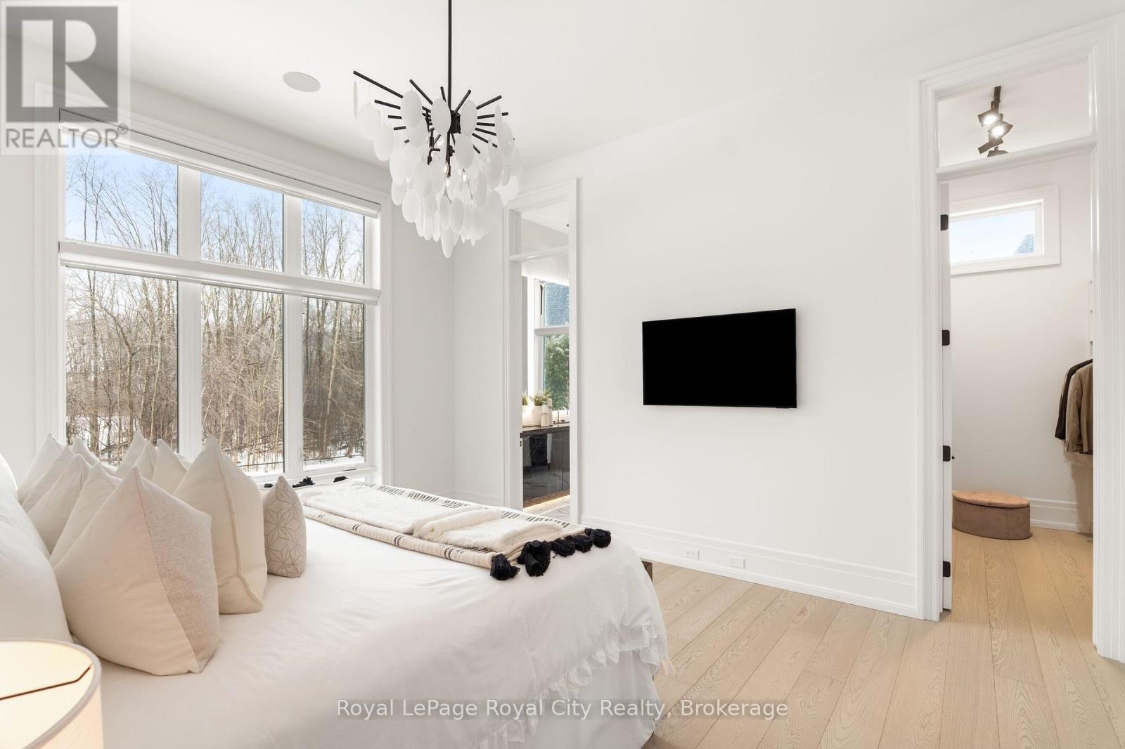 Welcome to life inside Heritage Lake Estates - a private, gated enclave in Puslinch known for its mature surroundings and beautiful custom homes. Set on a premium half-acre pie-shaped lot backing onto mature treelines, this custom stone bungalow offers privacy without compromise. With 2,252 square feet on the main floor and soaring 14-foot ceilings, the principal living space is defined by symmetry, scale, and natural light. A custom fireplace anchors the living room, while upgraded crown moulding and floor-to-ceiling windows create a refined yet inviting atmosphere.The kitchen and dining area are gallery-inspired in design, centred around a striking 21-foot stone waterfall island with seating for eight. Integrated cabinetry conceals premium WOLF appliances for a seamless aesthetic. Heated floors, custom lighting, and electric blinds reflect the many thoughtful upgrades woven throughout the home. Step outside to a covered back patio complete with built-in heaters and an impressive 350 sq ft gas fire feature, overlooking the fenced yard and tranquil forest backdrop - ideal for elevated, year-round outdoor living.The primary suite is a private retreat, offering 12ft ceilings, floor to ceiling windows, a generous walk-in closet and spa-inspired five-piece ensuite with Jet Spa shower system. Across from this, the well-appointed laundry room and additional main-floor bedroom, featuring with its own ensuite bath and walk-in closet, complete the main level. The fully finished lower level adds two bedrooms, each accompanied by an ensuite bathroom, a spacious recreation room with custom fireplace, dedicated office space, and a home gym - perfectly suited for growing families or multi-generational living. A functional mudroom with built-in cabinetry offers direct access to the heated three-car garage and walk-down access to the basement. 153 Heritage Lake Drive invites you to embrace a quiet kind of luxury, framed by the serenity of Puslinch Lake. (42204802)