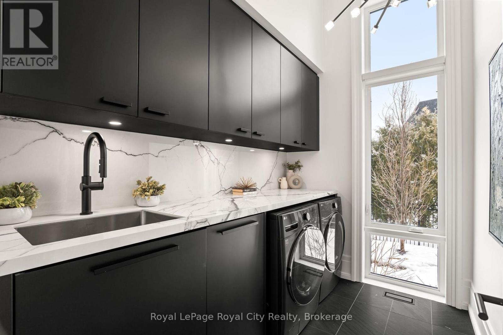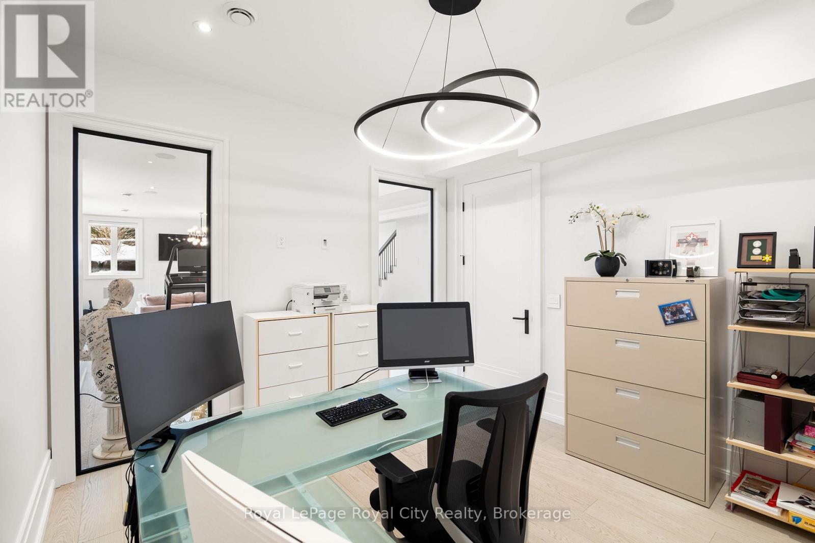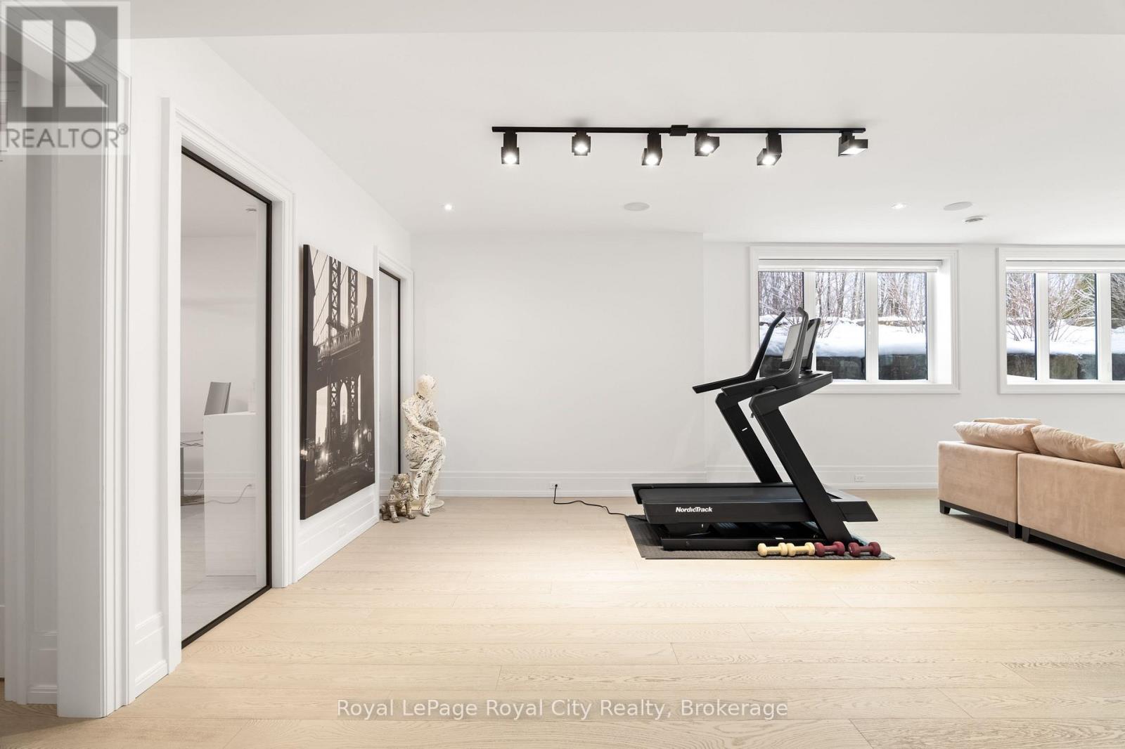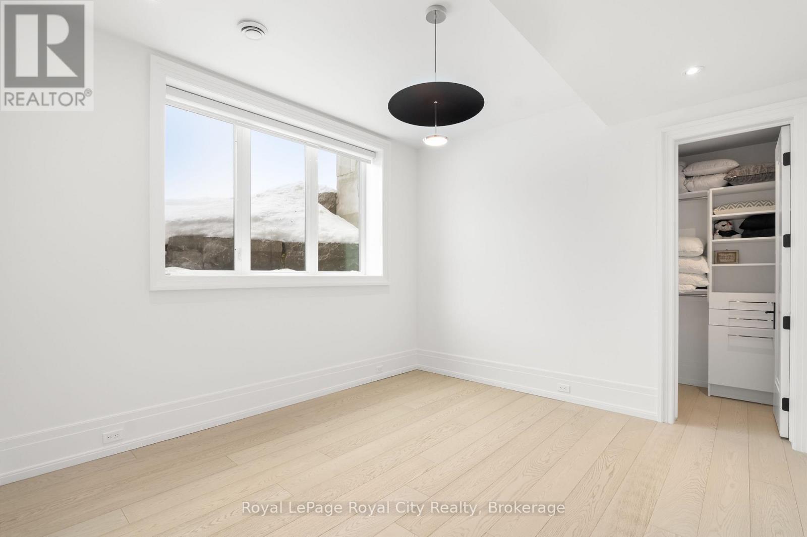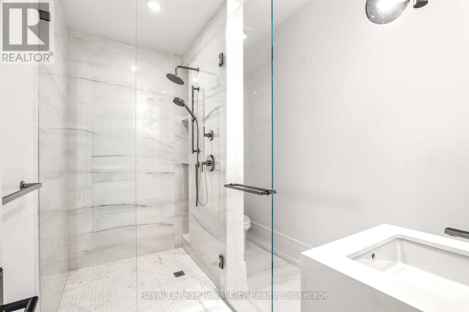 Welcome to life inside Heritage Lake Estates - a private, gated enclave in Puslinch known for its mature surroundings and beautiful custom homes. Set on a premium half-acre pie-shaped lot backing onto mature treelines, this custom stone bungalow offers privacy without compromise. With 2,252 square feet on the main floor and soaring 14-foot ceilings, the principal living space is defined by symmetry, scale, and natural light. A custom fireplace anchors the living room, while upgraded crown moulding and floor-to-ceiling windows create a refined yet inviting atmosphere.The kitchen and dining area are gallery-inspired in design, centred around a striking 21-foot stone waterfall island with seating for eight. Integrated cabinetry conceals premium WOLF appliances for a seamless aesthetic. Heated floors, custom lighting, and electric blinds reflect the many thoughtful upgrades woven throughout the home. Step outside to a covered back patio complete with built-in heaters and an impressive 350 sq ft gas fire feature, overlooking the fenced yard and tranquil forest backdrop - ideal for elevated, year-round outdoor living.The primary suite is a private retreat, offering 12ft ceilings, floor to ceiling windows, a generous walk-in closet and spa-inspired five-piece ensuite with Jet Spa shower system. Across from this, the well-appointed laundry room and additional main-floor bedroom, featuring with its own ensuite bath and walk-in closet, complete the main level. The fully finished lower level adds two bedrooms, each accompanied by an ensuite bathroom, a spacious recreation room with custom fireplace, dedicated office space, and a home gym - perfectly suited for growing families or multi-generational living. A functional mudroom with built-in cabinetry offers direct access to the heated three-car garage and walk-down access to the basement. 153 Heritage Lake Drive invites you to embrace a quiet kind of luxury, framed by the serenity of Puslinch Lake. (42204802)