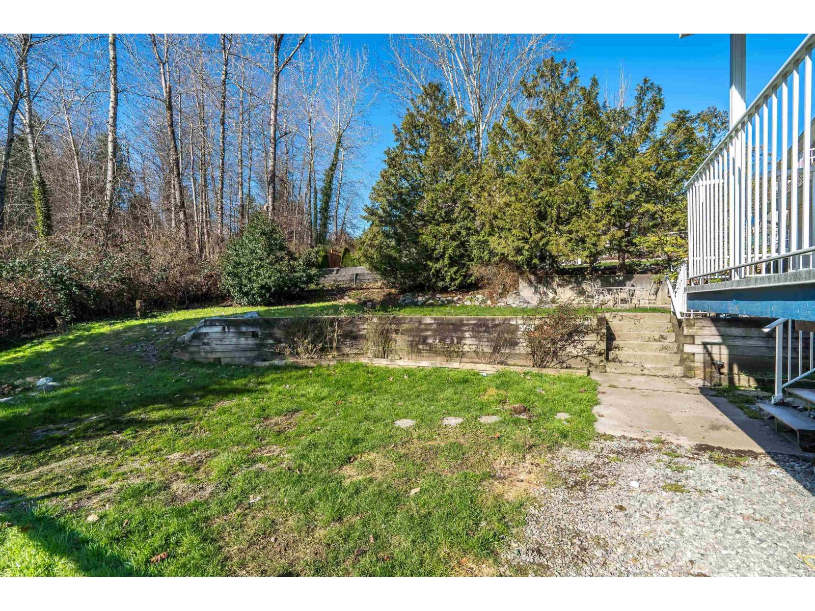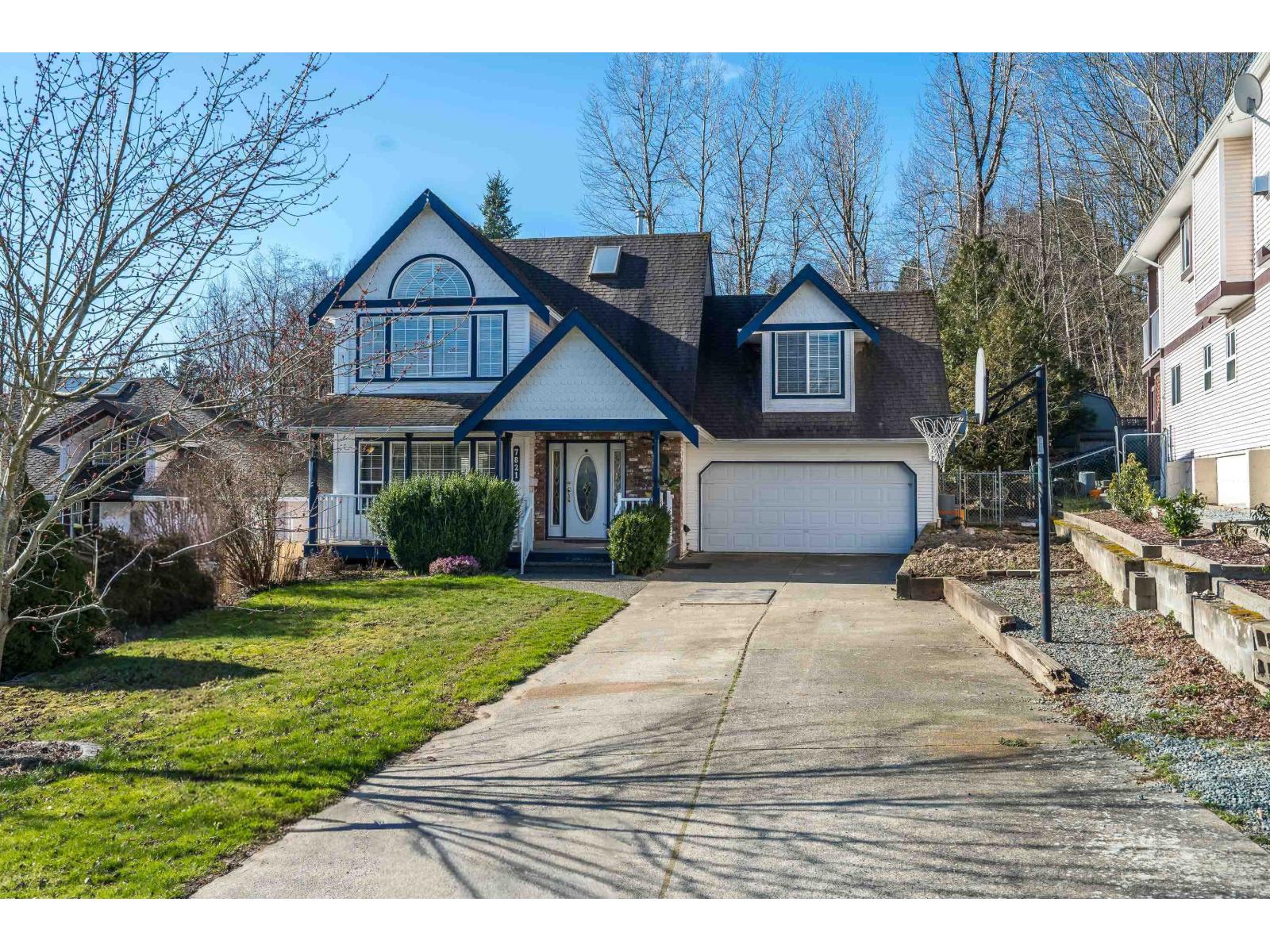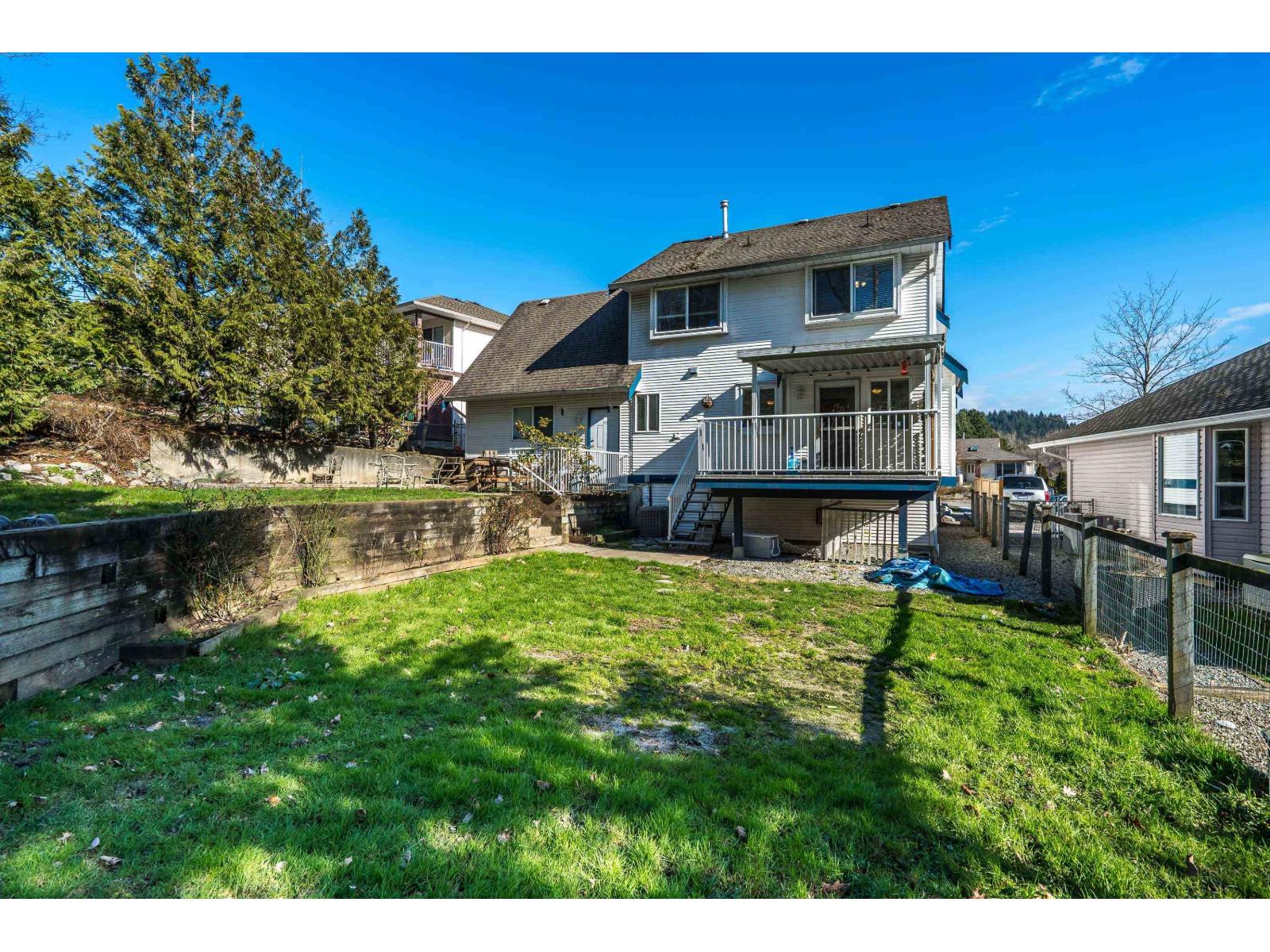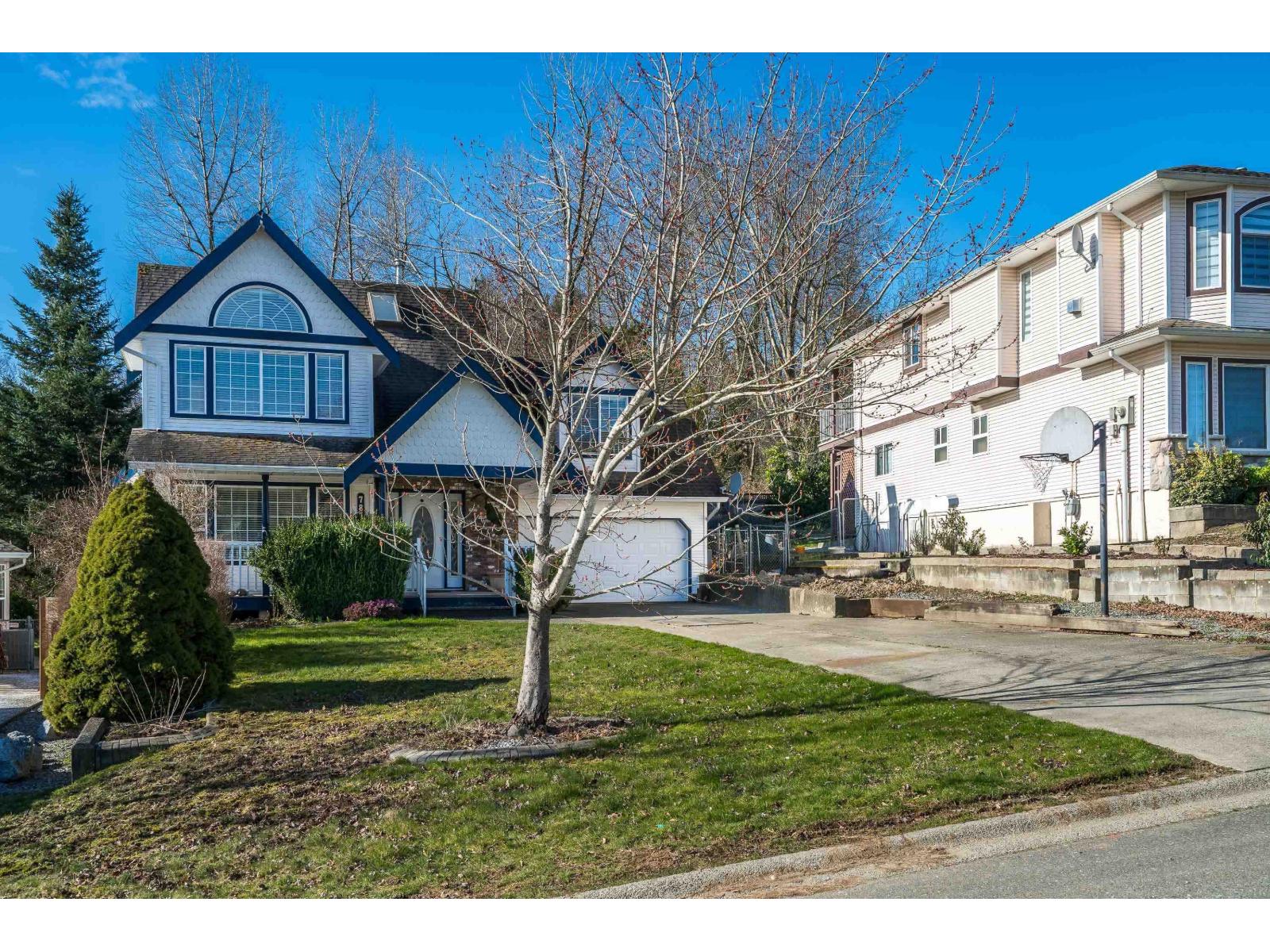 Prime College Heights! Tucked on a quiet cul-de-sac, this spacious family home sits on a large private lot with a treed backyard, extra-long driveway and big covered sundeck overlooking the yard. A charming covered veranda welcomes you in. Hardwood floors, bright living room with gas fireplace behind French doors and a functional kitchen anchor the main floor. Upstairs features 3 bedrooms plus a large games room over the garage (easy 4th), including a primary with ensuite. Basement offers a bedroom, family room and full bathroom. Walk to daycare, all levels of schools, UFV, French immersion, parks, gyms, coffee, restaurants & West Coast Express. Incredible opportunity to build equity in an unbeatable location. OPEN HOUSE SATURDAY FEBRUARY 28TH BETWEEN 1PM AND 3PM (32483774)