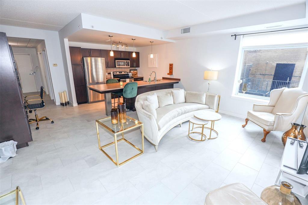 9A//Winnipeg/Showings and offers start Monday, March 2. Welcome to easy, urban living in the heart of the Exchange District. This bright corner unit offers 767 sq ft of stylish, move-in-ready space, thoughtfully updated with new laminate flooring, fresh paint, and an updated washroom.The open layout features in-suite laundry and large windows that bring in beautiful natural light throughout the day. Step outside to an oversized balcony overlooking the inner courtyard, a calm, private spot to unwind while still being right in the middle of it all.Residents enjoy access to a fitness centre, rooftop patio, and party room, along with secure entry, elevator access, and pet-friendly living. Heated underground parking and a storage locker add everyday convenience.Just steps from The Forks, river trails, cafes, restaurants, and downtown amenities, this is the perfect home base for young professionals looking to live where Winnipeg s culture, food, and energy meet. (231996549)