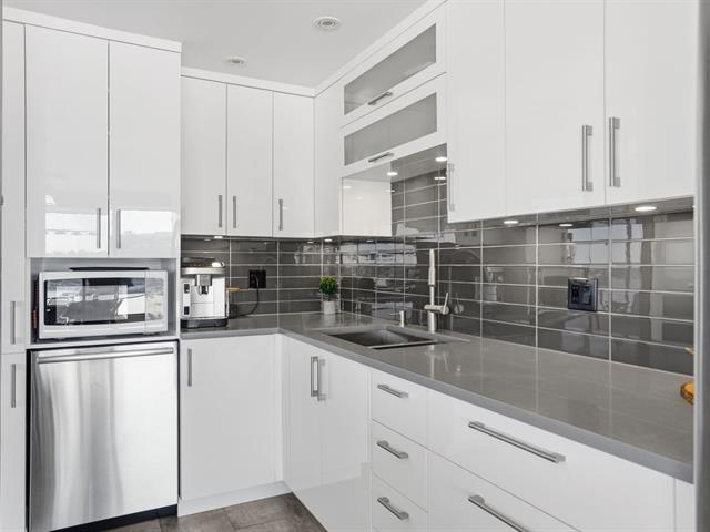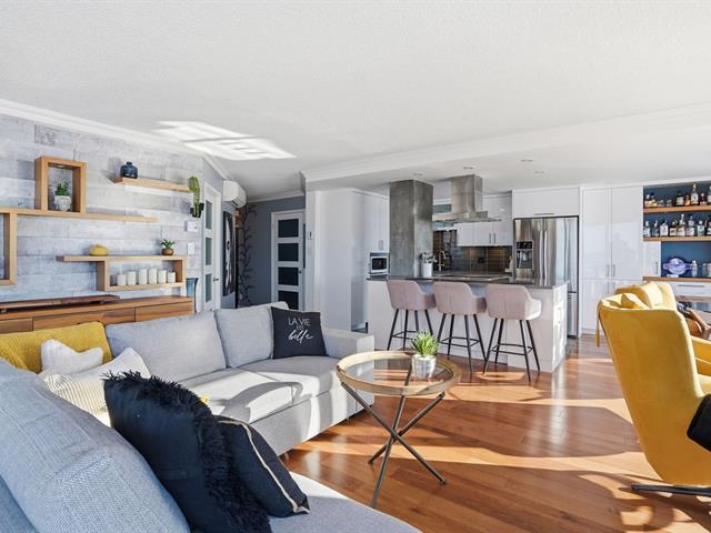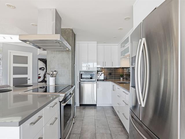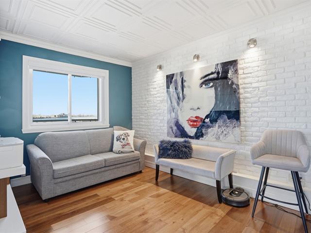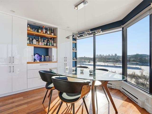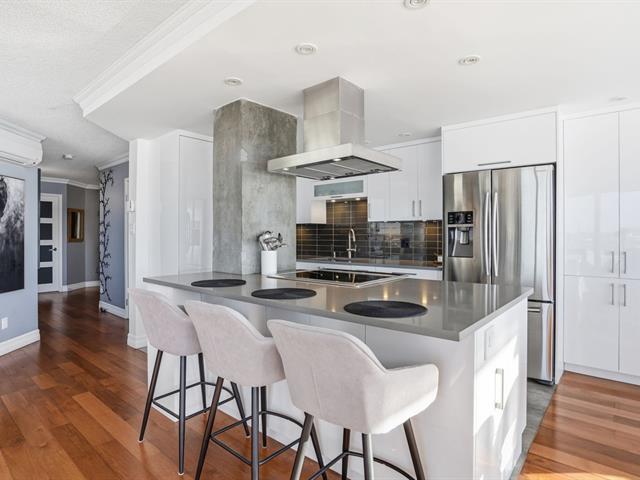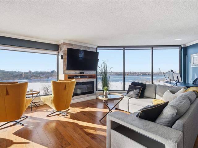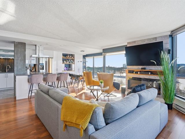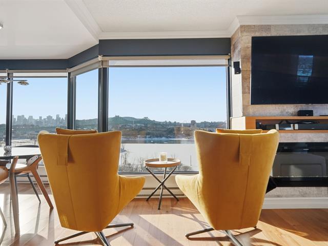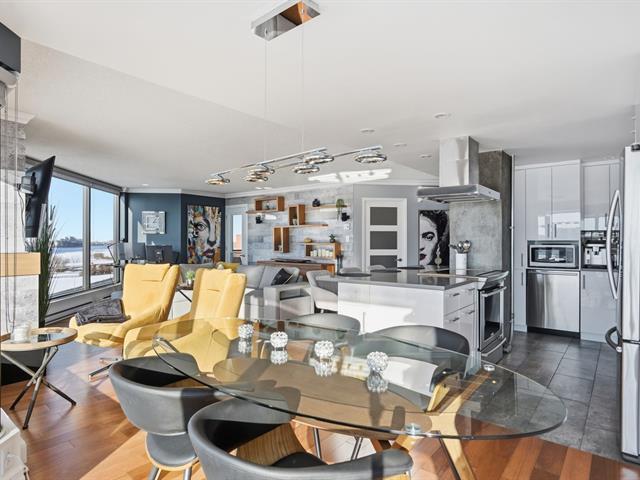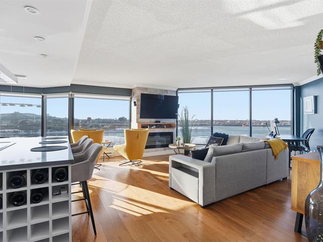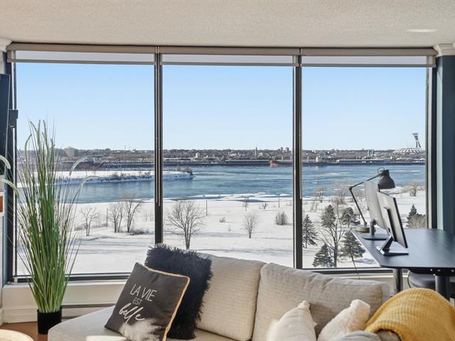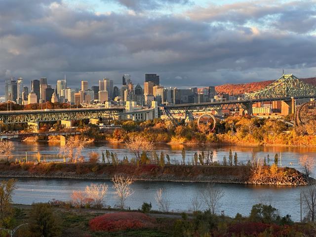 Stunning, must-see condo offering a MAGNIFICENT view of the St. Lawrence River, the Jacques-Cartier Bridge, La Ronde and the Old Port. Fully renovated and flooded with natural light, this unit boasts exceptional panoramic views from everywhere -- the kitchen, dining room, living room, or home office. Features 2 bedrooms, 1 bathroom, 2 garage parking spaces and 2 storage units. Building amenities include a gym, indoor pool with spa, outdoor pool and sauna. Living area of 1,190 sq. ft. Direct indoor access to the metro. Prime and highly sought-after location. (46633754)