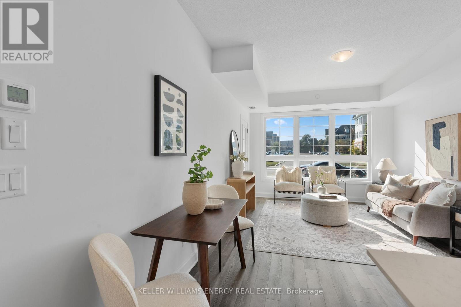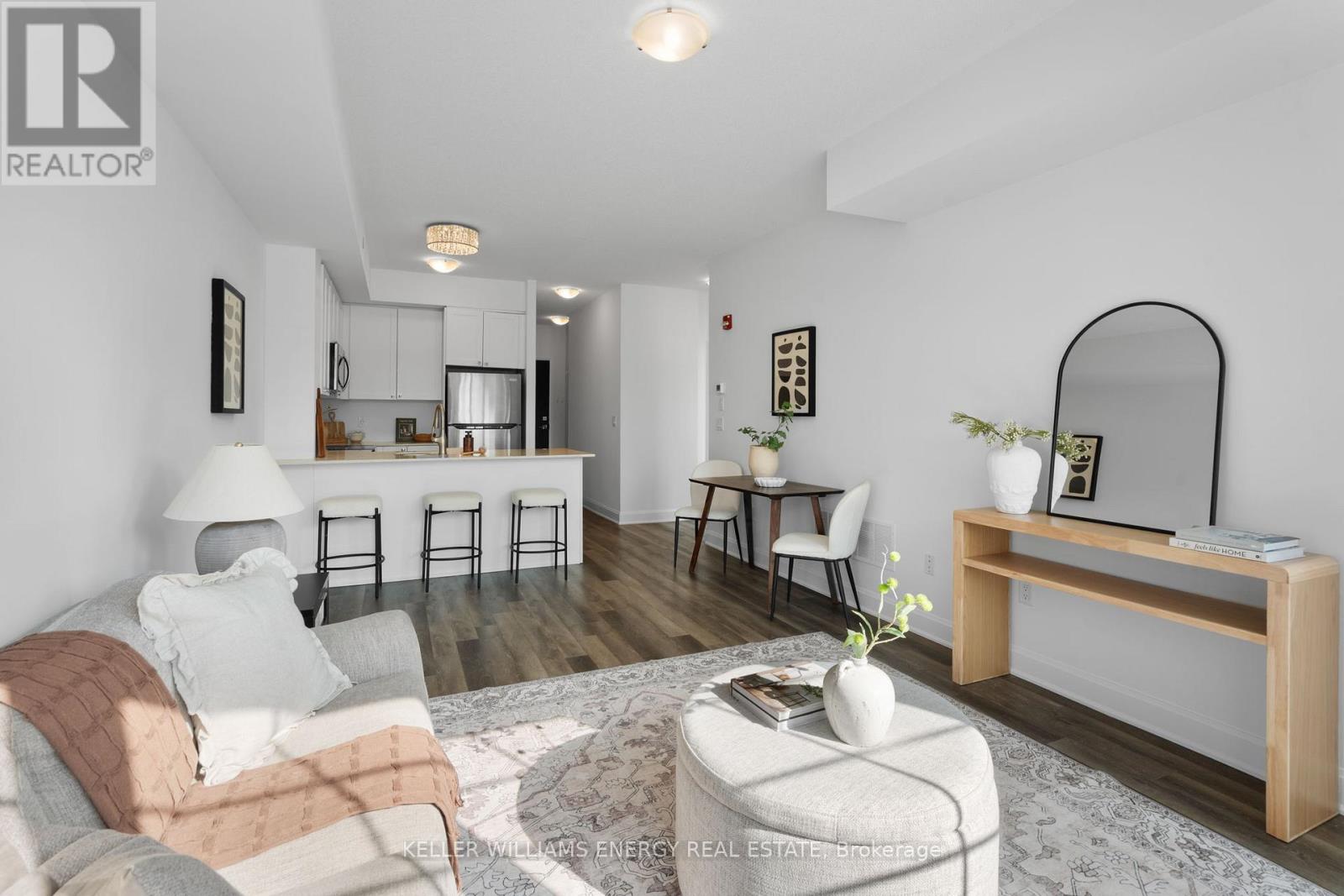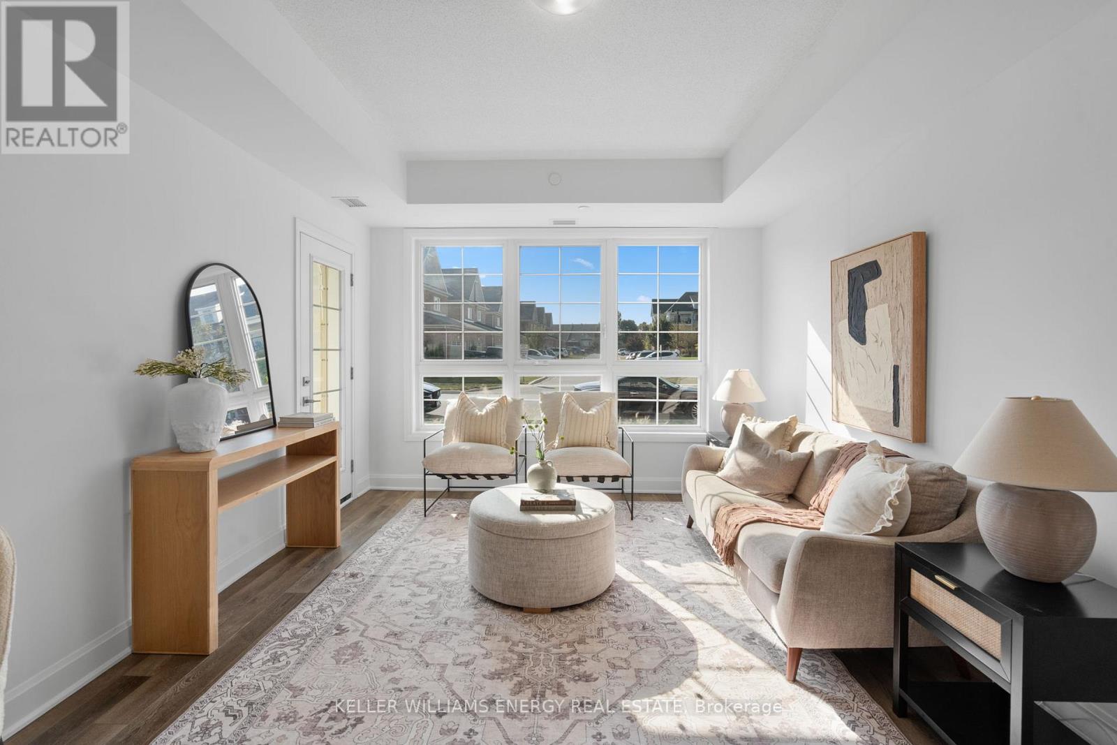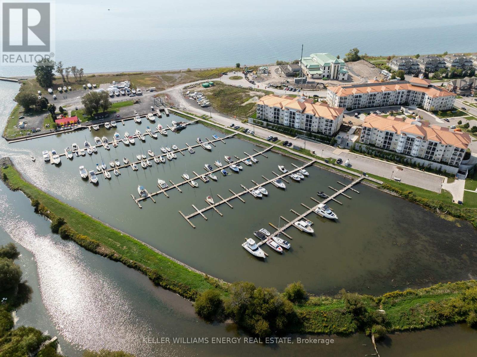 Welcome to this beautifully appointed main-floor 2-bedroom, 2-bathroom condo, ideally situated just steps from the shoreline and conveniently close to the elevators. Enjoy breathtaking views of Lake Ontario from your private terrace-an ideal spot to enjoy morning coffee or relax while taking in stunning sunset views. Inside, the spacious open-concept layout is enhanced by modern finishes throughout. The gourmet kitchen features quartz countertops, ample cabinetry, and a convenient breakfast bar, perfect for everyday living and entertaining. The bright living and dining area seamlessly extends to the terrace, filling the space with natural light. The primary bedroom offers a tranquil retreat, complete with a large closet and a luxurious 4-piece ensuite with contemporary fixtures. A generously sized second bedroom and an additional full bathroom provide flexibility for guests, family, or a home office. Residents enjoy exclusive access to the Admiral Club, offering resort-style amenities including a fully equipped fitness centre, indoor pool, theatre room, library, and party room. Additional highlights include in-suite laundry, premium flooring, and easy access to all building amenities. Experience the convenience of main-floor living with no reliance on elevators, all within close proximity to walking trails, parks, shopping, and transit. Don't miss this opportunity to live in one of the area's most sought-after lakeside communities. (42209611)