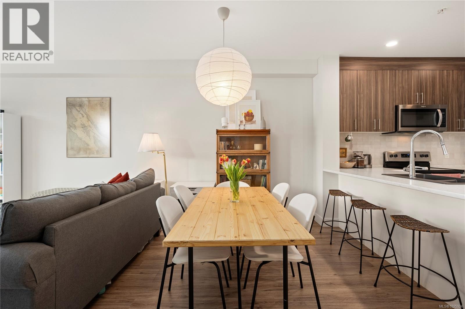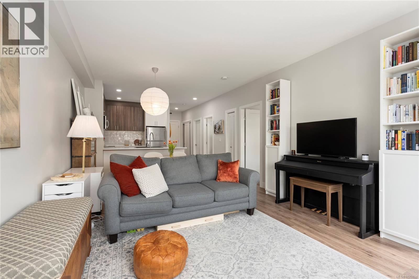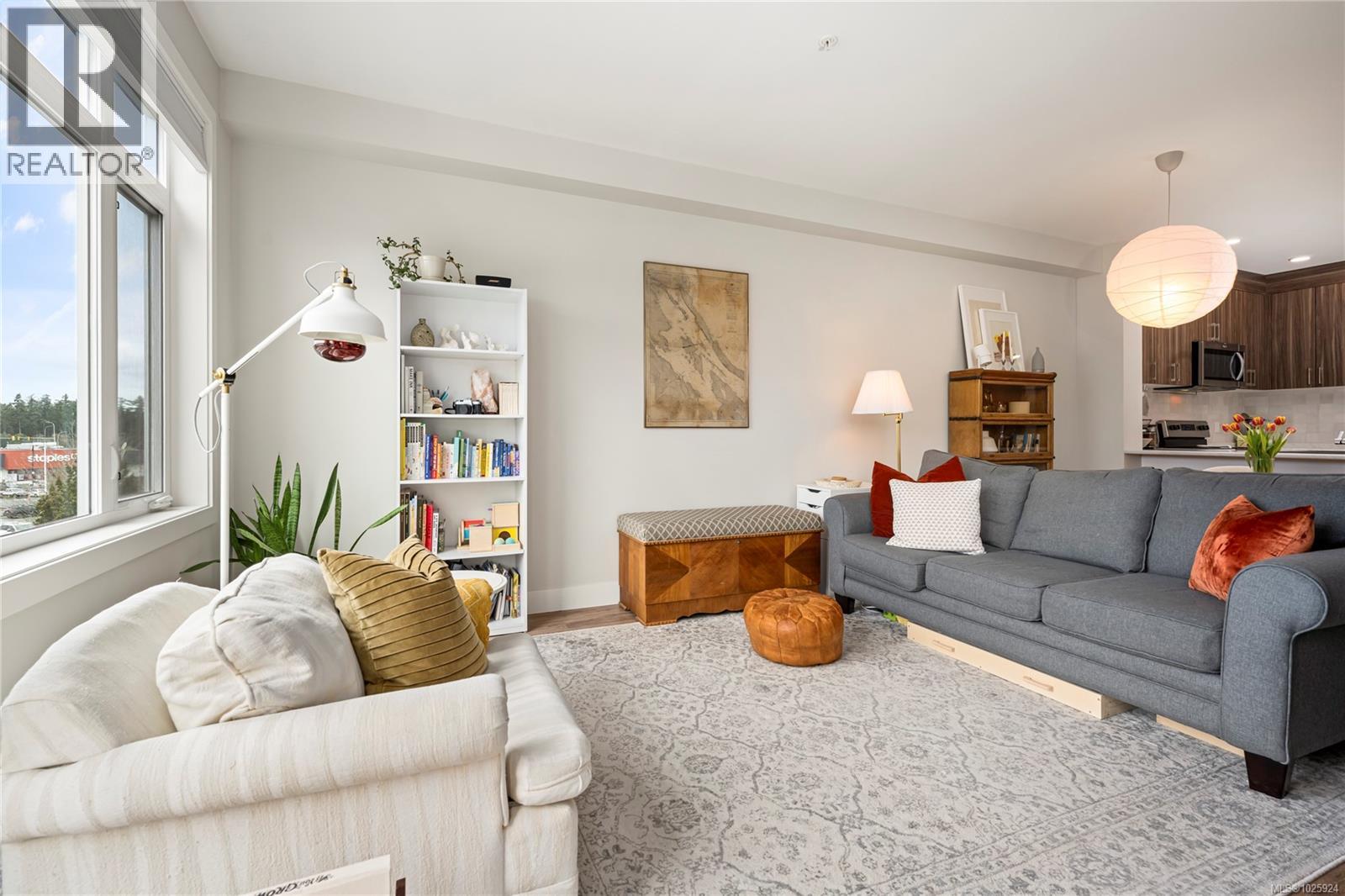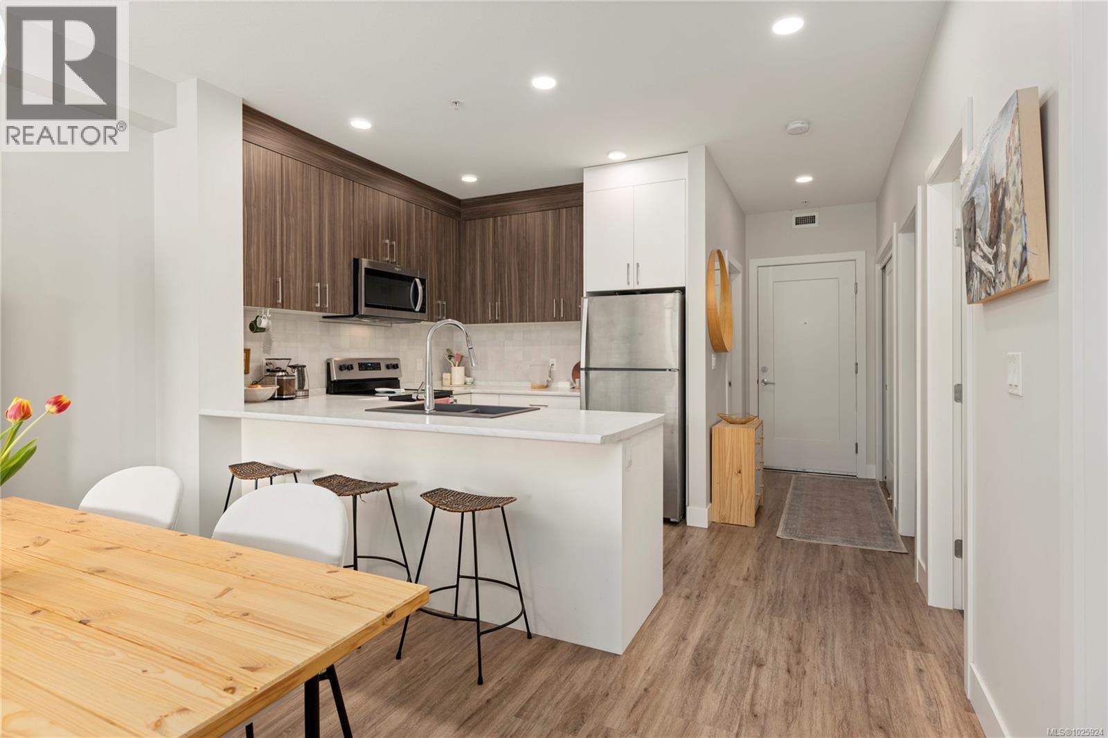 Open house March 1st 1:00 pm to 3:00 pm. Welcome to The Met—where modern design meets unbeatable convenience. This bright 1-bedroom plus den home offers 9-foot ceilings, a thoughtfully designed open floor plan, and beautiful finishes throughout. The south-facing layout fills the space with natural light, while the kitchen features stylish two-toned cabinetry, stainless steel appliances, and sleek details perfect for everyday living and entertaining. Located in a well-run building with low strata fees, this home is just blocks from Woodgrove Mall, Costco, Superstore, and more. Enjoy being only 10 minutes from scenic parks, trails, and outdoor escapes. A stylish, functional home in the heart of it all—perfect for first-time buyers, down sizers, or investors. All measurements are approximate; please verify if deemed important. (30419746)