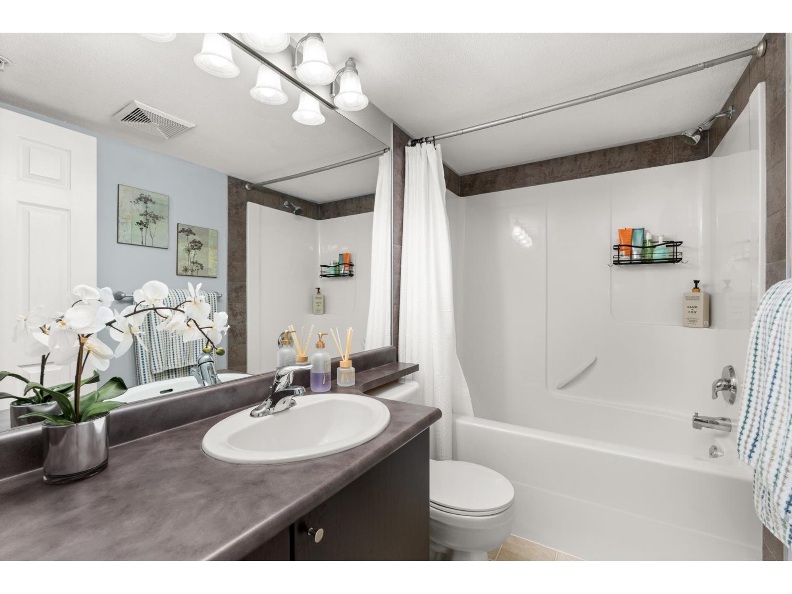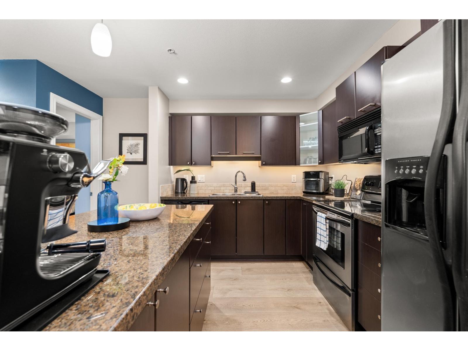 Welcome to Brydon Walk! This spacious 2 bed, 2 bath condo offers nearly 900 sq ft of bright, open-concept living in a quiet, private location on the courtyard side of the building. Enjoy vinyl plank flooring throughout, a functional kitchen with large central island, granite countertops, sit-up bar, and stainless steel appliances-perfect for everyday living and entertaining. The oversized primary bedroom easily fits a king-size bed and features a walk-in closet and ensuite. Rare dedicated laundry room with built-in shelving and upgraded Samsung washer/dryer provides abundant storage. One secured parking stall and lots of visitor parking. Professionally managed building with a new roof. Steps to Brydon Park, lagoon, trails, shopping, and the future SkyTrain. Book your private tour today! (32487079)