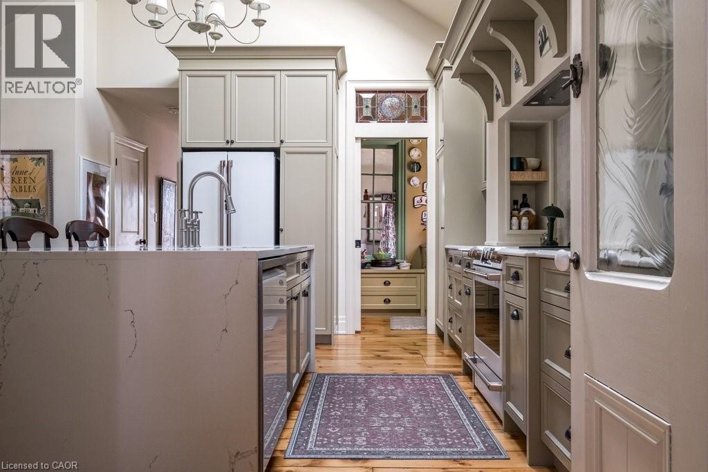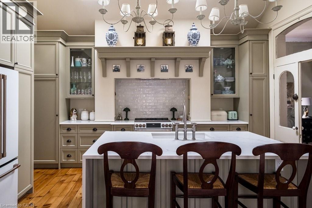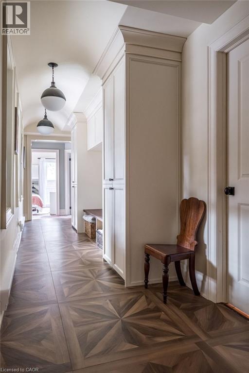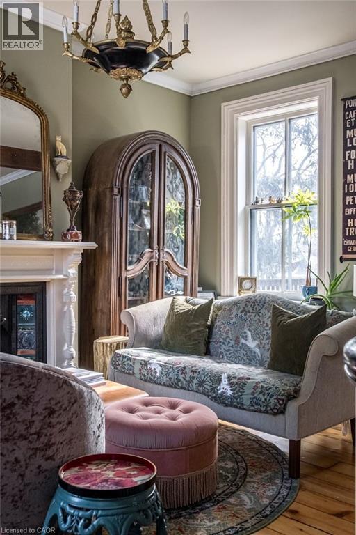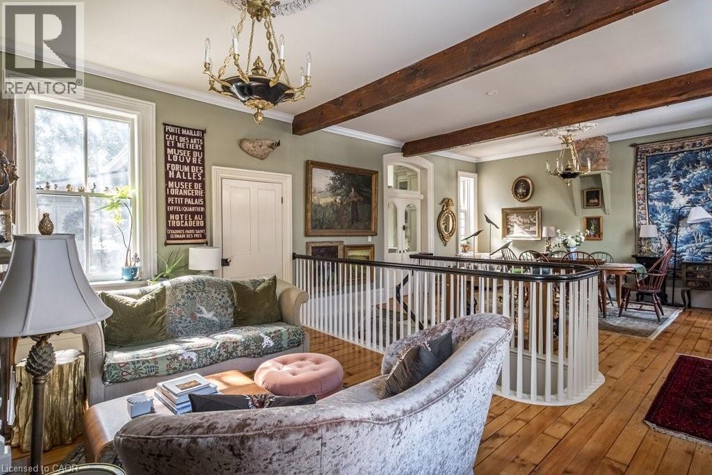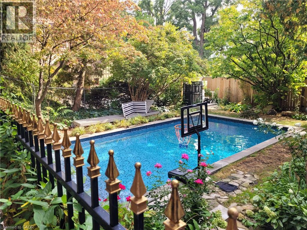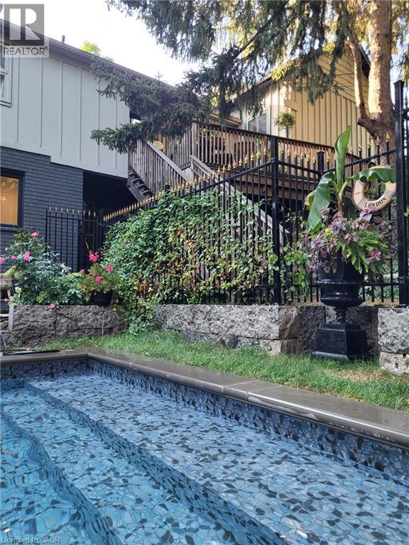 Dundas Dream. This circa 1880 character cottage, located in the heart of the Cross-Melville heritage district, is walkable to everything. Storybook curb appeal with beautiful perennial landscaping is unassuming from street level with a two full stories in the rear. Private forest on a 72' double wide lot, featuring a sunken garden and inground, heated saltwater pool surrounded by lush ferns, hostas, peonies, rose buses, hydrangeas and Japanese grasses. This tardis of a home is much larger than it appears with over 2,500 sqft of finished living space. Professionally renovated to the studs in 2023 to reimage the layout and living space. New HVAC, wiring, footings, support beams - everything! Unique reverse bungalow layout with main level living and lower garden level bedrooms, all above grade. 4 beds and 4 baths (2 half). The primary has jack and jill 5-piece bath access and a large WIC. One bedroom has custom built-ins with a closet and desk. The remaining two bedrooms share a walk in closet in their own wing. Additional storage via a large custom hallway built-in featuring double closets and a bench with hooks. There's even secret storage under the newly constructed, heritage style, staircase. This home is not to be missed. Loads of charm and character from rustic pine plank floors, salvaged brick floors from the old Grafton building, antique mantel with ornate cast iron insert, beamed ceilings, matching regency chandeliers imported from Chicago, and so much more. Brand new kitchen with quartz countertops, 14ft vaulted ceilings, walk-in pantry with bar sink, and garden doors to a private, forested deck. Main-level family room has a gas line ready fireplace and access to a beautiful 5-piece bath with full glass shower and standalone tub. Separate area for future built-ins. Could easily be converted to a second/alt primary. (70200472)