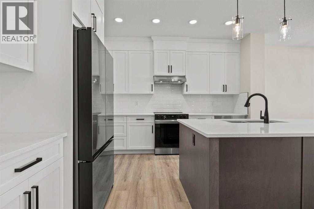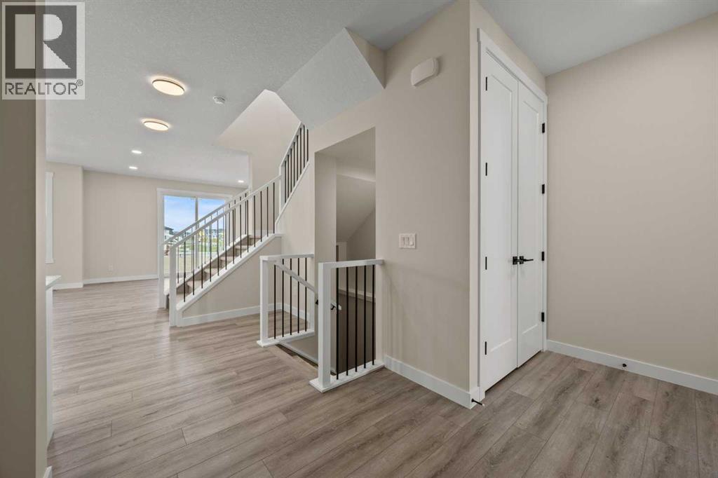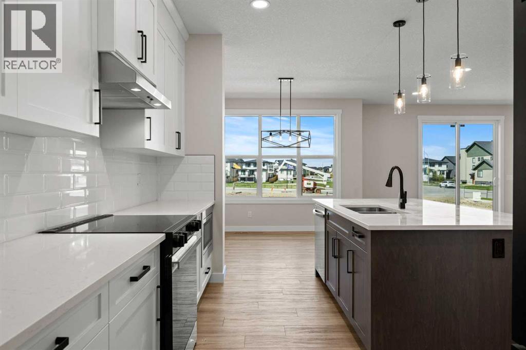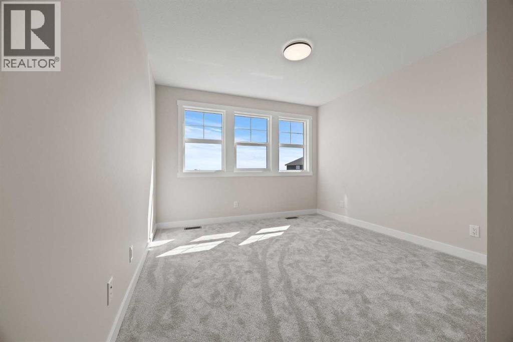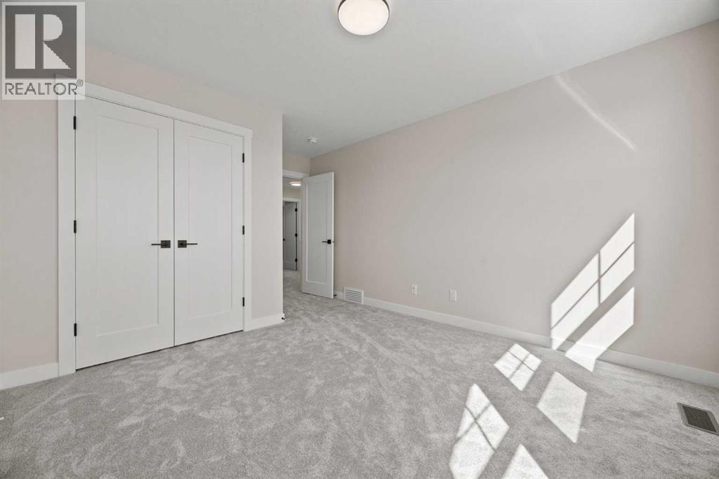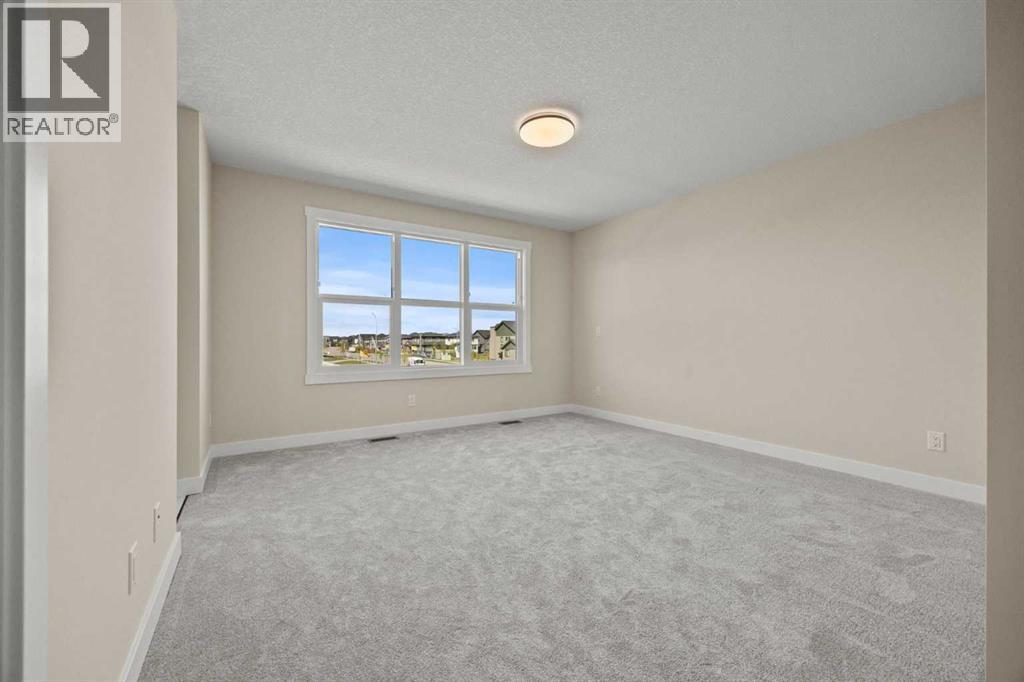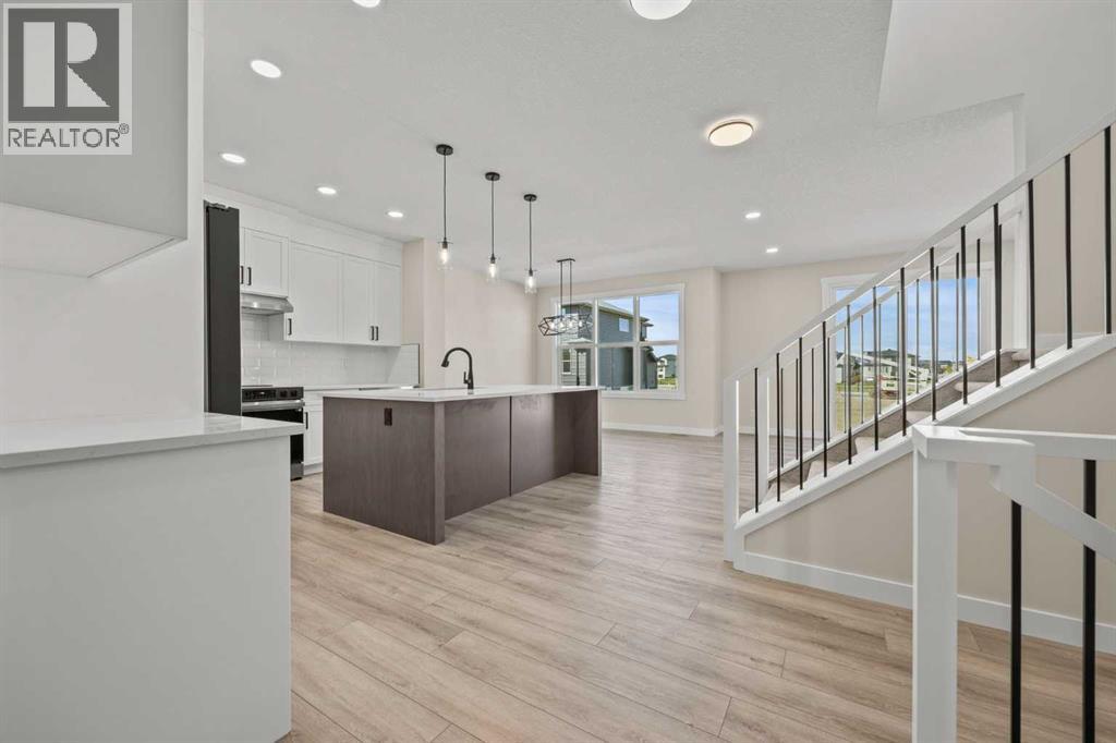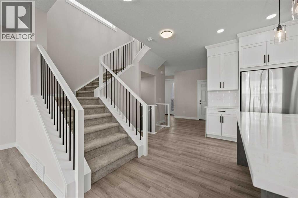 Welcome to 462 Kinniburgh Loop—an elegantly designed 1,840 sq. ft. duplex in the highly sought-after community of Kinniburgh South, Chestermere. Built by award-winning luxury builder Golden Homes, this residence blends modern living, functionality, and timeless design—all just minutes from schools, everyday amenities, and Lake Chestermere.The main floor features an inviting open-concept layout with soaring 9’ ceilings and 8’ doors, creating a spacious and grand feel. As you enter, you’re welcomed by a large 8’ front door with a built-in glass window, setting the tone for the luxury inside. The front of the home includes a convenient half bath, access to your basement, and beautifully finished stairs leading down to the undeveloped basement. This home also includes a side entrance for added flexibility.At the heart of the home is a chef-inspired kitchen boasting a striking two-tone cabinet design, quartz countertops, a large island with breakfast bar seating, ceiling-height painted cabinetry, and sleek stainless-steel appliances. Oversized triple-pane windows flood the living and dining areas with natural light, creating a bright, warm space that’s perfect for entertaining, relaxing, and everyday living. The living room is completed with an electric fireplace featuring multiple color settings and heat modes, adding both style and comfort.Upstairs, the oversized grand staircase with white railings and matte black iron spindles leads you to the luxurious primary bedroom. This bedroom offers a spa-like 5-piece ensuite with a freestanding tub, fully tiled walk-in shower, dual vanities, and an enclosed toilet. The primary bedroom also includes a custom walk-in closet with built-in shelving and organizers, plus stunning sunrise views to start your mornings. Two additional spacious bedrooms and a full bathroom provide plenty of room for family, while the tiled laundry room—complete with a quartz countertop for folding and storage—adds everyday convenience.Premium featur es throughout include an oversized 20’x22’ garage, upgraded spindle railings, MDF shelving, matte black fixtures and hardware, high-efficiency triple-pane windows for energy savings, and an enhanced party wall for superior soundproofing. Golden Homes’ signature quality and craftsmanship are evident in every detail.The exterior will be fully landscaped, including grading, loam, sod to the side entrance, and a front yard tree—offering instant curb appeal and outdoor enjoyment. With its west-facing orientation, you’ll enjoy beautiful sunrises to begin the day and softer evening light to wind down. (31683181)