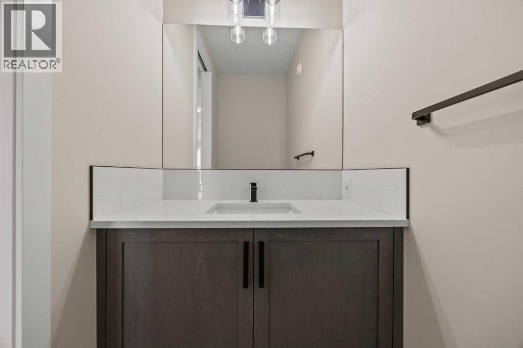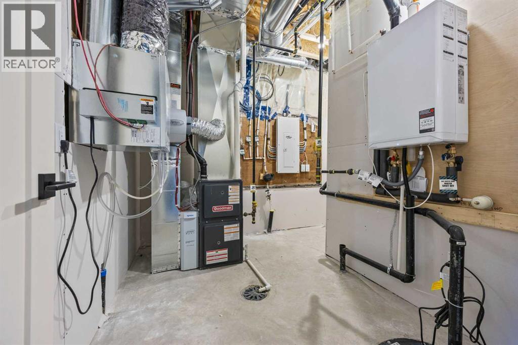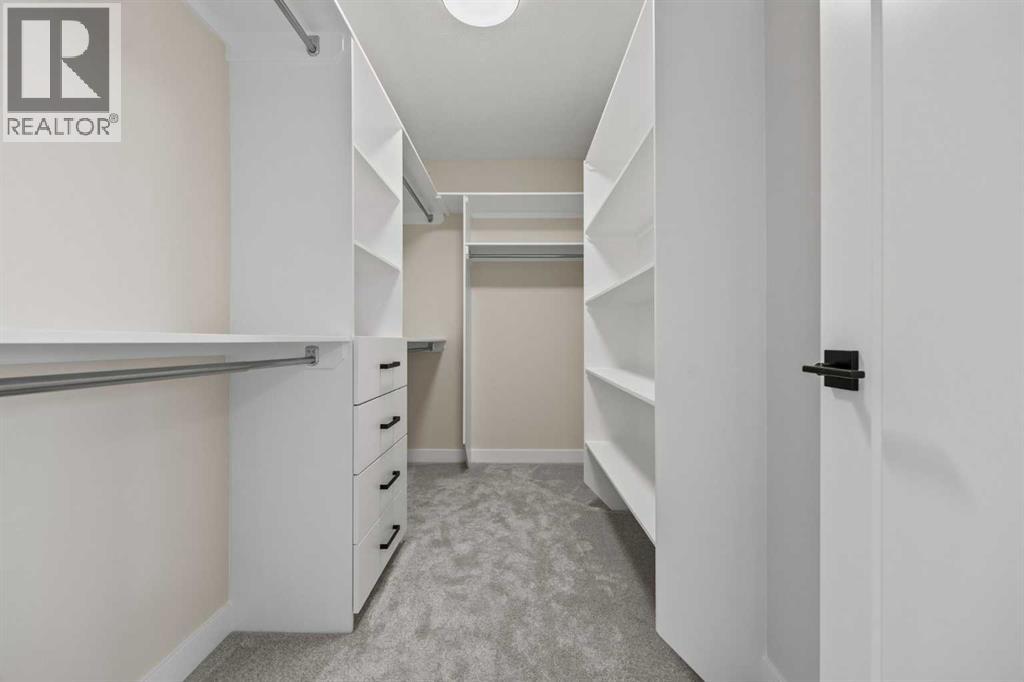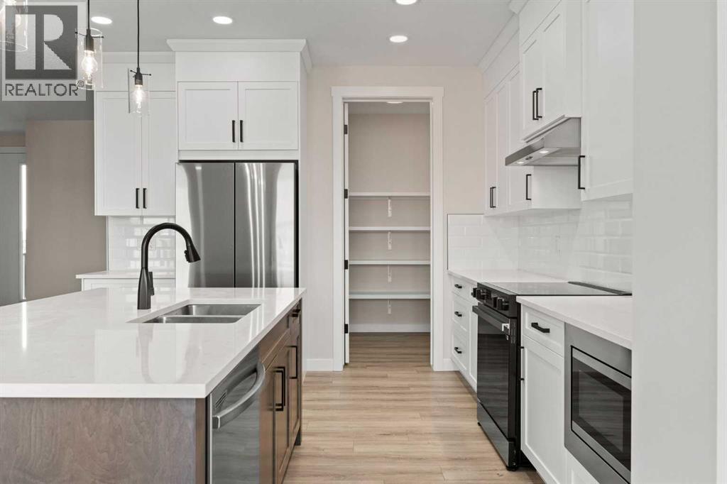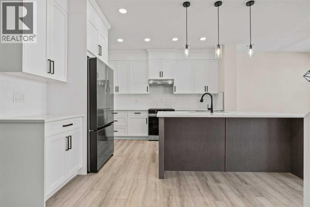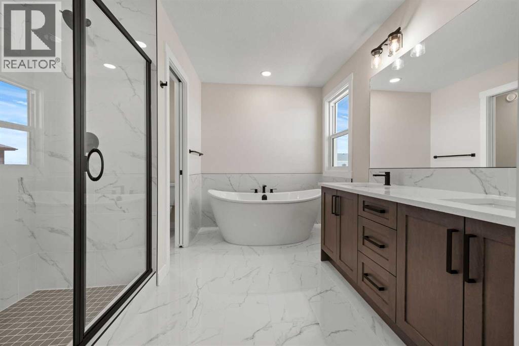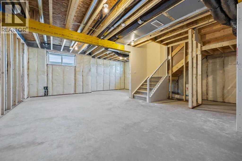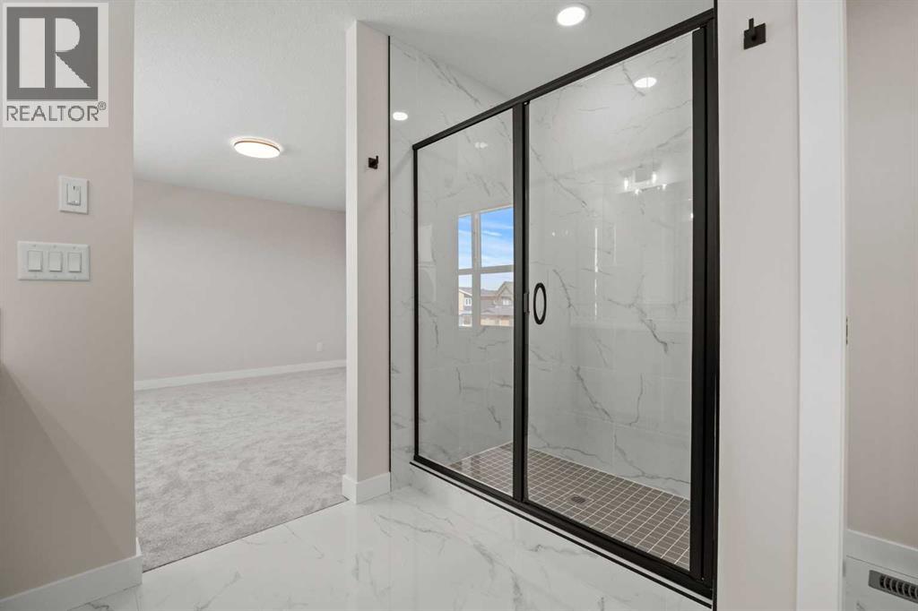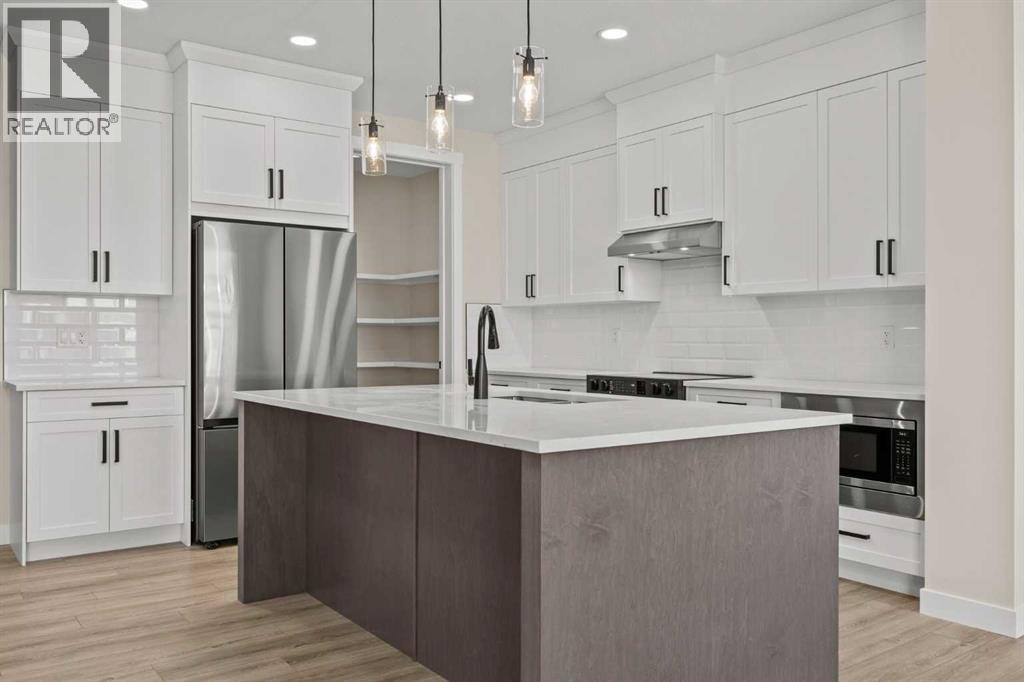 Welcome to 462 Kinniburgh Loop—an elegantly designed 1,840 sq. ft. duplex in the highly sought-after community of Kinniburgh South, Chestermere. Built by award-winning luxury builder Golden Homes, this residence blends modern living, functionality, and timeless design—all just minutes from schools, everyday amenities, and Lake Chestermere.The main floor features an inviting open-concept layout with soaring 9’ ceilings and 8’ doors, creating a spacious and grand feel. As you enter, you’re welcomed by a large 8’ front door with a built-in glass window, setting the tone for the luxury inside. The front of the home includes a convenient half bath, access to your basement, and beautifully finished stairs leading down to the undeveloped basement. This home also includes a side entrance for added flexibility.At the heart of the home is a chef-inspired kitchen boasting a striking two-tone cabinet design, quartz countertops, a large island with breakfast bar seating, ceiling-height painted cabinetry, and sleek stainless-steel appliances. Oversized triple-pane windows flood the living and dining areas with natural light, creating a bright, warm space that’s perfect for entertaining, relaxing, and everyday living. The living room is completed with an electric fireplace featuring multiple color settings and heat modes, adding both style and comfort.Upstairs, the oversized grand staircase with white railings and matte black iron spindles leads you to the luxurious primary bedroom. This bedroom offers a spa-like 5-piece ensuite with a freestanding tub, fully tiled walk-in shower, dual vanities, and an enclosed toilet. The primary bedroom also includes a custom walk-in closet with built-in shelving and organizers, plus stunning sunrise views to start your mornings. Two additional spacious bedrooms and a full bathroom provide plenty of room for family, while the tiled laundry room—complete with a quartz countertop for folding and storage—adds everyday convenience.Premium featur es throughout include an oversized 20’x22’ garage, upgraded spindle railings, MDF shelving, matte black fixtures and hardware, high-efficiency triple-pane windows for energy savings, and an enhanced party wall for superior soundproofing. Golden Homes’ signature quality and craftsmanship are evident in every detail.The exterior will be fully landscaped, including grading, loam, sod to the side entrance, and a front yard tree—offering instant curb appeal and outdoor enjoyment. With its west-facing orientation, you’ll enjoy beautiful sunrises to begin the day and softer evening light to wind down. (31683181)