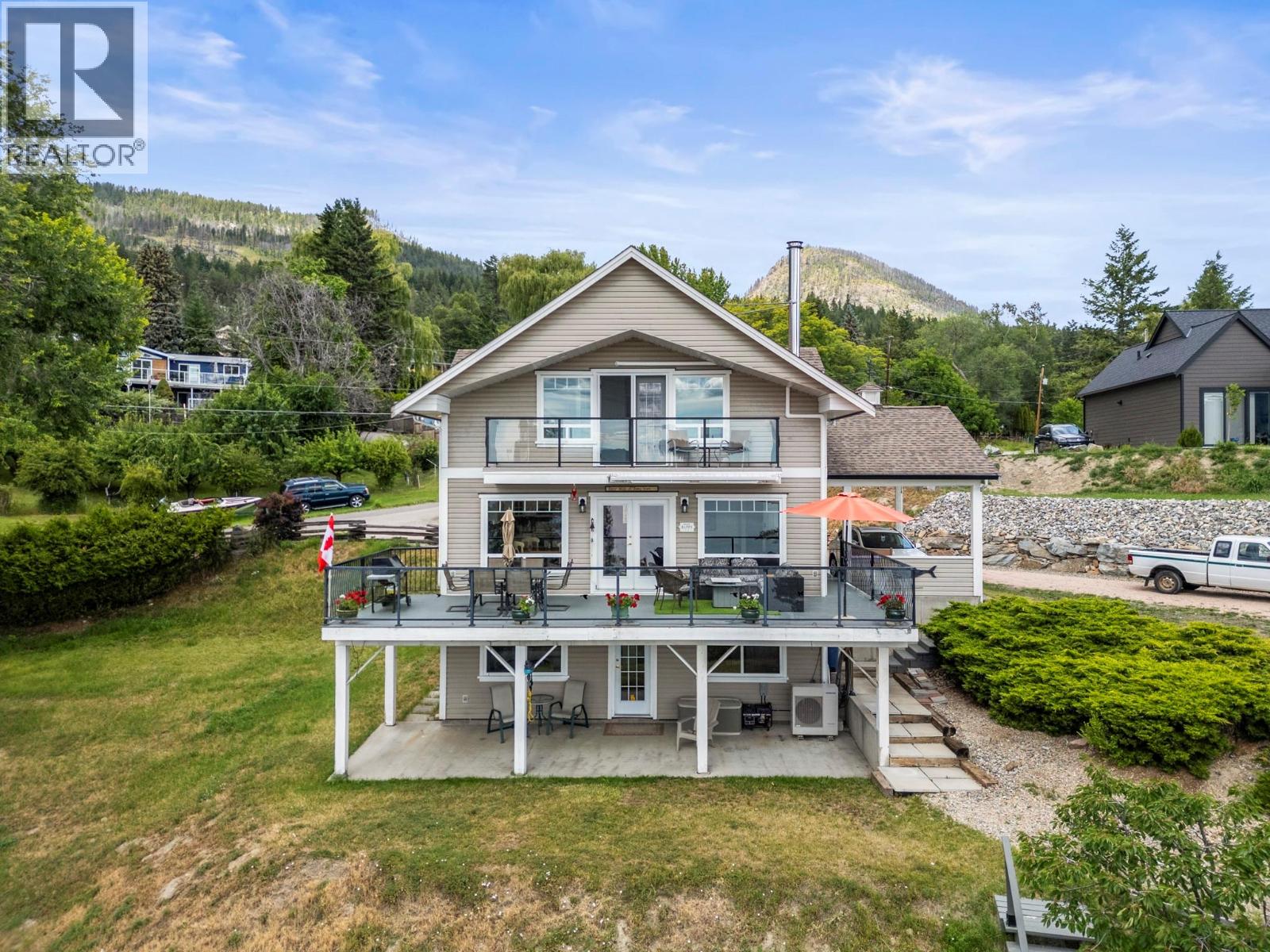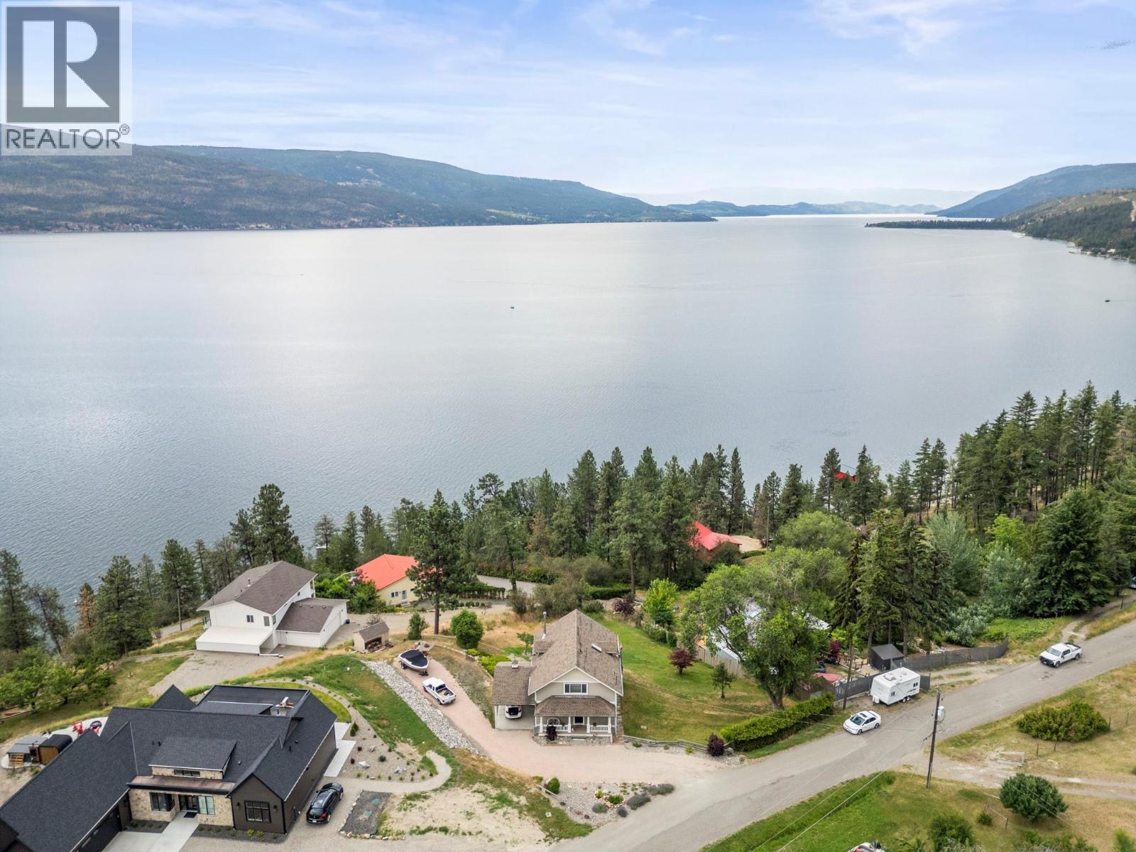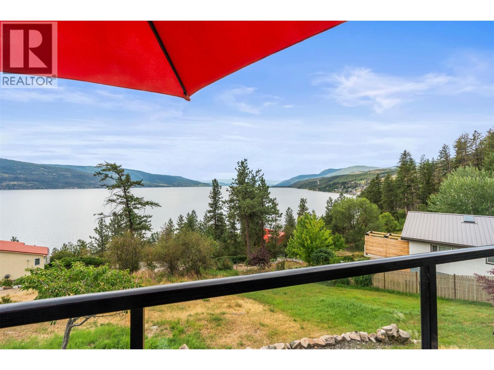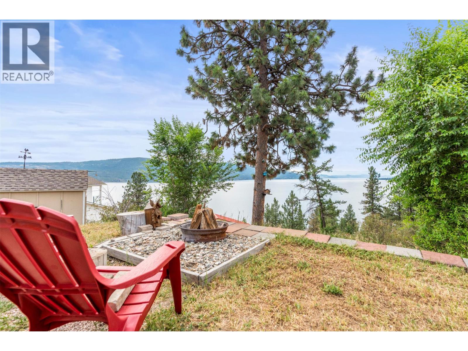 Welcome to your dream lakeview retreat! This well-maintained family home is perfectly perched to capture breathtaking expansive views of the lake from all three levels, with large south-facing windows and multiple decks to soak in the scenery. Whether you're sipping coffee on the upper balcony or enjoying a sunset by the fire pit, the views are truly unmatched. Inside, the layout is both functional and flexible. The main floor features an open-concept kitchen and dining area, seamlessly flowing into a cozy living room with a wood fireplace and walkout to a spacious deck. A full 3-piece bathroom and bedroom complete the main level. Upstairs, the oversized primary suite offers a true retreat with a sitting area, skylit 4-piece ensuite with soaker tub, and private balcony. A second bedroom with 2-piece ensuite is located across the hall. The fully finished walk-out lower level includes two additional bedrooms, a full bath, kitchen and laundry—ideal for an in-law suite or mortgage helper.Outside, enjoy ample parking including RV/boat space, a carport, mature fruit trees, a shed for garden tools, and a welcoming neighbourhood vibe. You’re just 5 minutes to the public beach and boat launch and only 10 minutes to Fintry Park. This is lake life at its best, flexible, scenic, and full of possibility. (39771792)