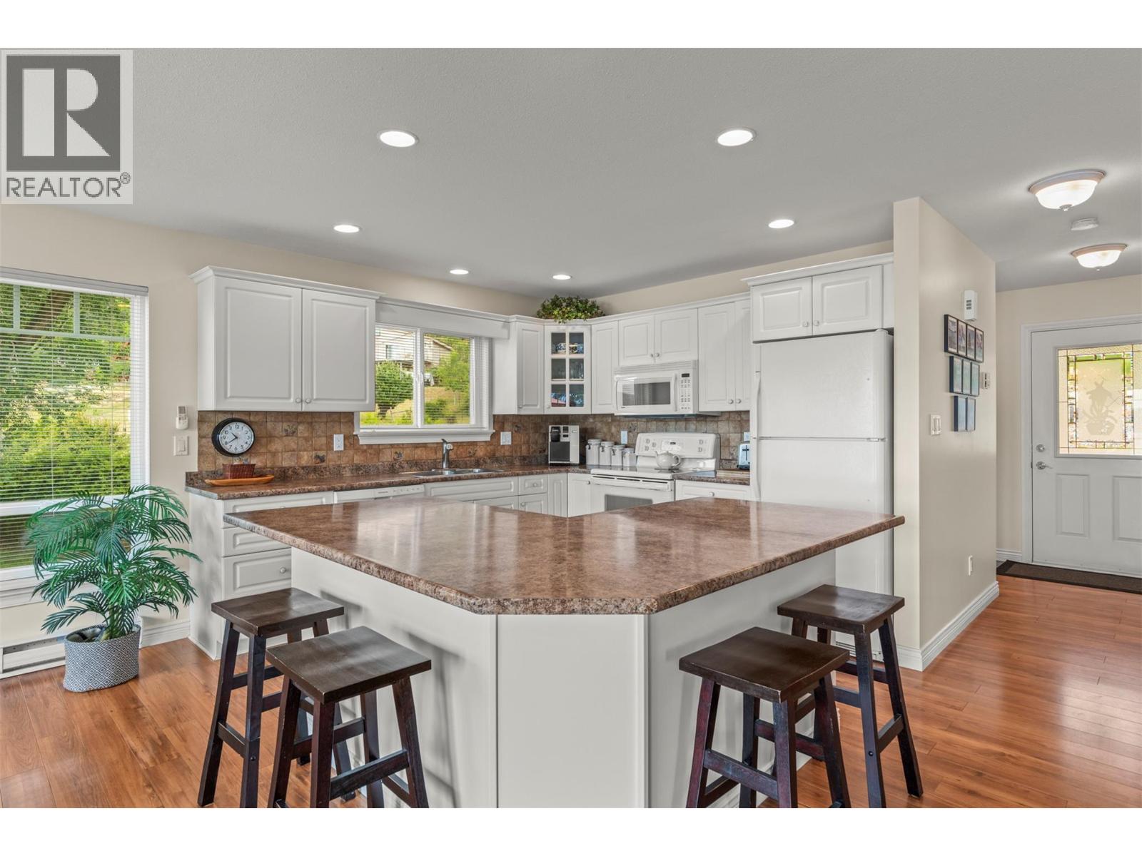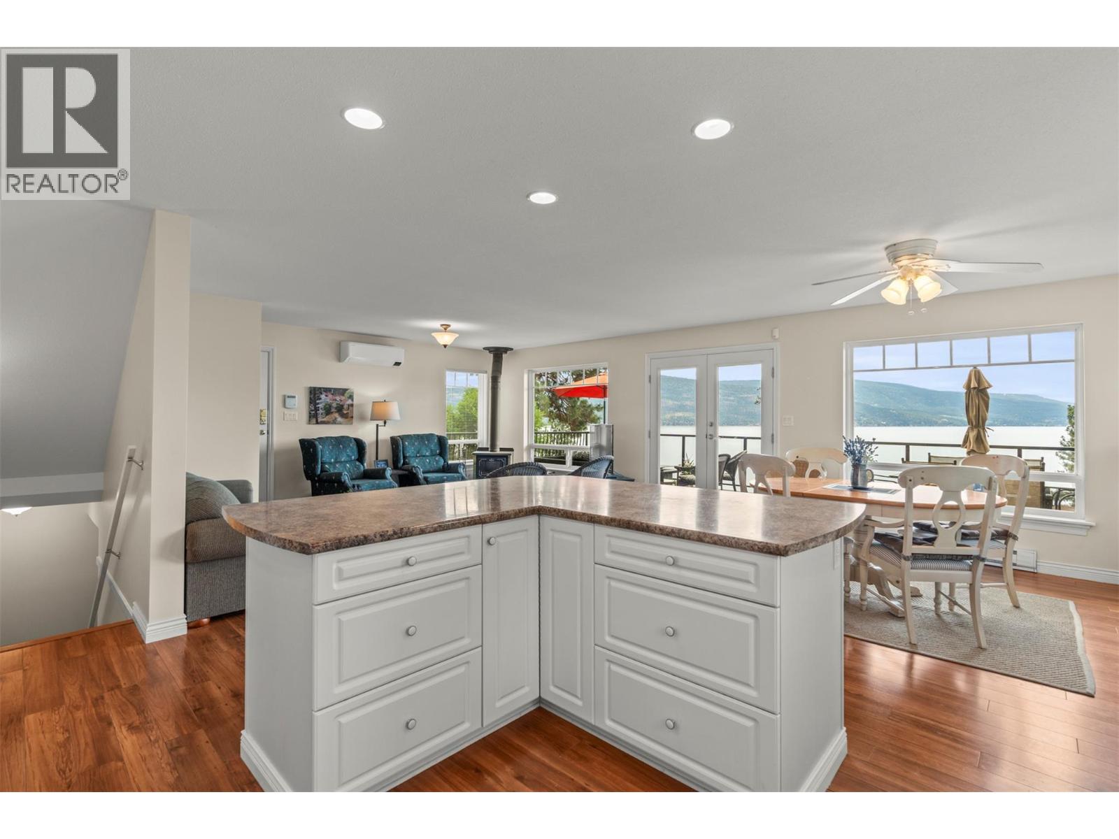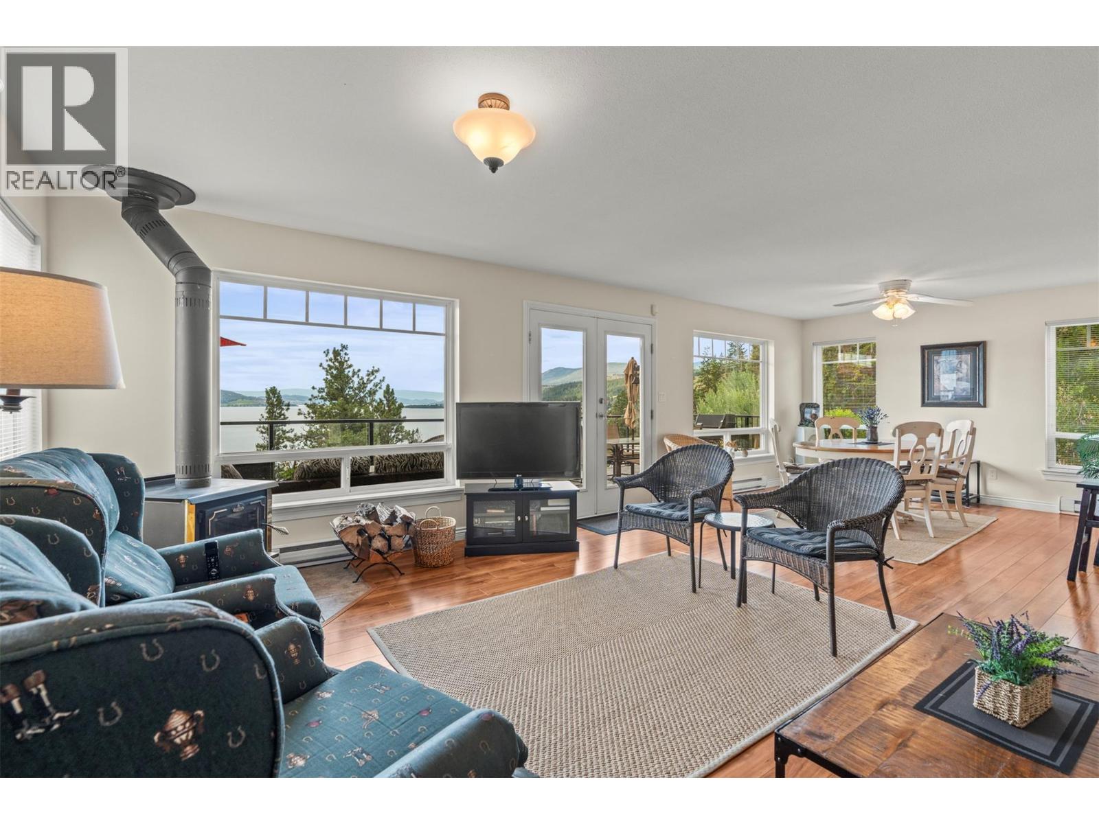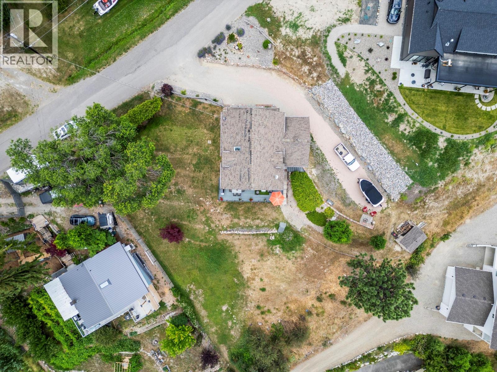 Welcome to your dream lakeview retreat! This well-maintained family home is perfectly perched to capture breathtaking expansive views of the lake from all three levels, with large south-facing windows and multiple decks to soak in the scenery. Whether you're sipping coffee on the upper balcony or enjoying a sunset by the fire pit, the views are truly unmatched. Inside, the layout is both functional and flexible. The main floor features an open-concept kitchen and dining area, seamlessly flowing into a cozy living room with a wood fireplace and walkout to a spacious deck. A full 3-piece bathroom and bedroom complete the main level. Upstairs, the oversized primary suite offers a true retreat with a sitting area, skylit 4-piece ensuite with soaker tub, and private balcony. A second bedroom with 2-piece ensuite is located across the hall. The fully finished walk-out lower level includes two additional bedrooms, a full bath, kitchen and laundry—ideal for an in-law suite or mortgage helper.Outside, enjoy ample parking including RV/boat space, a carport, mature fruit trees, a shed for garden tools, and a welcoming neighbourhood vibe. You’re just 5 minutes to the public beach and boat launch and only 10 minutes to Fintry Park. This is lake life at its best, flexible, scenic, and full of possibility. (39771792)